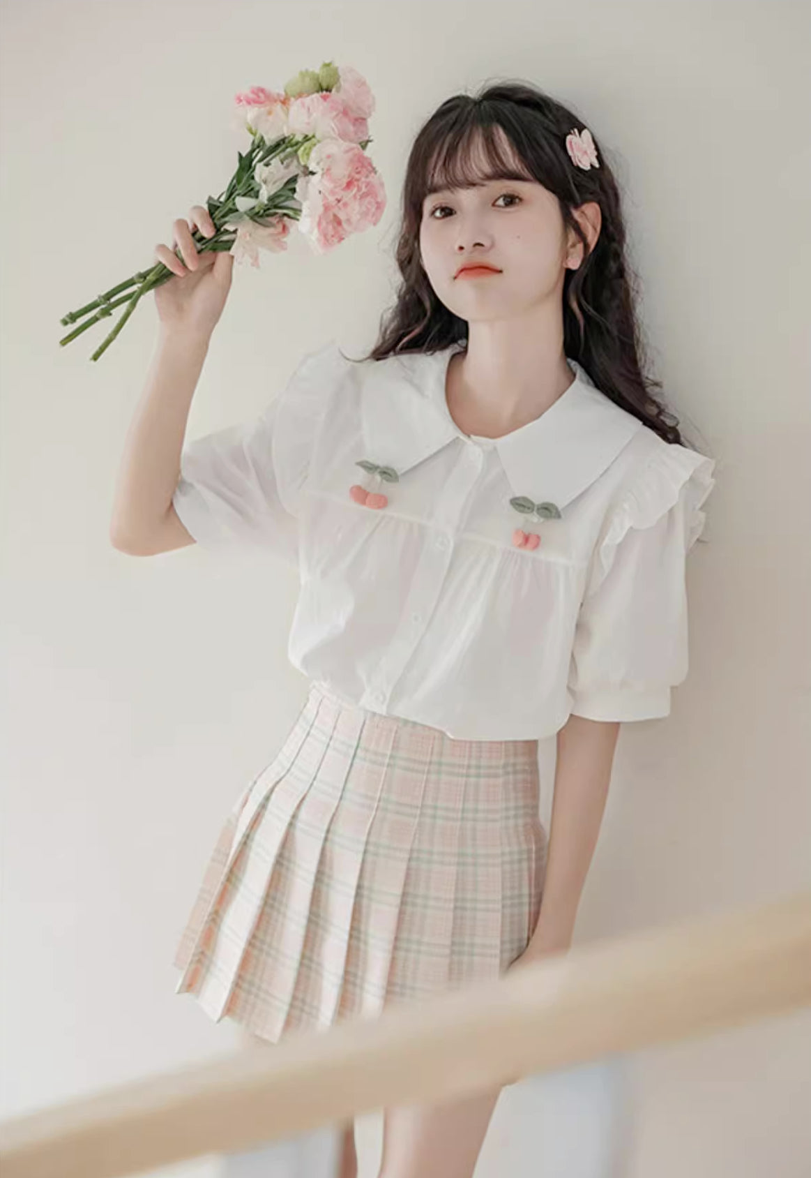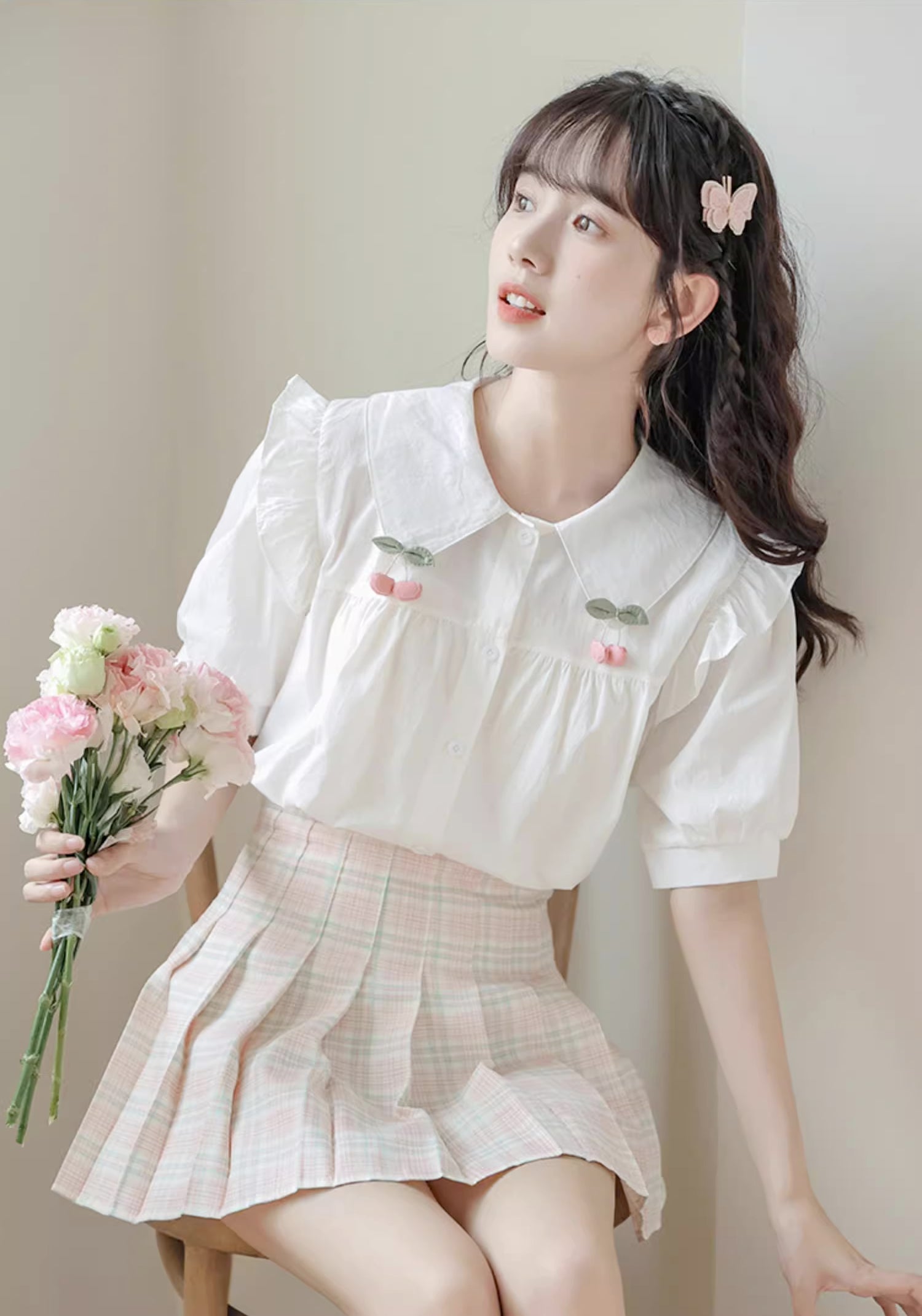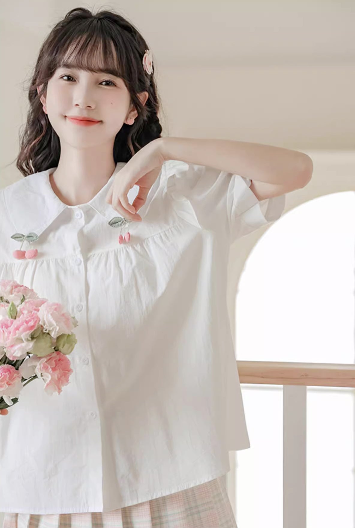 Button up shirt with a peter pan collar. short puff sleeves. frilly shoulders and pin-on cherries.