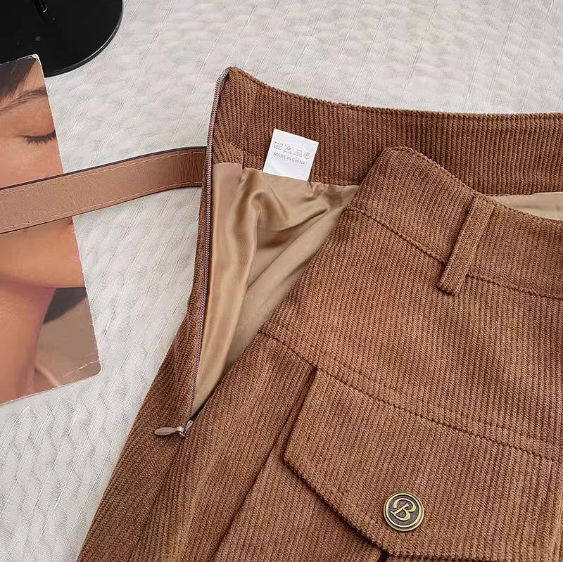 Pleated corduroy mini skirt with faux pockets. belt loops and a concealed side zipper. Lined with safety shorts. Belt included.
