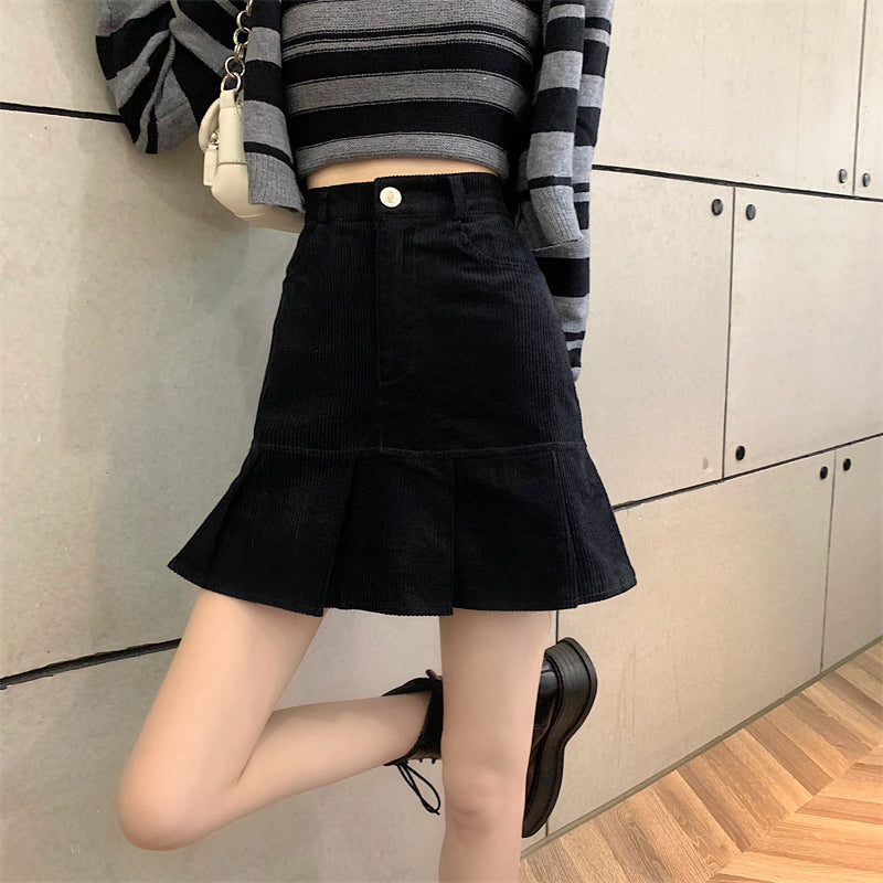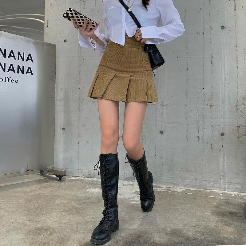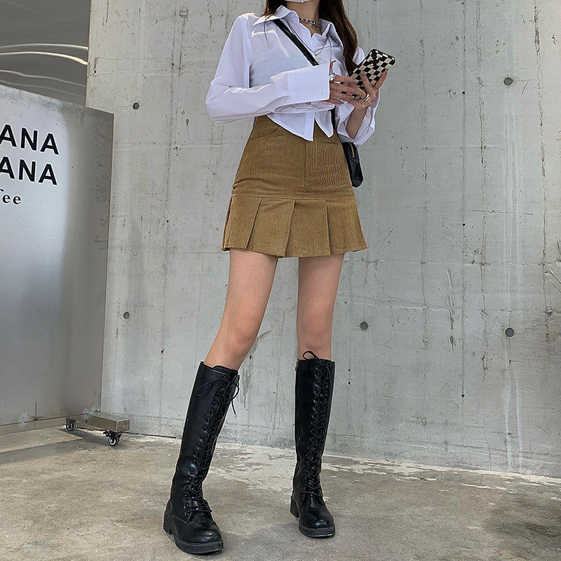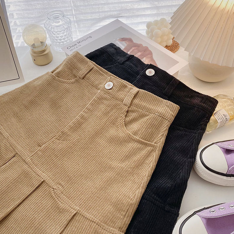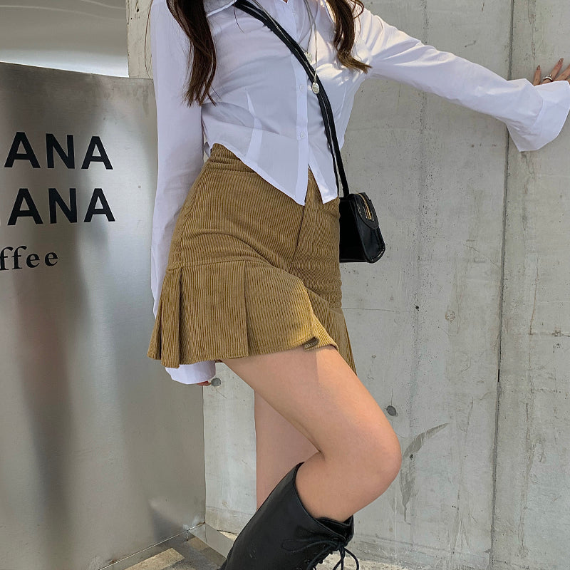 Corduroy mini skirt with a fit and flare pleated hem. Button and zip up front with side pockets and belt loops. Lined with safety shorts. Cut open button hole with scissors.