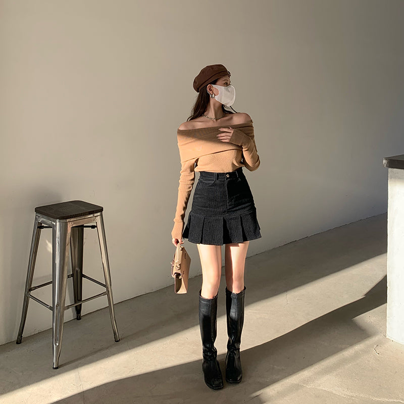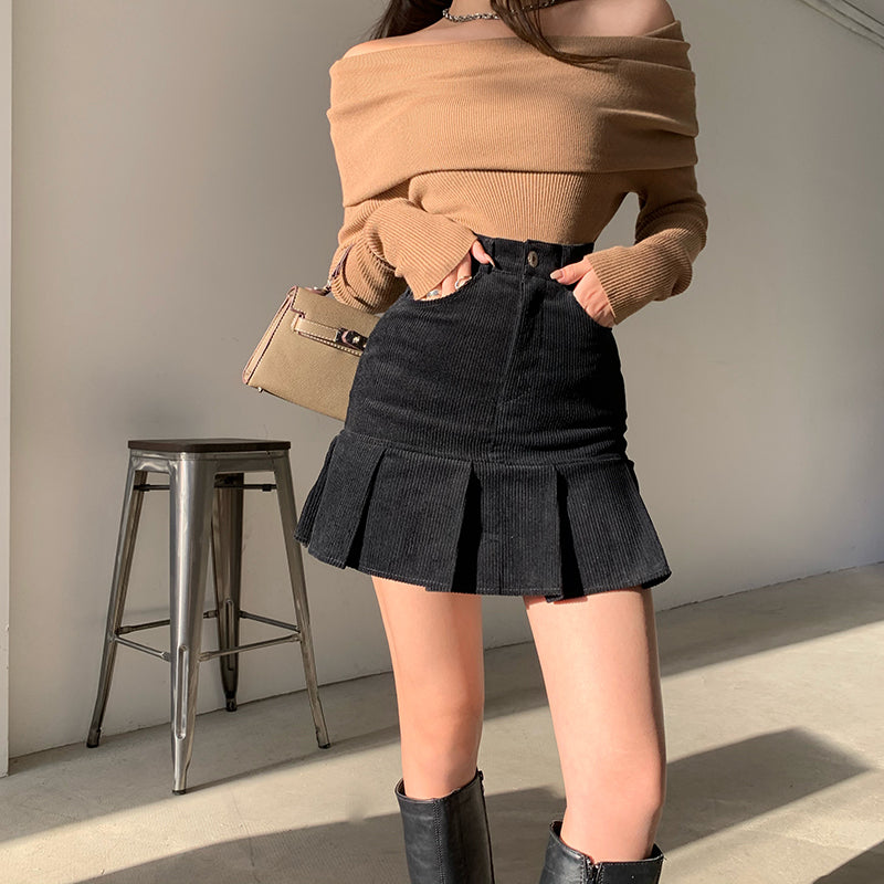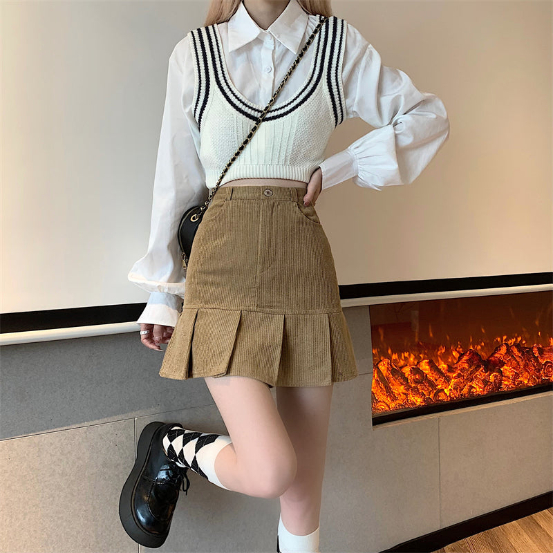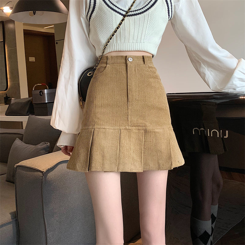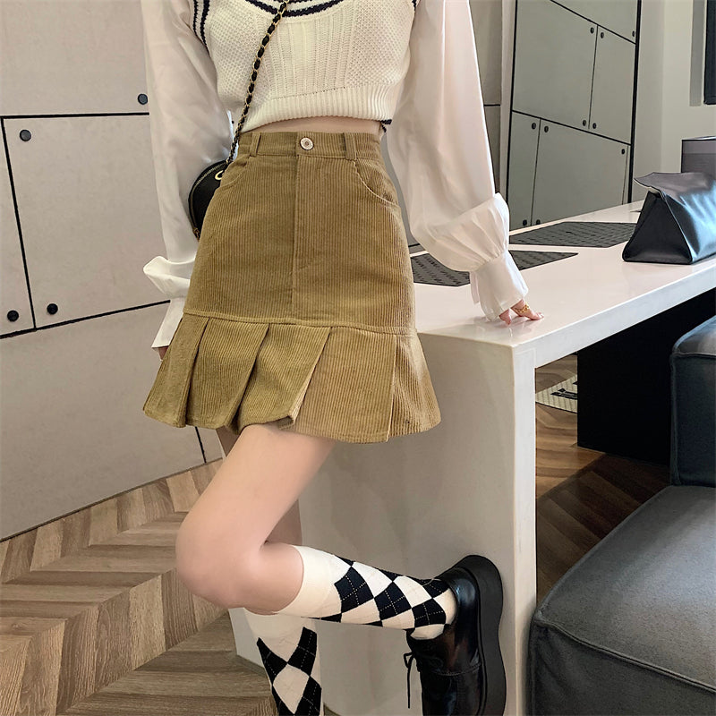 Corduroy mini skirt with a fit and flare pleated hem. Button and zip up front with side pockets and belt loops. Lined with safety shorts. Cut open button hole with scissors.