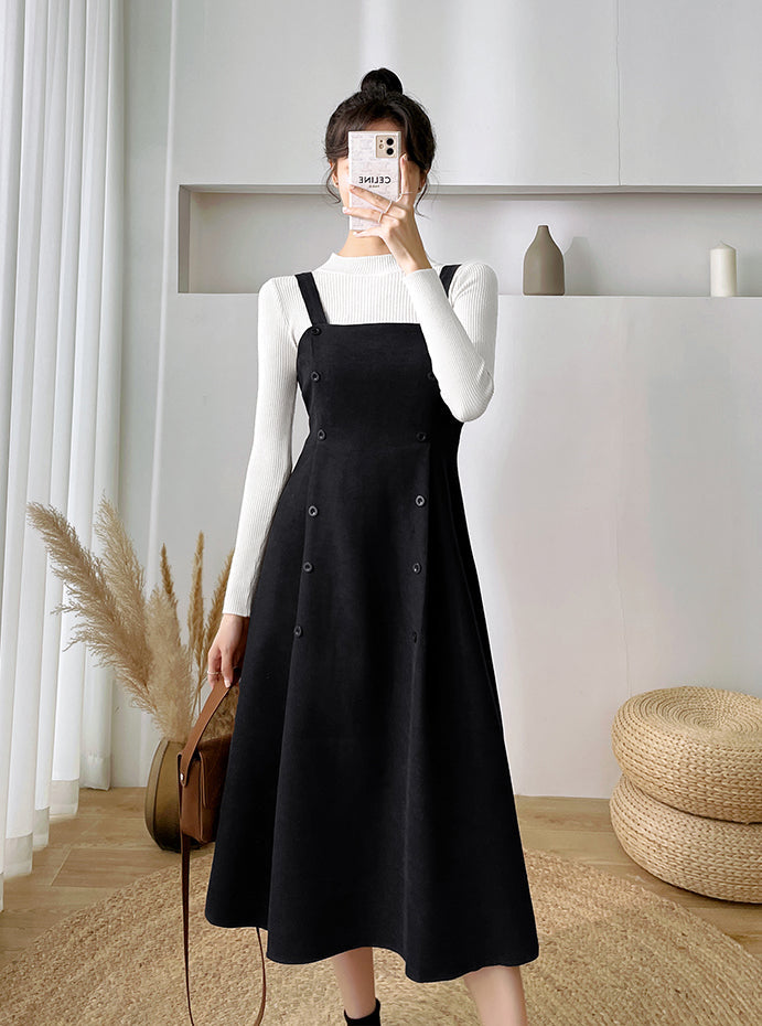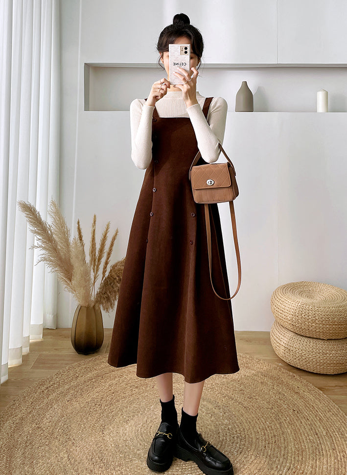 Corduroy suede midi dress with a square neckline. cami straps and double breasted buttons running down a swing skirt. Concealed back zipper and waist ties. Wear alone or pair it with the Basic Mock Neck Sweater.