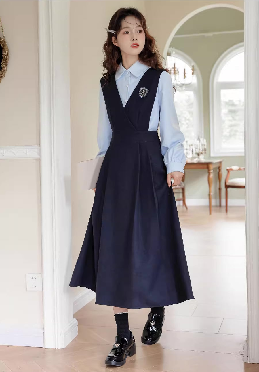 A matching blouse and dress set for easy layering. Features a corduroy suede dress pinafore with a criss-cross v-neckline. embroidered patch. cut-out back. waist ties and a midi length skirt with concealed back zipper for easy wearing. The blouse is a basic woven button down shirt with a removable neck piece.