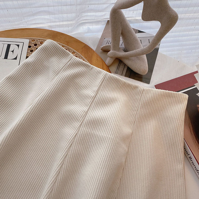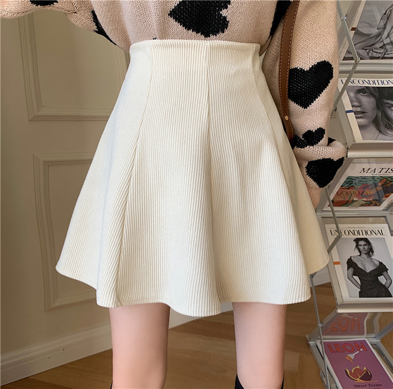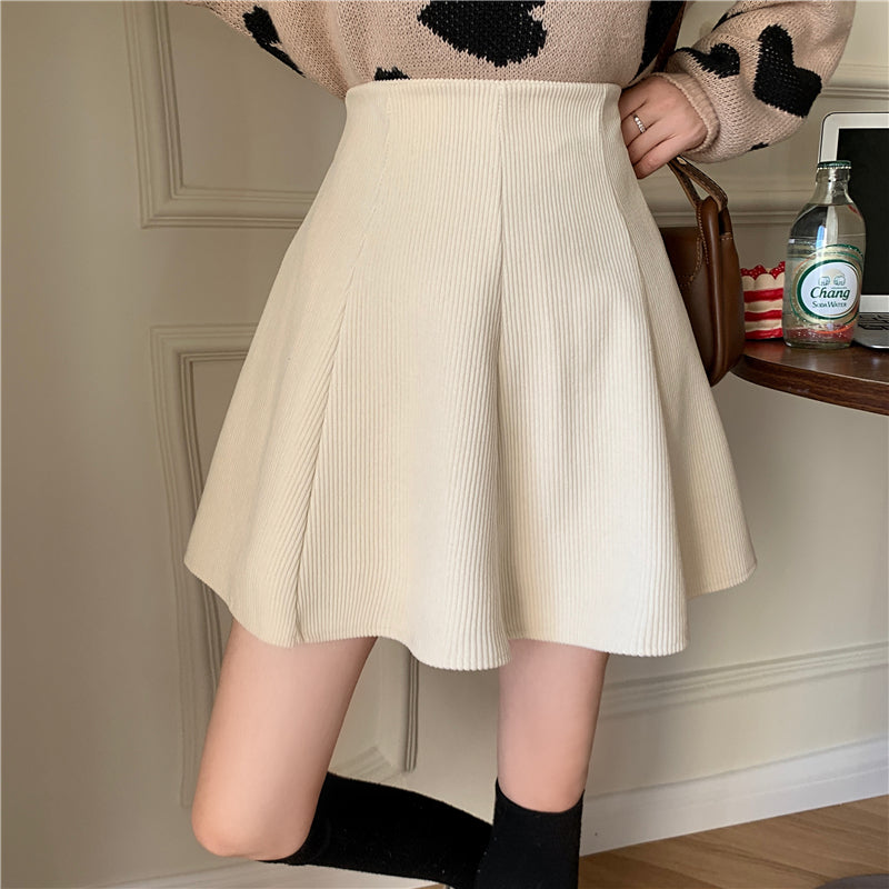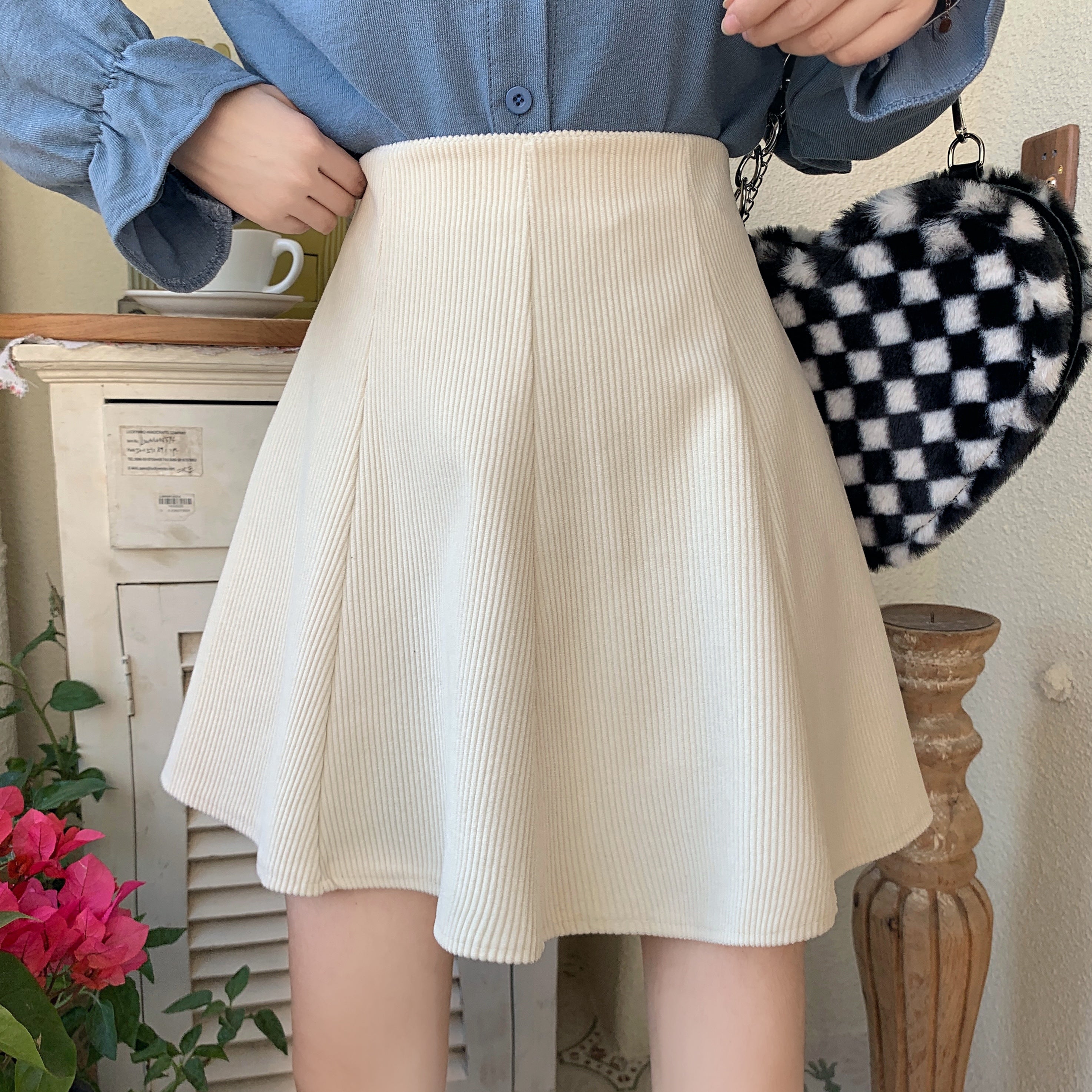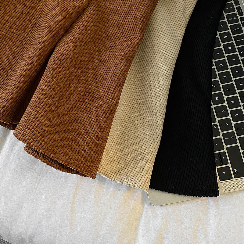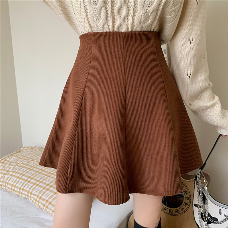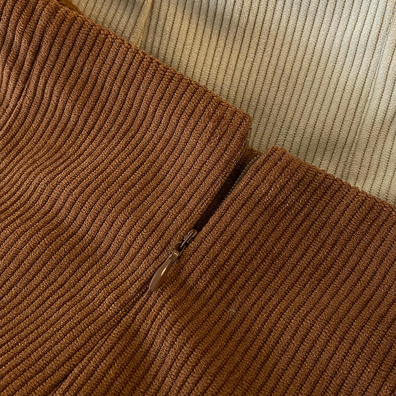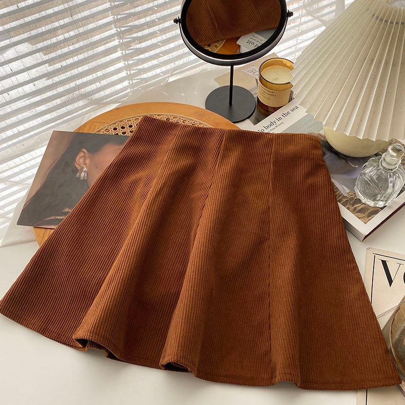 Short corduroy skirt with a flared twirly hem. Concealed back zipper. Lined with safety shorts.
