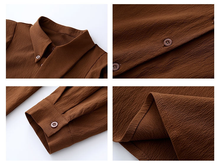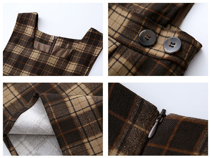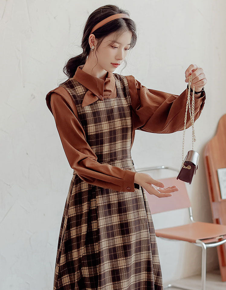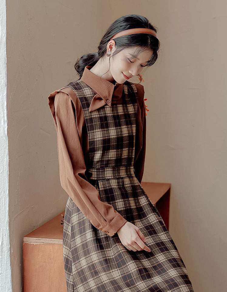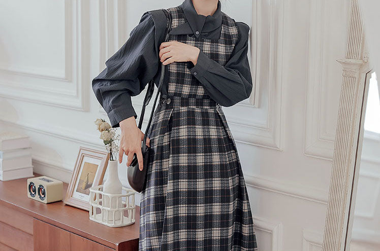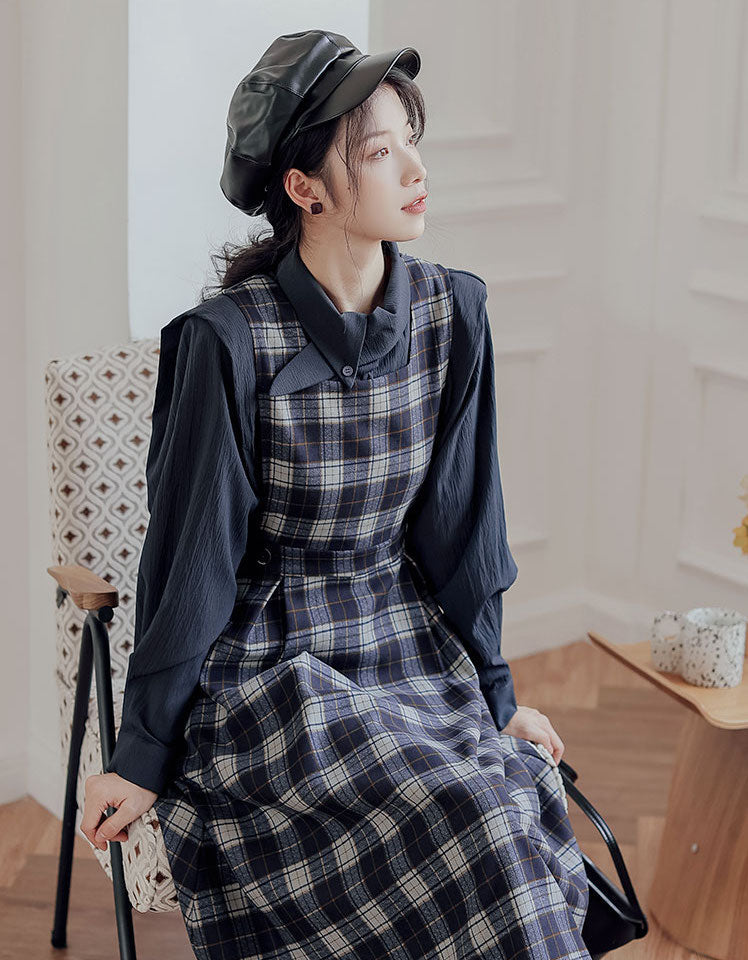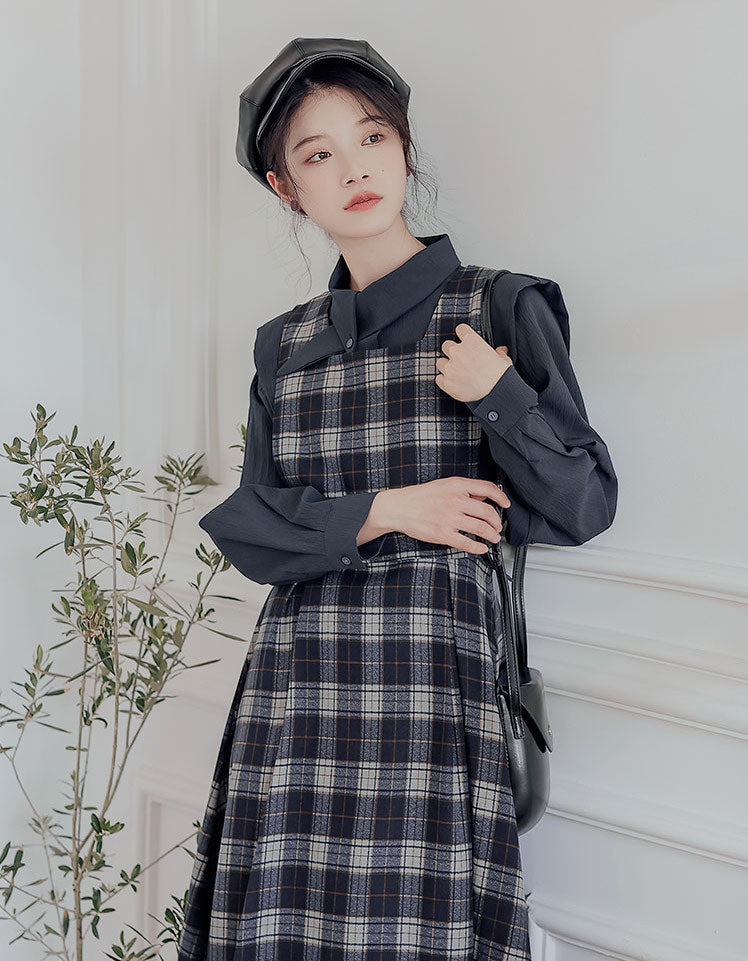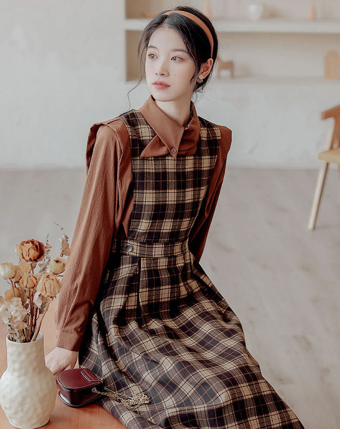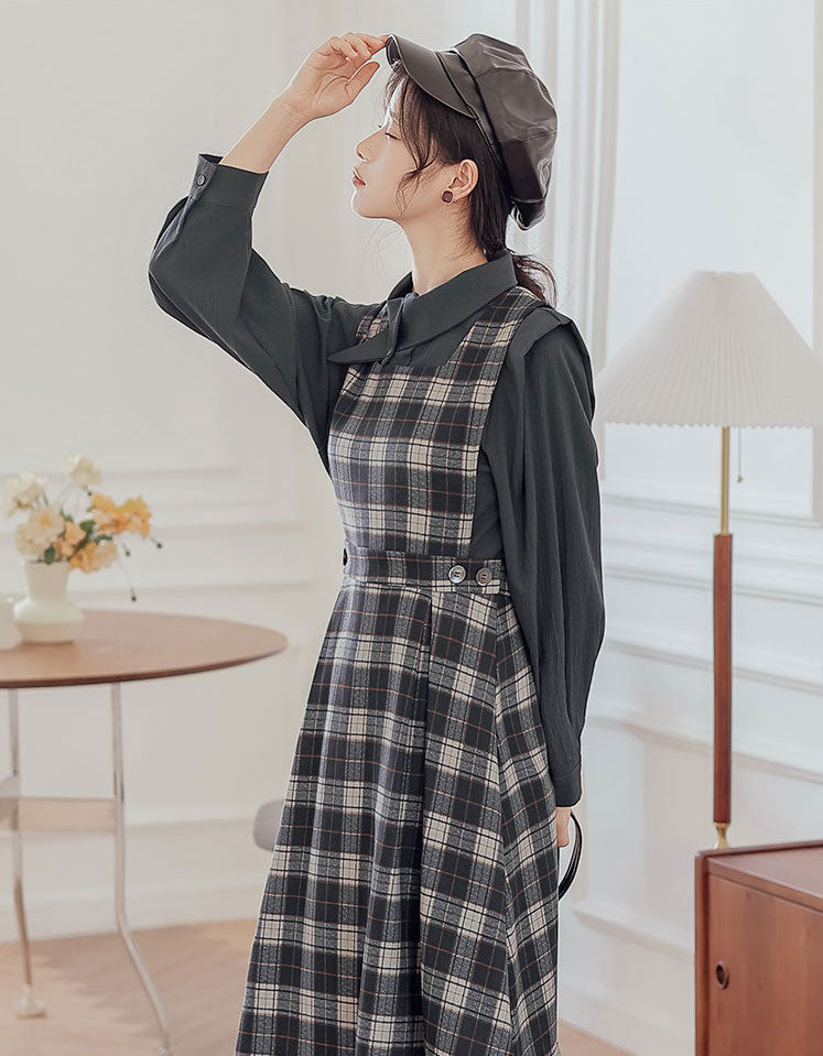 Knit plaid pinafore midi dress with buttons on the sides and concealed back zipper. Matching crepe chiffon button up blouse with asymmetrical collar.