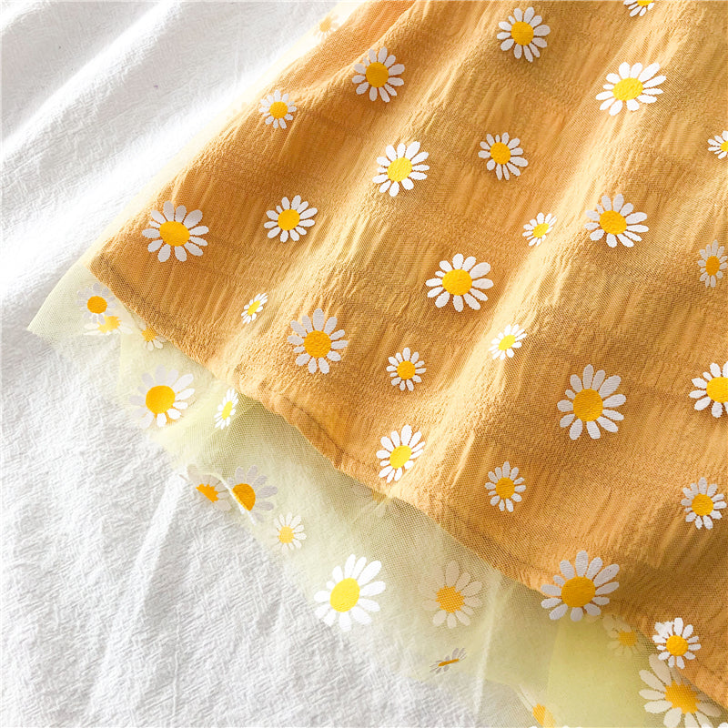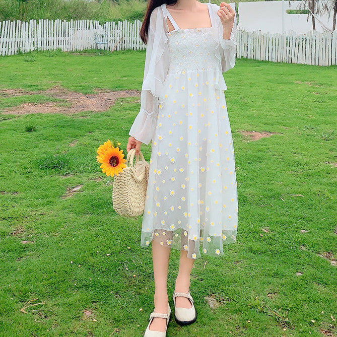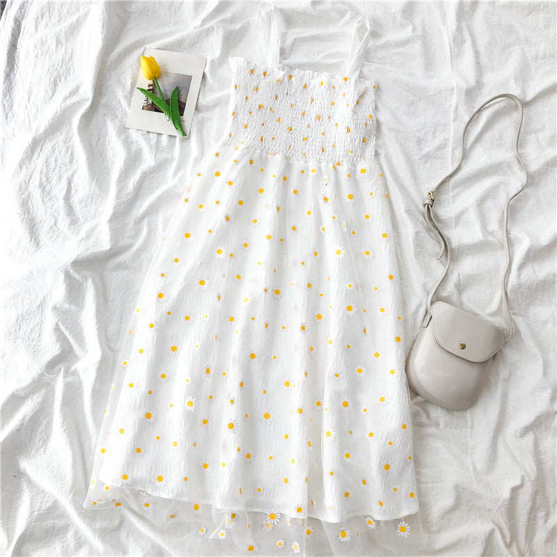 Midi cami dress in a light crepe fabric with a stretchy smocked body and daisy mesh overlay.
