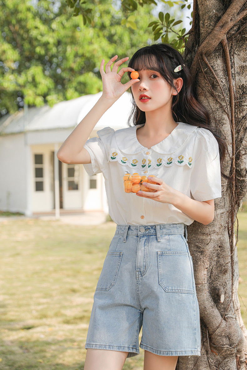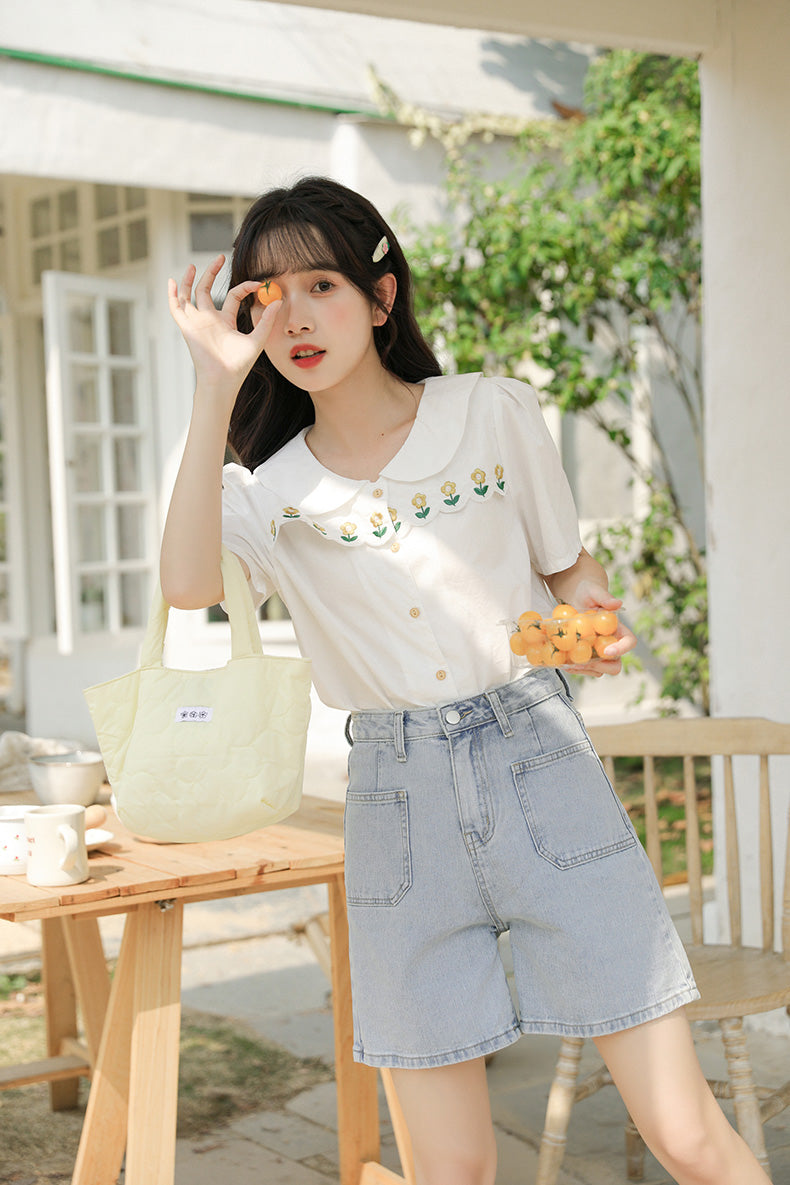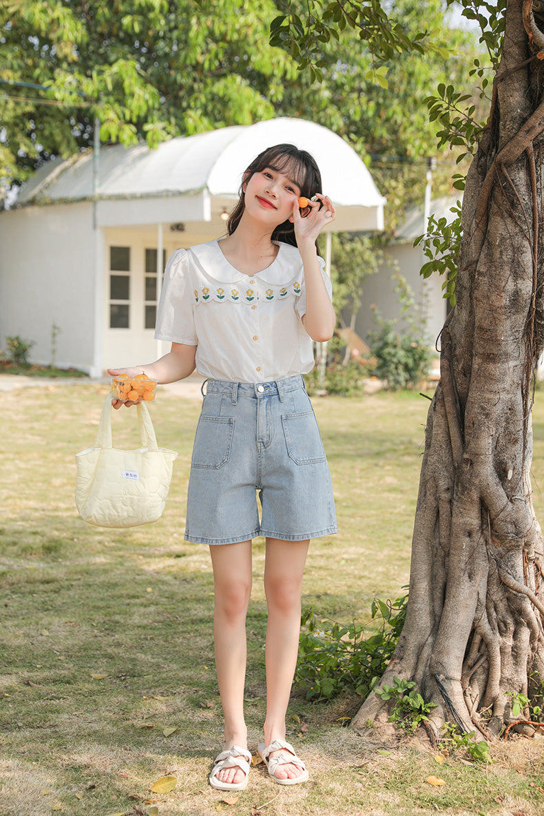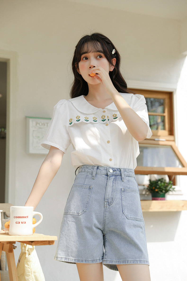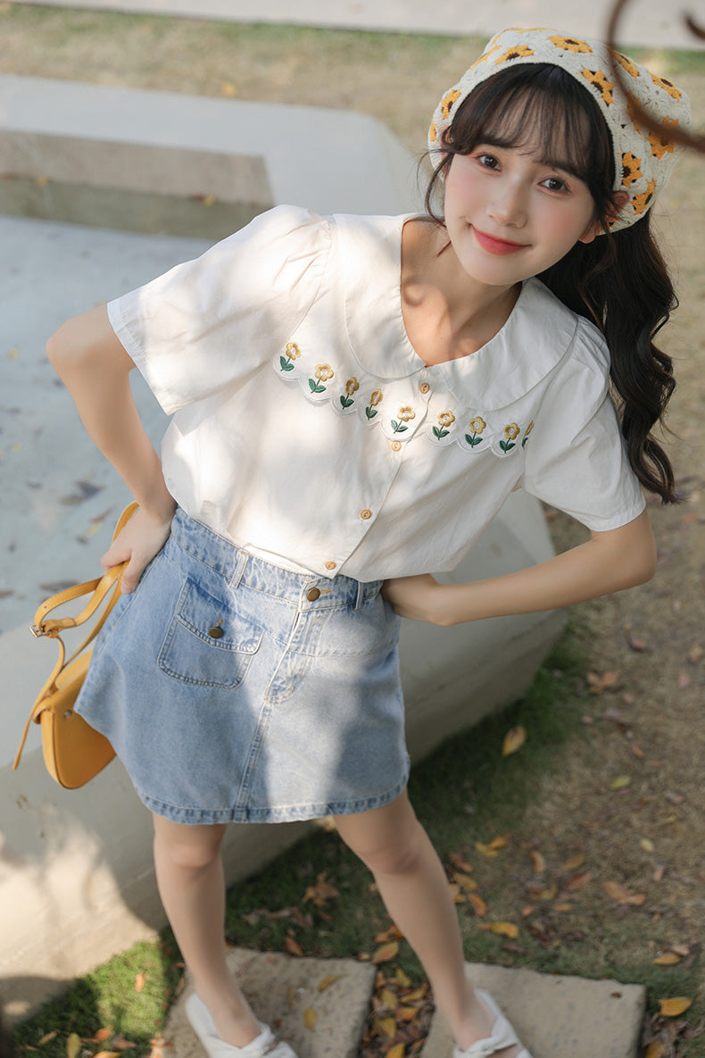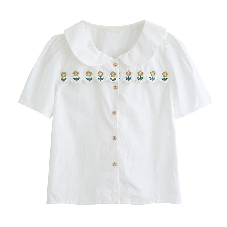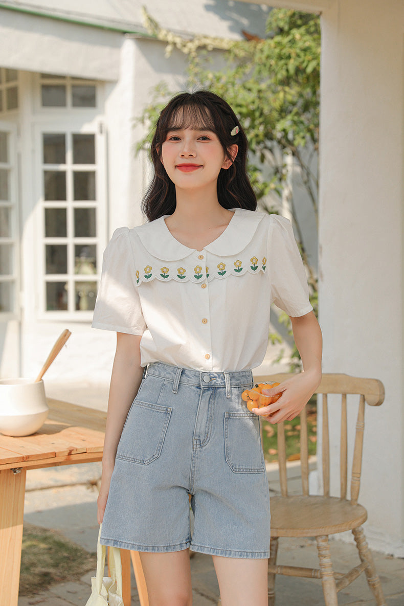 Short sleeve button up shirt with a peter pan collar and scalloped chest with embroidered daisies.
