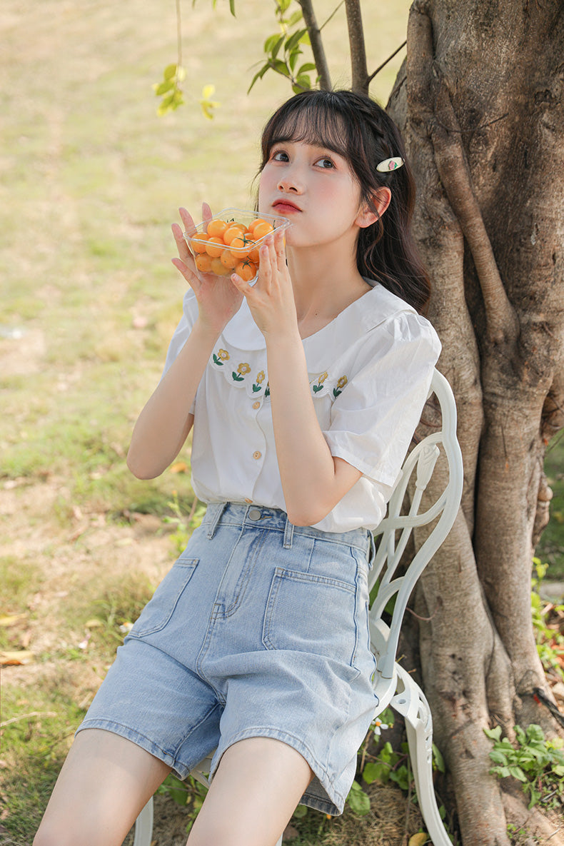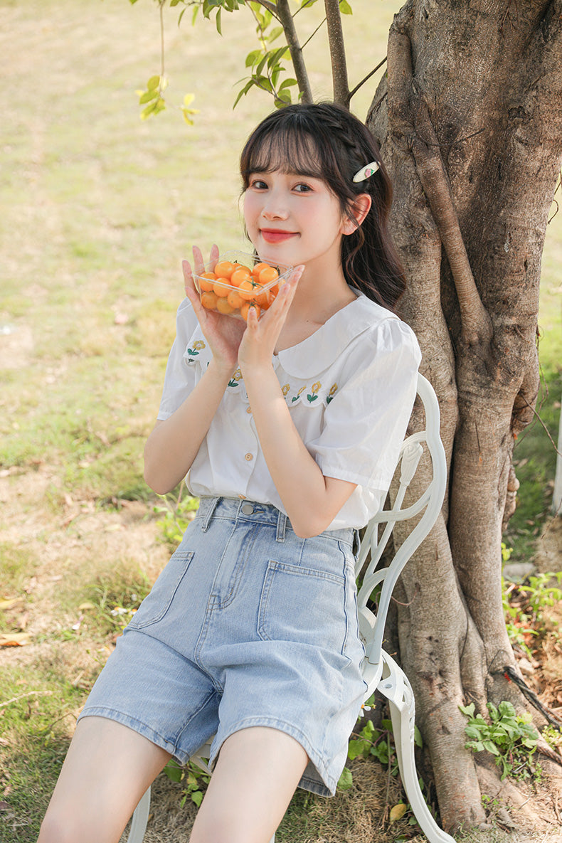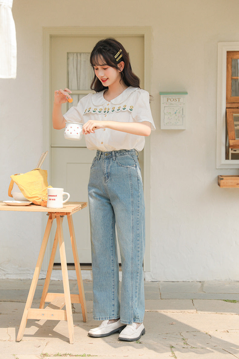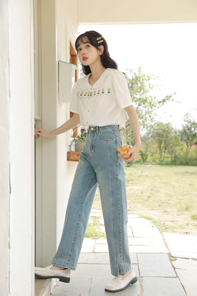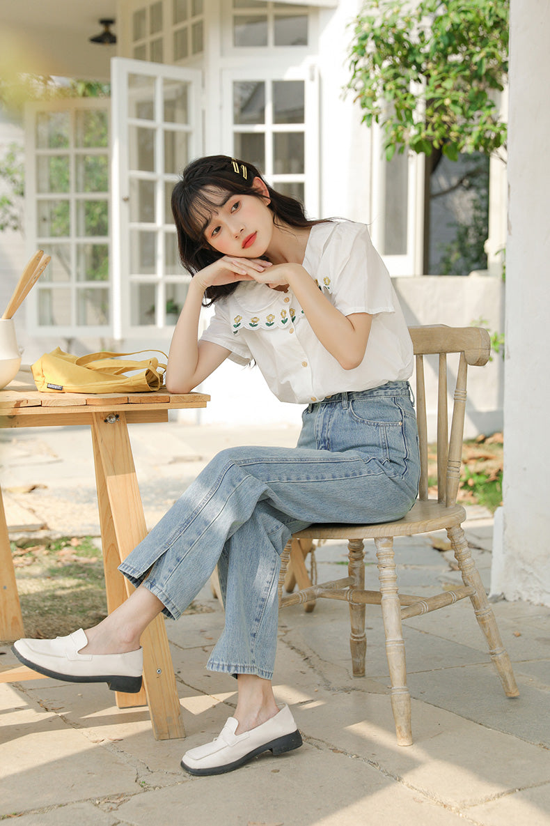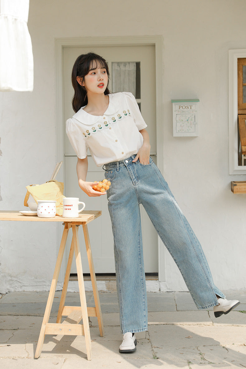 Short sleeve button up shirt with a peter pan collar and scalloped chest with embroidered daisies.