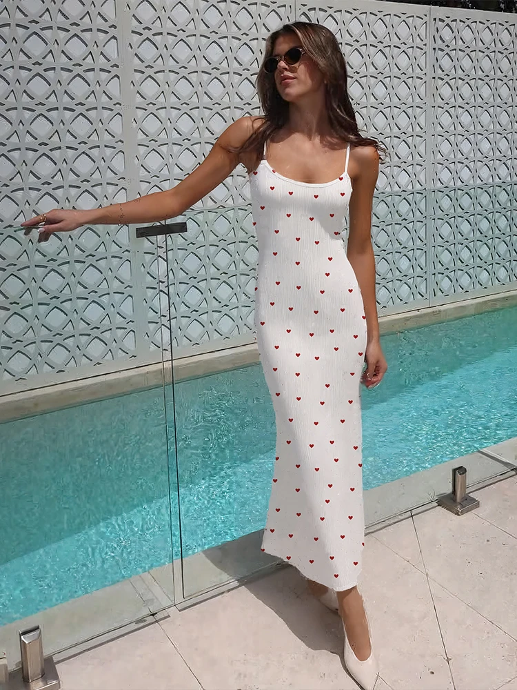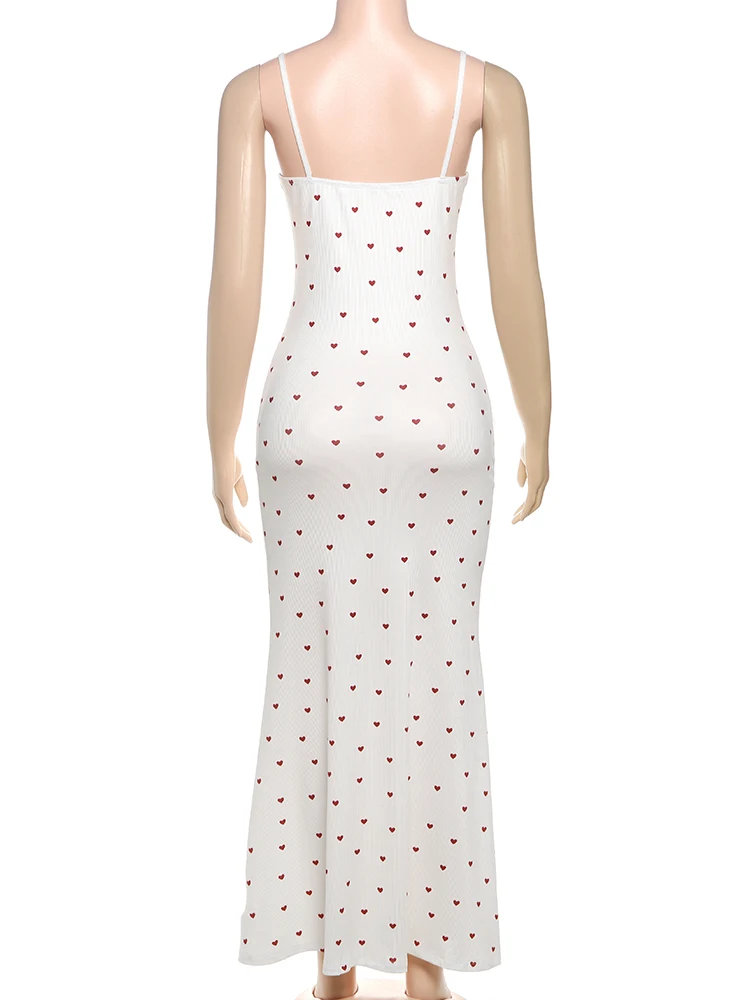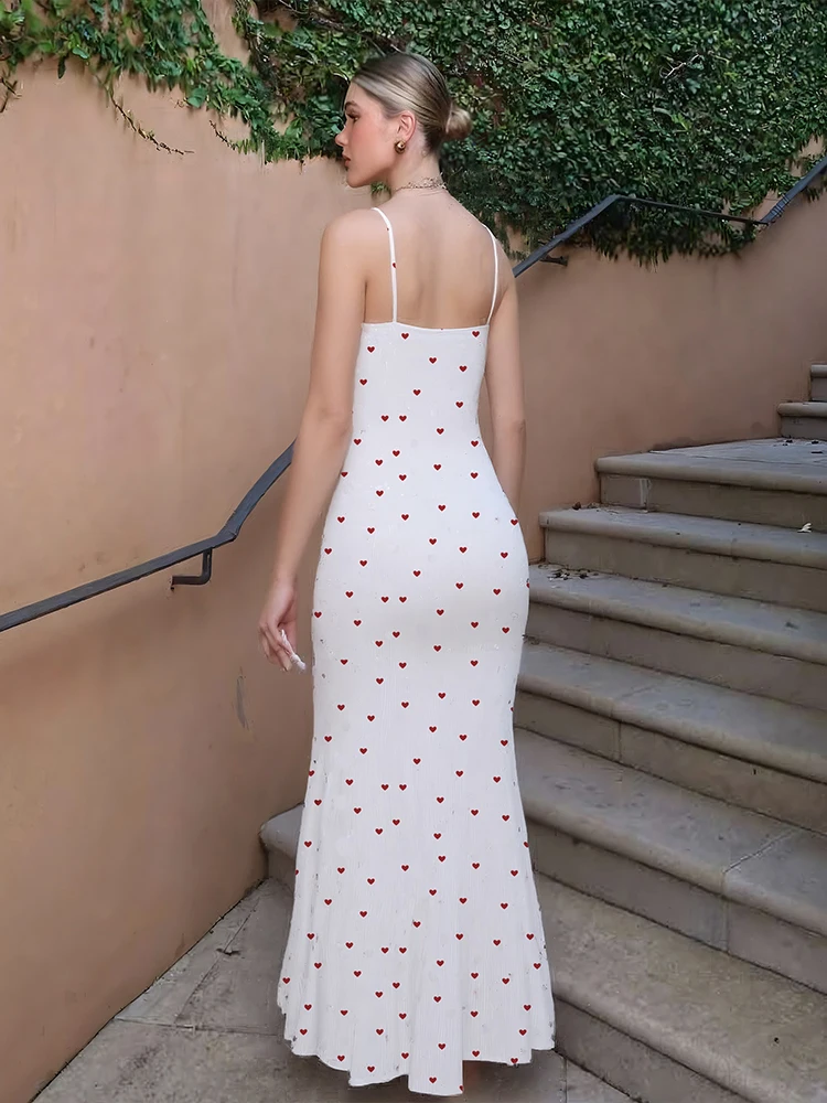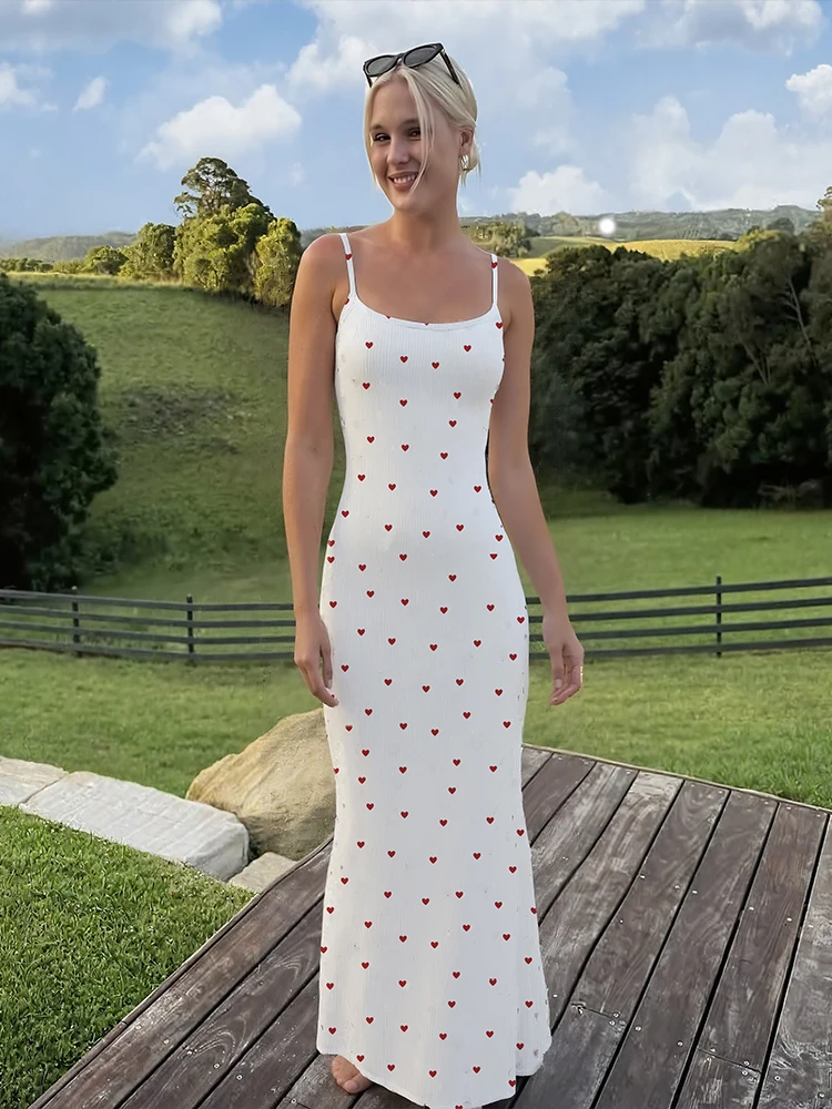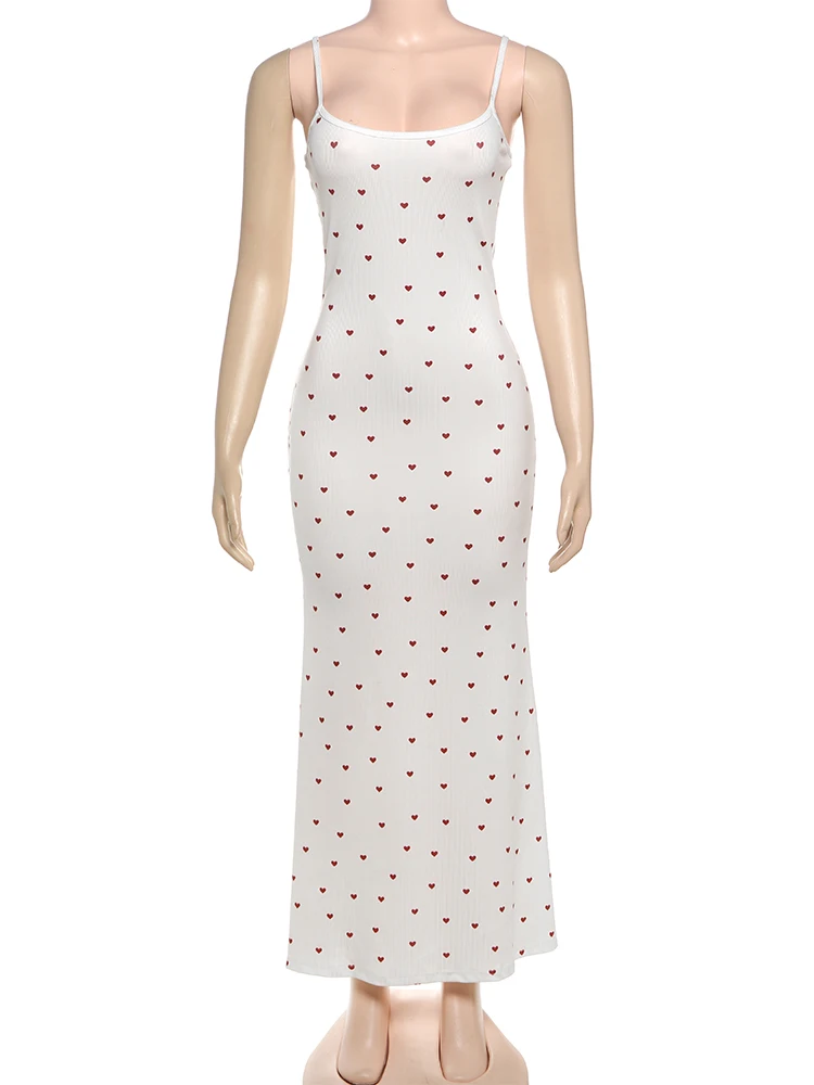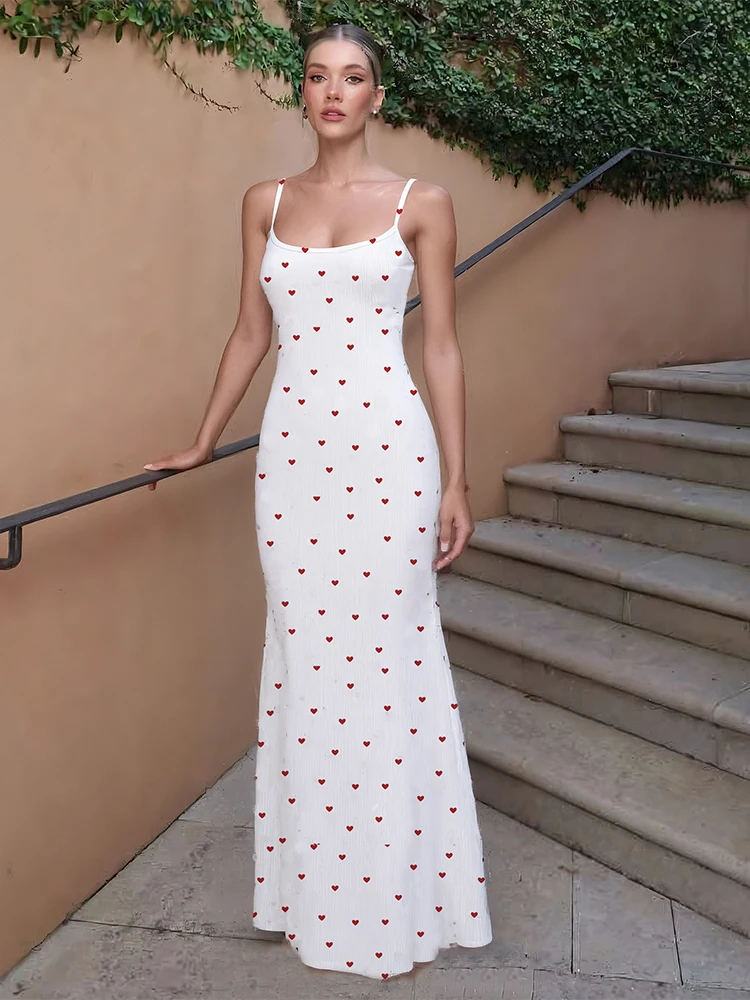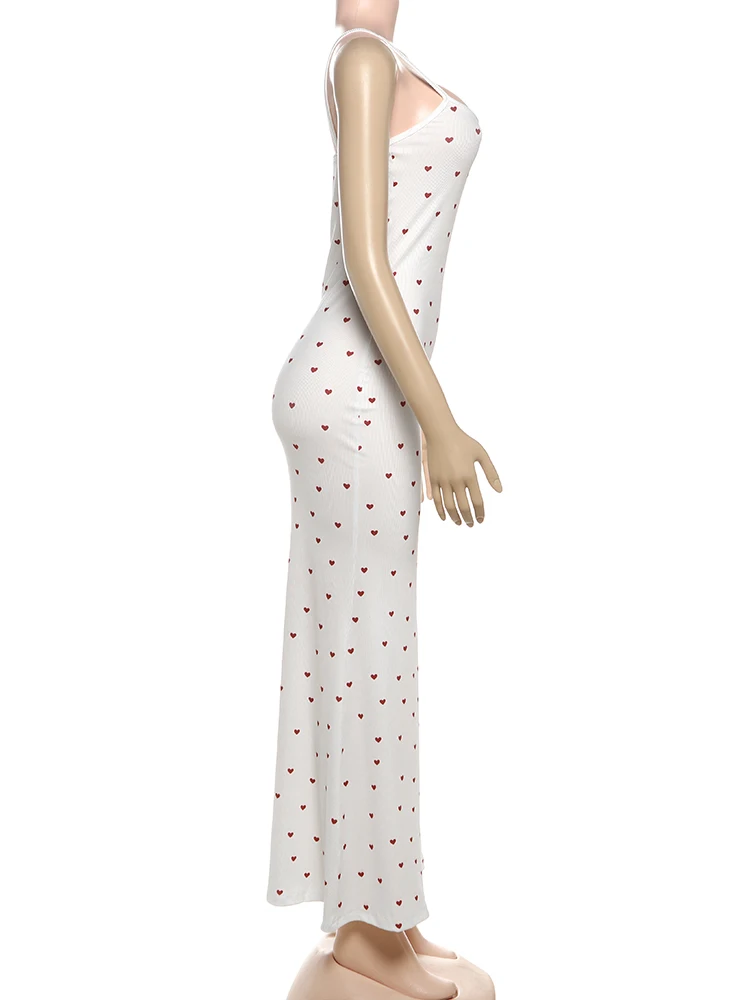Elegant Heart Print Ribbed Maxi Dress Women Summer Y2K Trend Square Collar Backless Robe Daily Casual Fashion Outfits