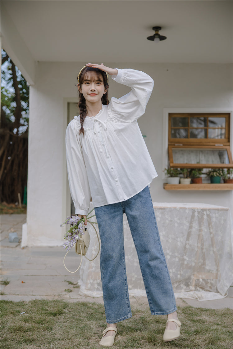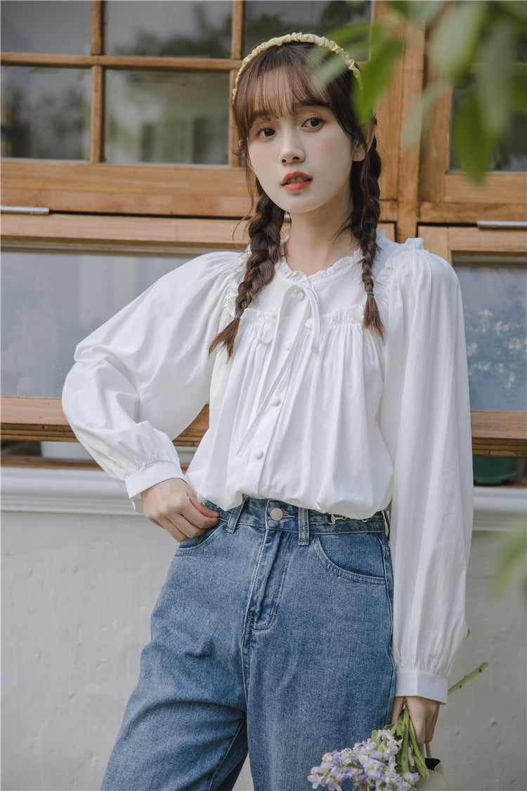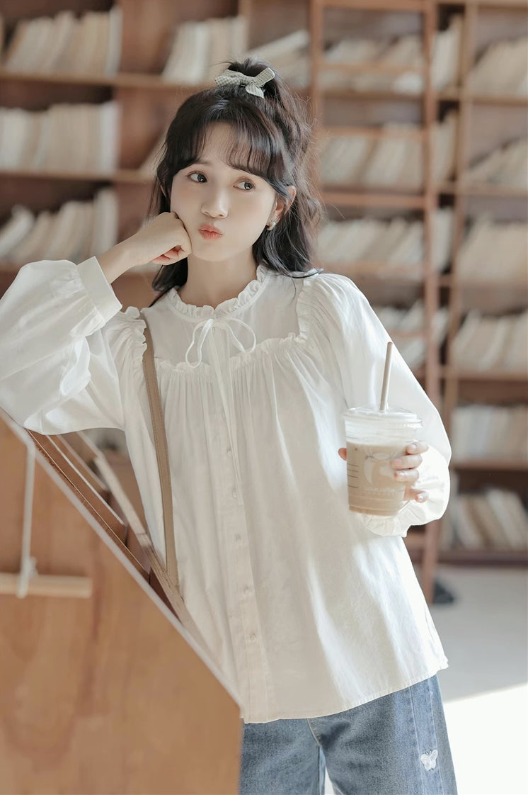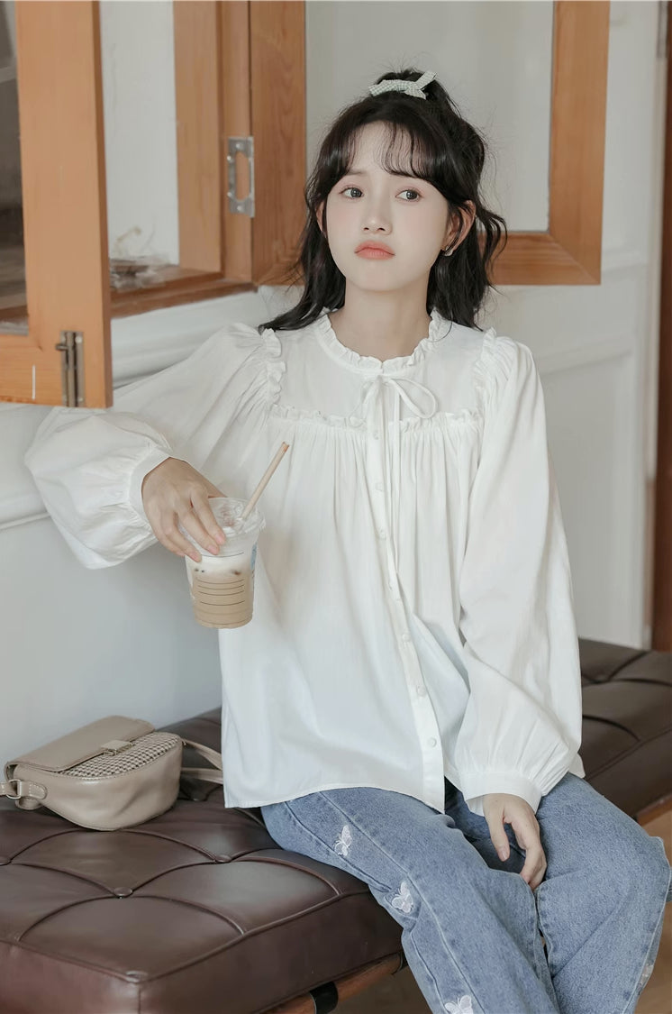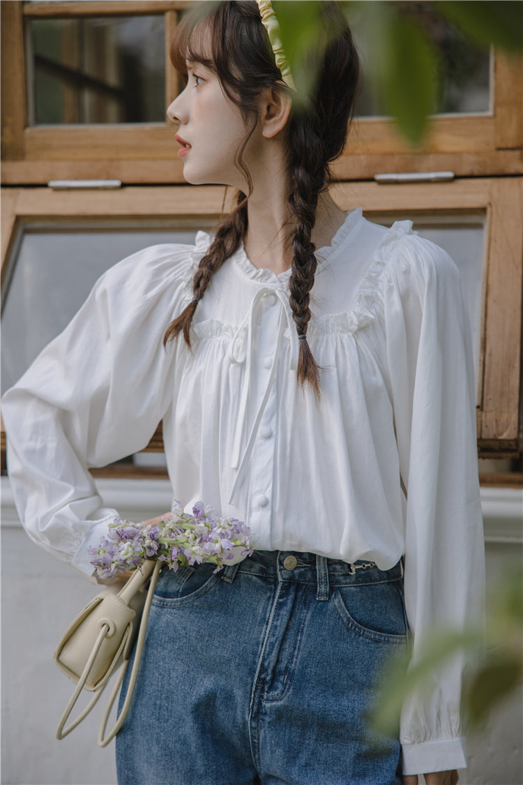 A staple button up shirt that looks perfect on its own or layered with vests. cardigans or overalls. Features a ruffled round neckline with neck ties. more ruffles along the chest and shoulders. puffy long sleeves and a flared silhouette.