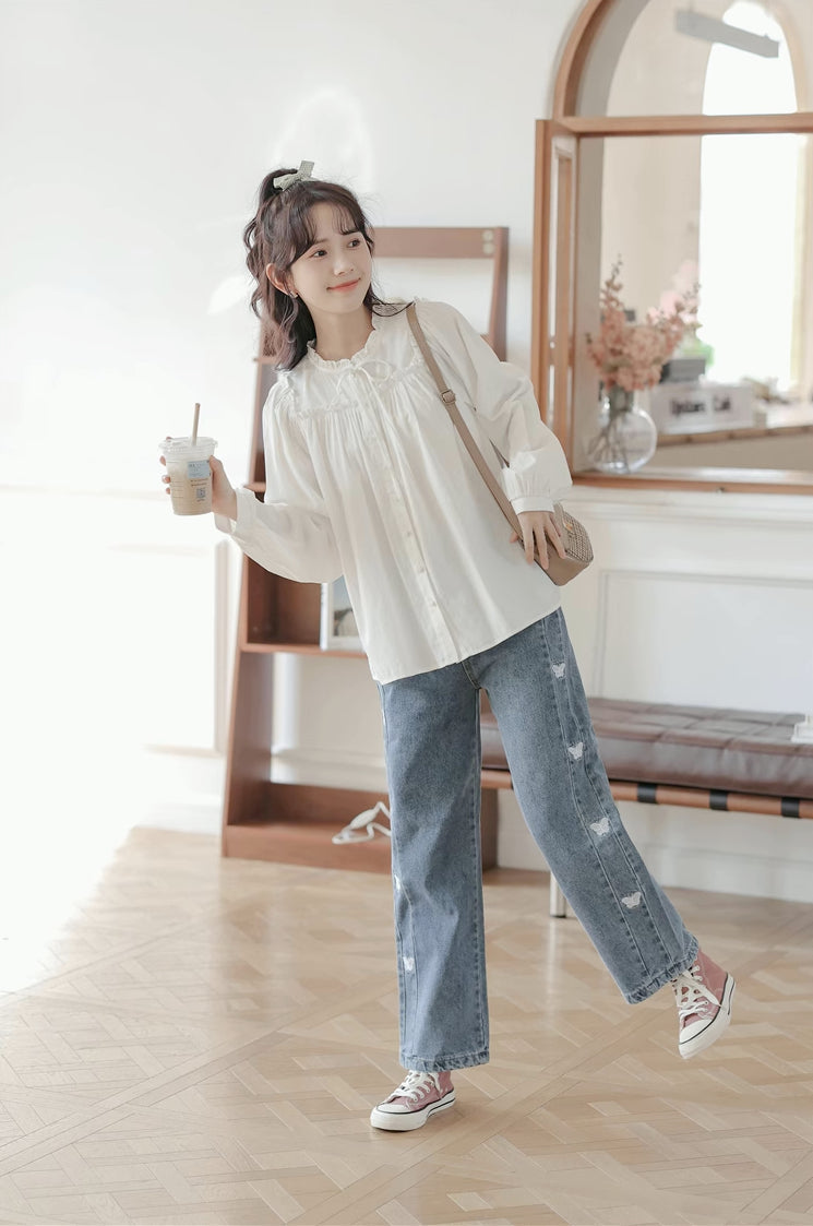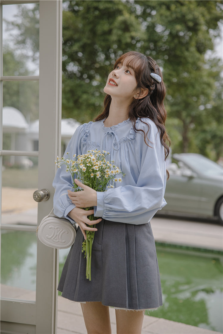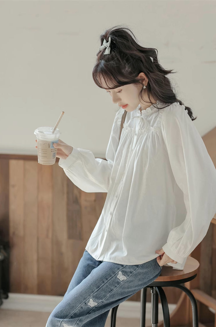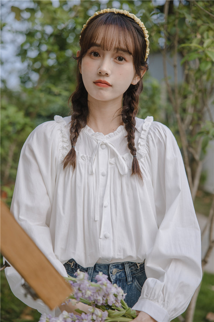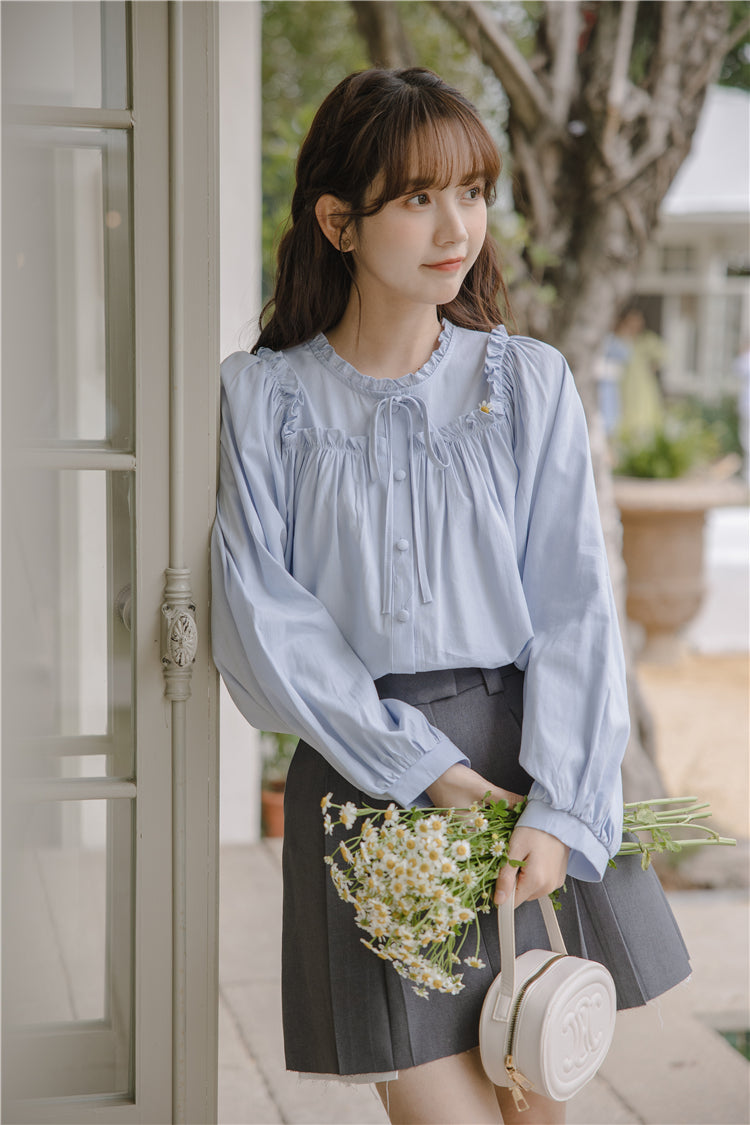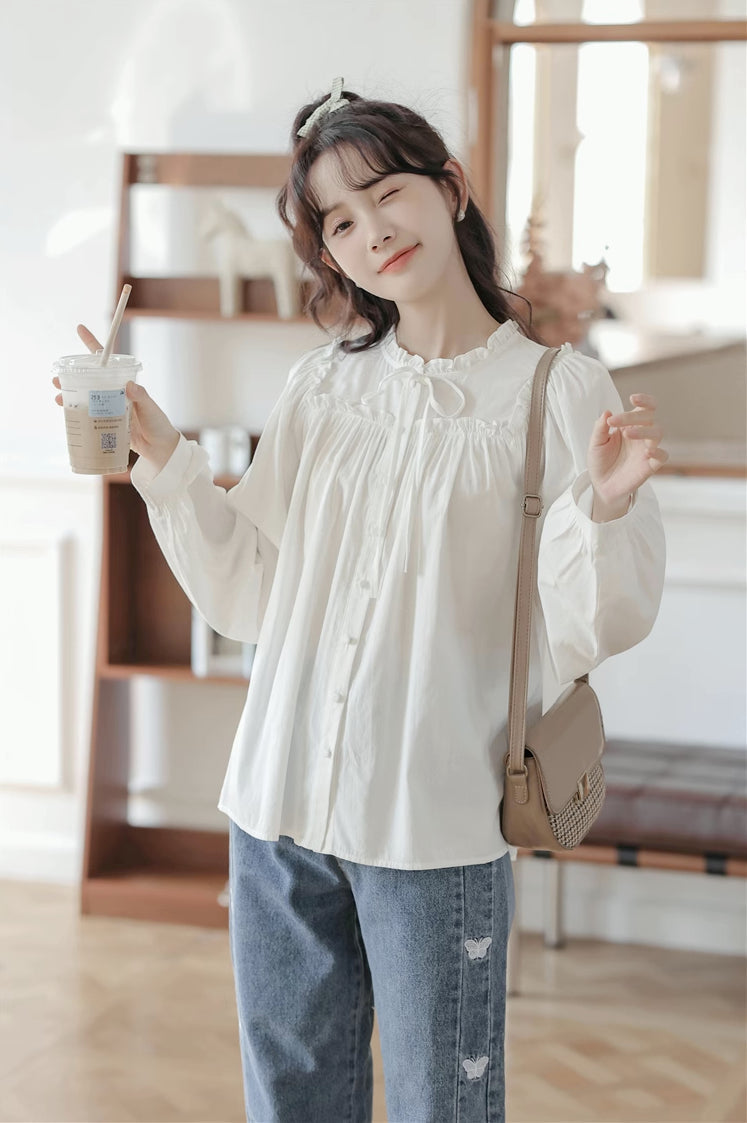 A staple button up shirt that looks perfect on its own or layered with vests. cardigans or overalls. Features a ruffled round neckline with neck ties. more ruffles along the chest and shoulders. puffy long sleeves and a flared silhouette.