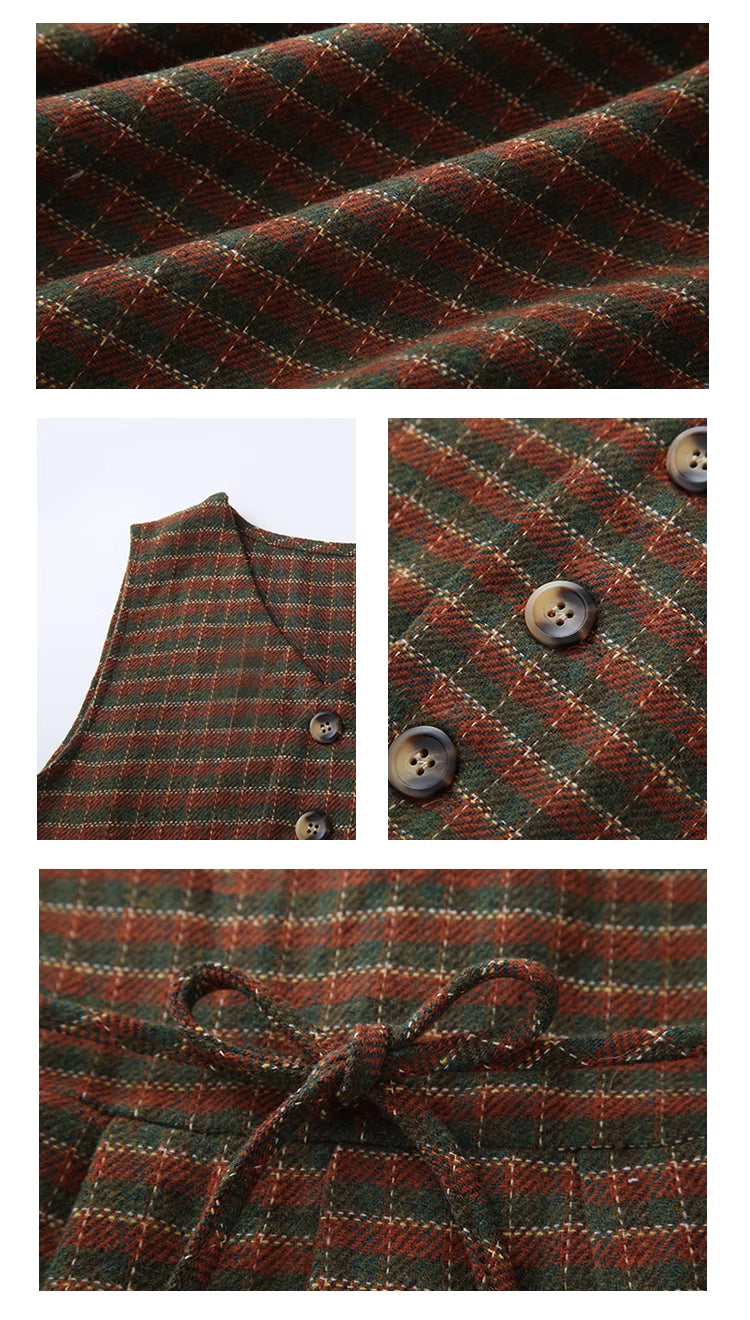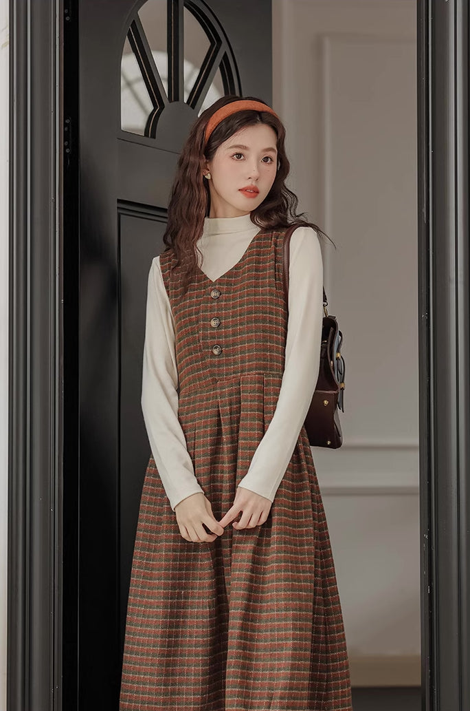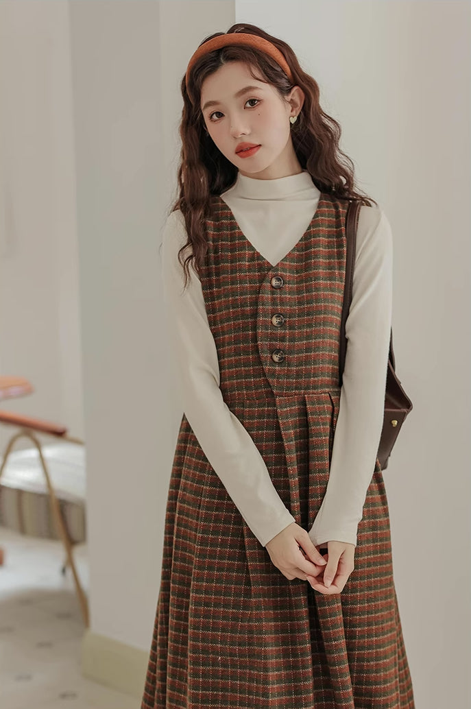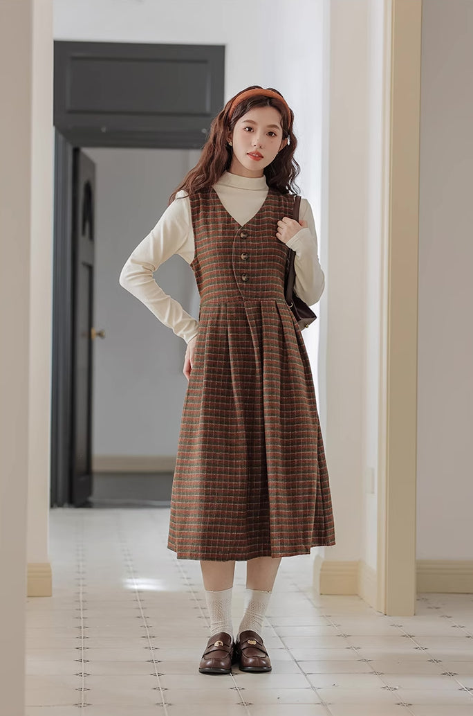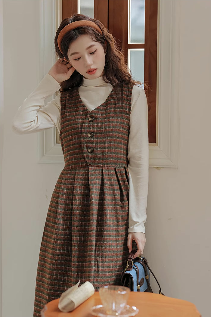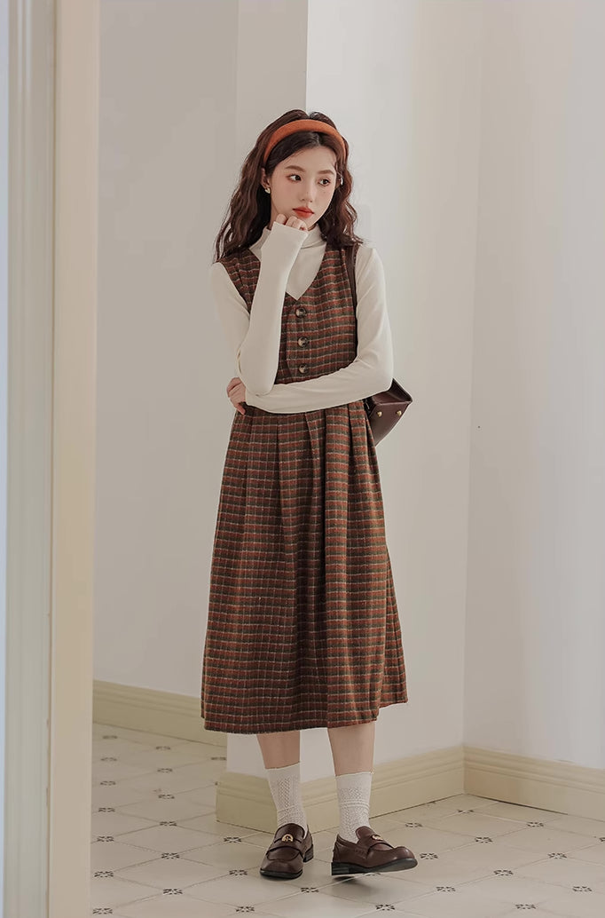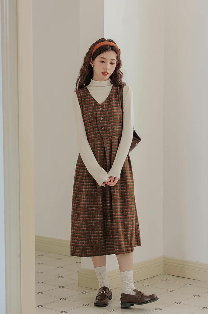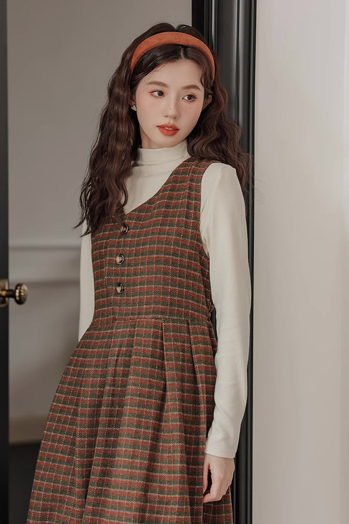 A two-piece set featuring a basic mock neck long sleeve sweater and a plaid pinafore dress with a button front. waist ties and midi skirt.
