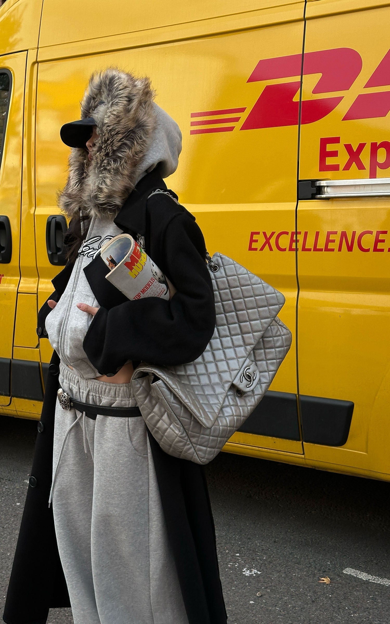 A cropped zip hoodie built with a cold-weather edge. featuring a dramatic faux-fur hood that frames the face with volume and attitude. The soft fleece interior delivers warmth without weight. while the structured hem and oversized sleeves create a balanced. sculptural shape. Embroidered lettering adds a bold street signature. pairing effortlessly with wide-leg joggers or layered outerwear. A piece designed for urban movement. comfort. and strong visual identity.