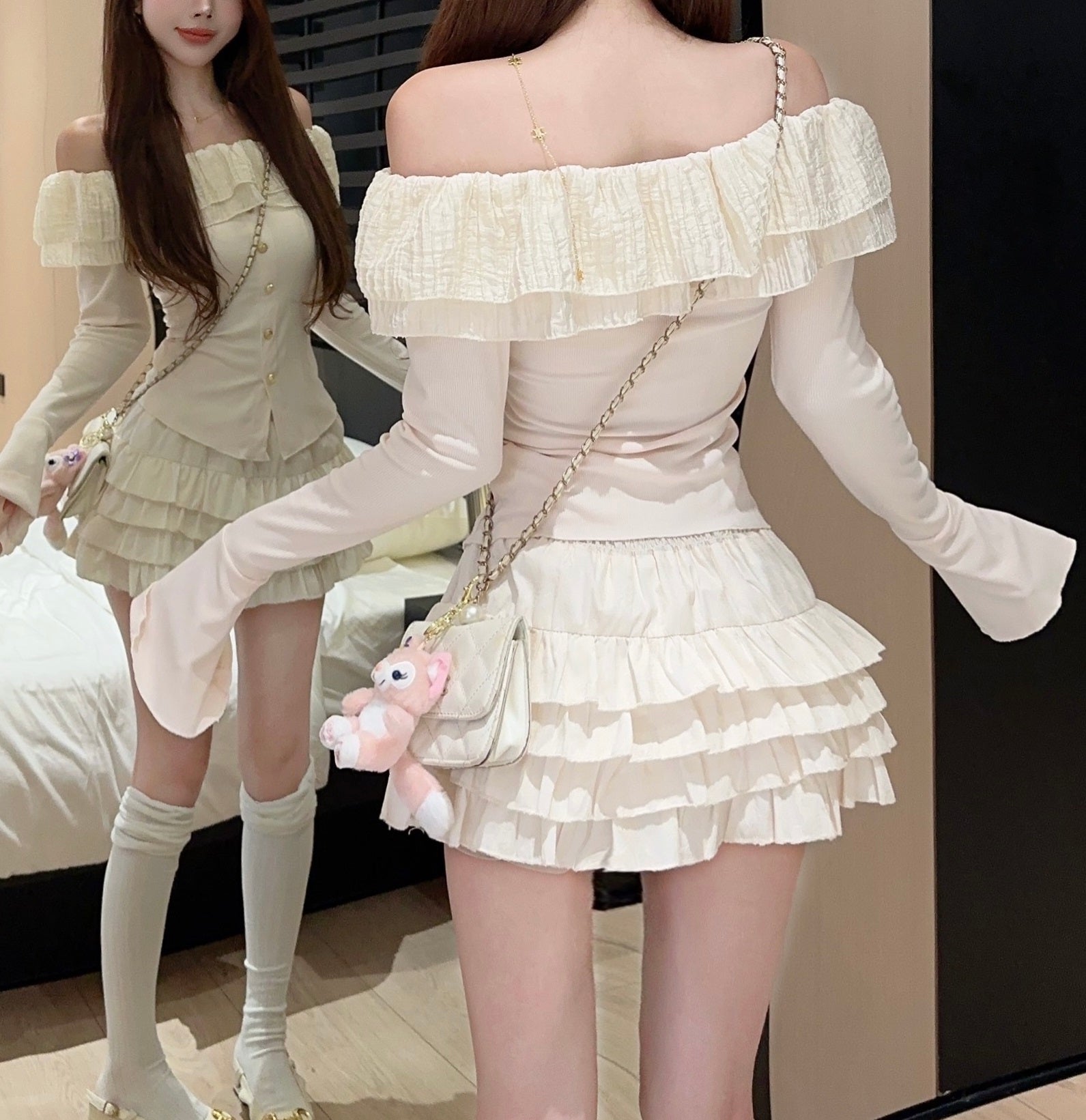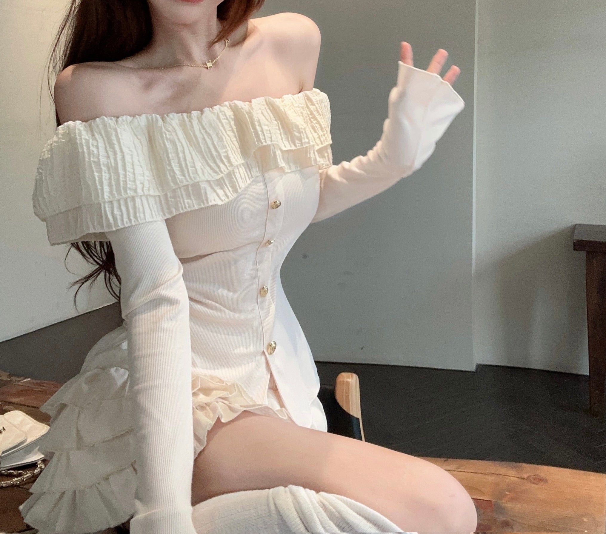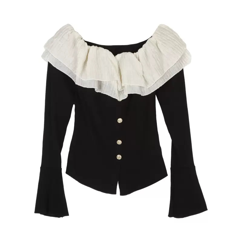 Frill Ruffled Coquette Fit Long Sleeve Cream White Black Top