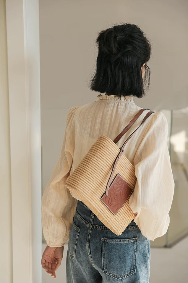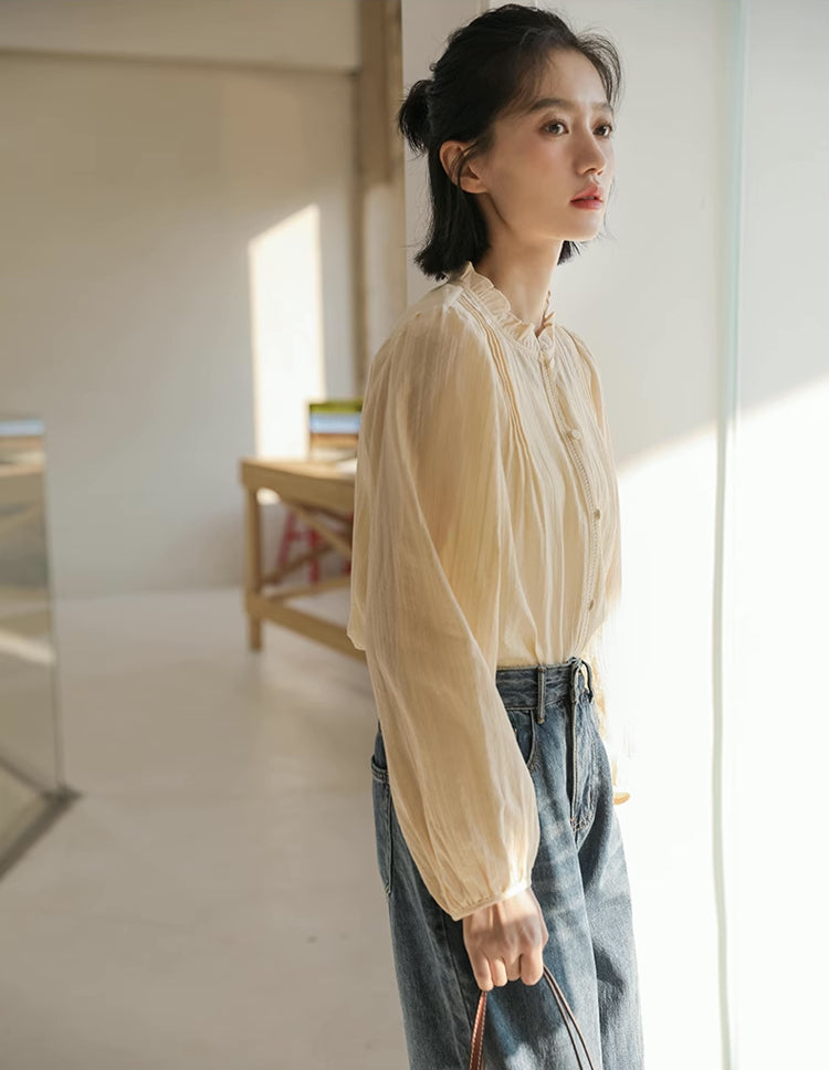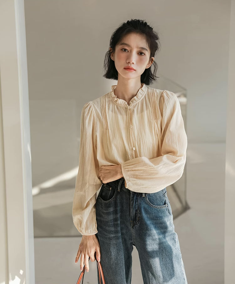 Basic button up shirt with a round high neckline with frills. pintucked chest details and long puff sleeves. Looks good on its own or as a layering piece.