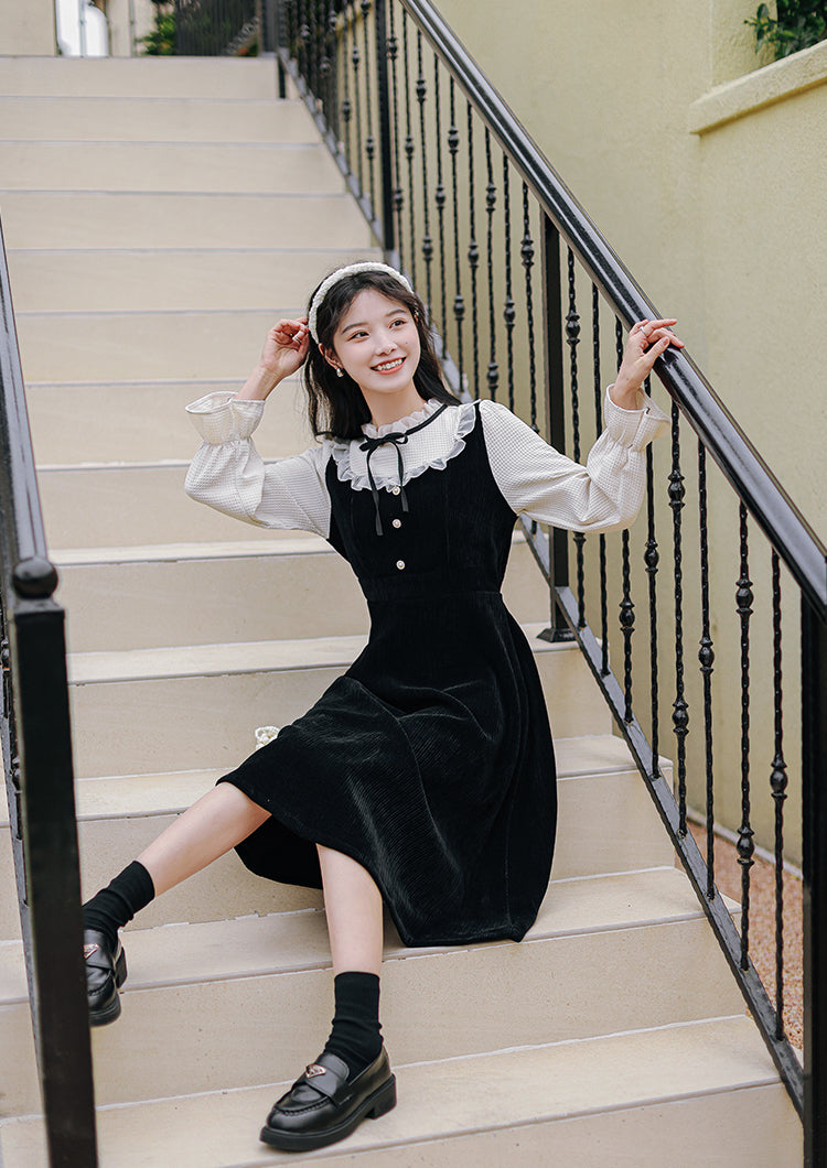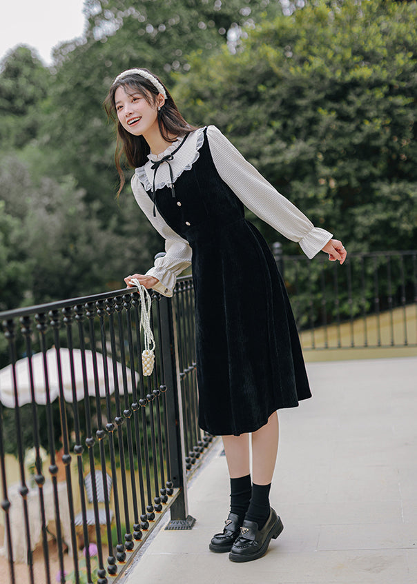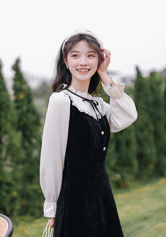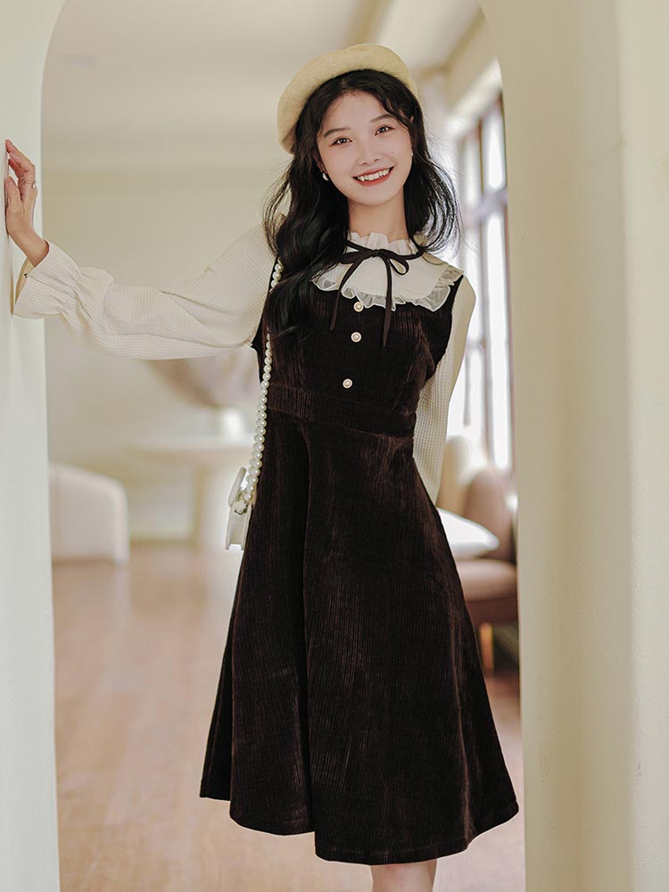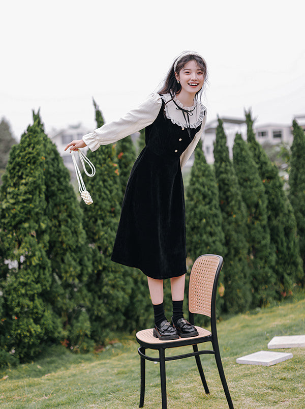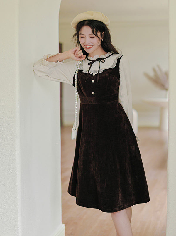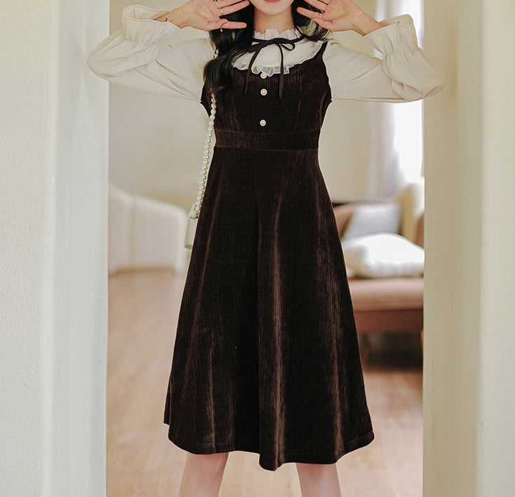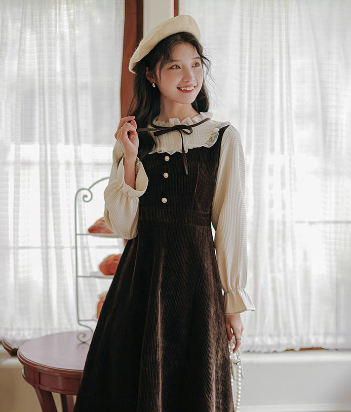 Victorian vibes twofer midi dress with a heavy-weight corduroy knit bodice and skirt. mixed with delicate chiffon frilly high neck and long blouson sleeves with frilly cuffs. Material has stretch. Pull-over construction. Waist back has some elastic. Button loop closure.
