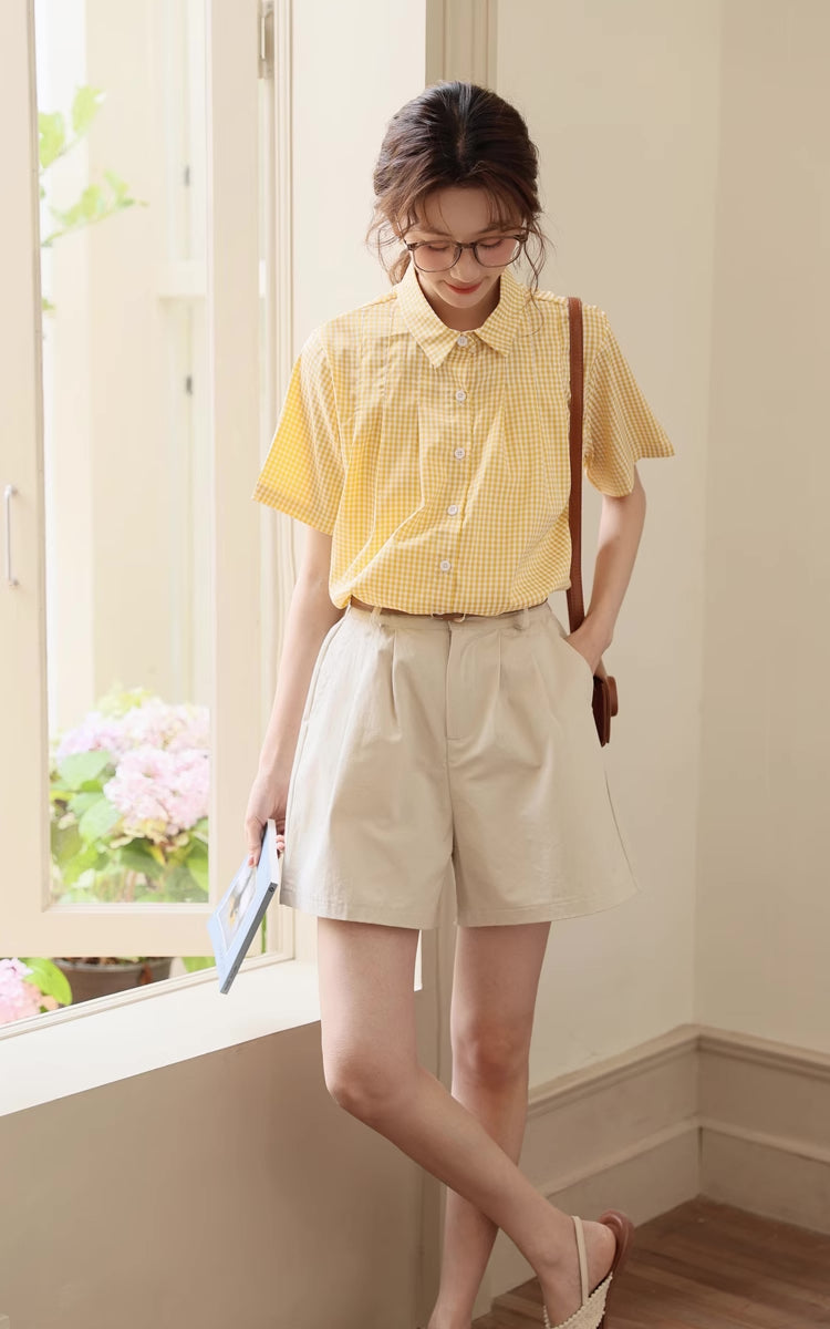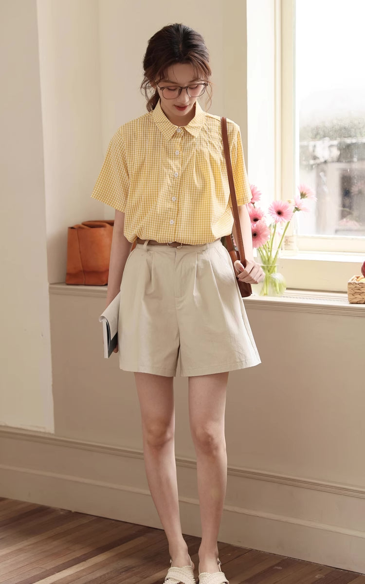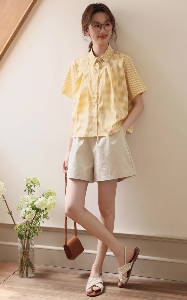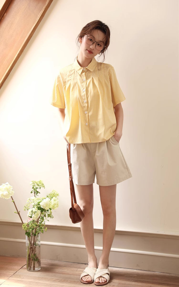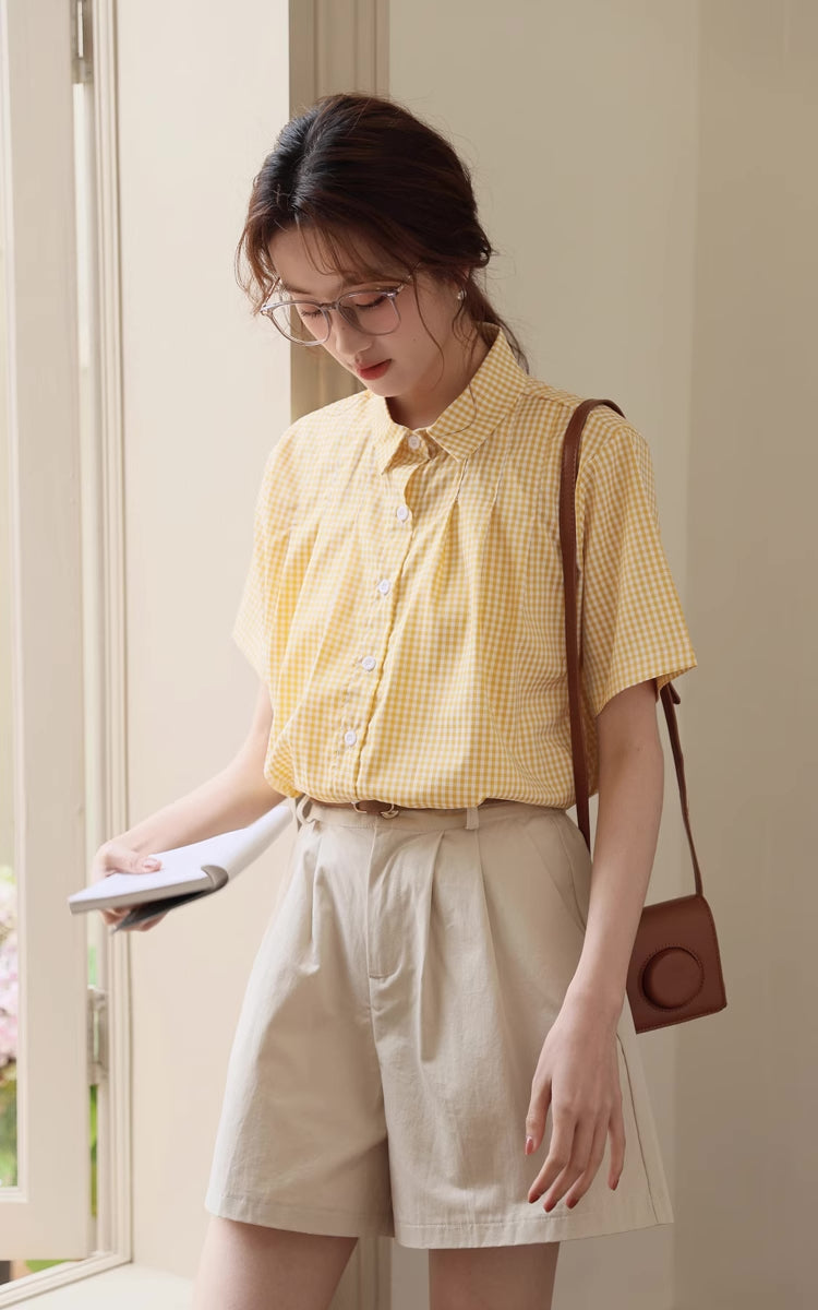 Boxy button up shirt with short sleeves and a picnic gingham print.