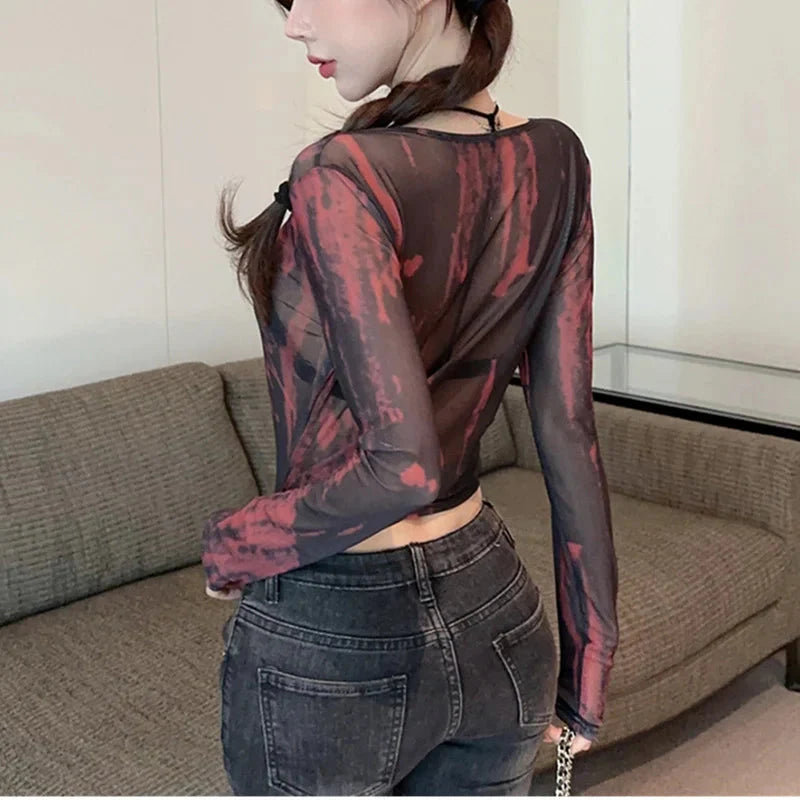 Grunge Crop Tops y2k Clothes Women Tie Dye Print Tie Front V Neck Long Sleeve Mesh T Shirts 2000s Clothing Streetwear