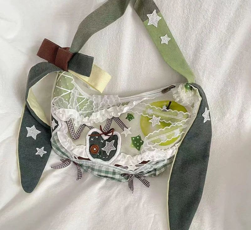 Harajuku Y2k Aesthetic Ins Underarm Bag Women Contrast Color Plaid Rabbit Ear Canvas Bag Grunge Patchwork Lace Shoulder Handbags