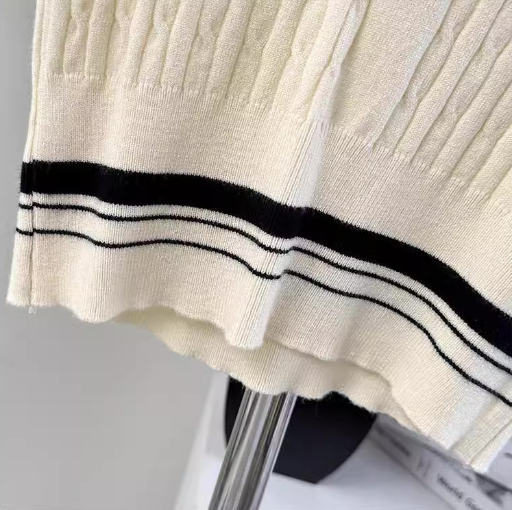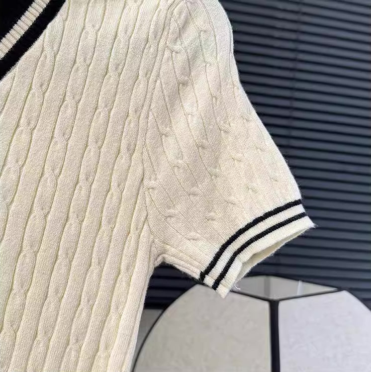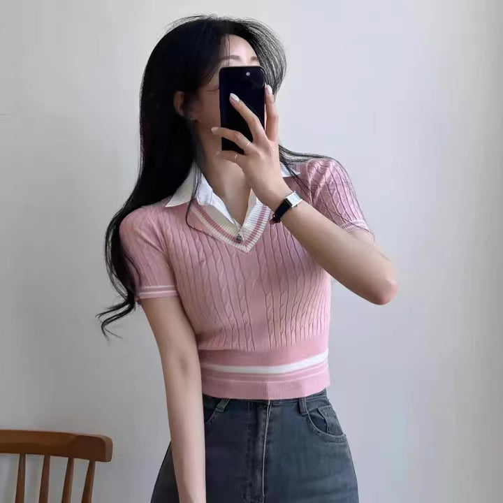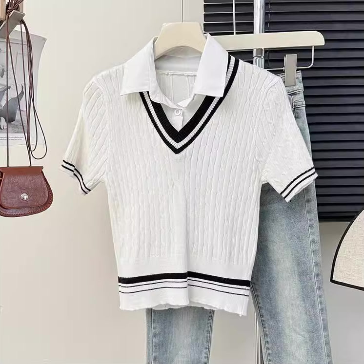 Faux knitted v-neck and blouse two-piece for an easy layered look. Buttons down at the neck.