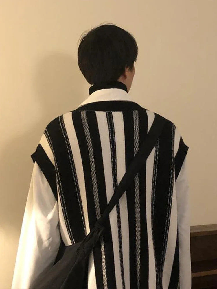 Knitted Sweaters for Men Y2k Vintage Waistcoat Man Clothes Striped Sleeveless Vest Aesthetic Black Korean Fashion Casual Cotton