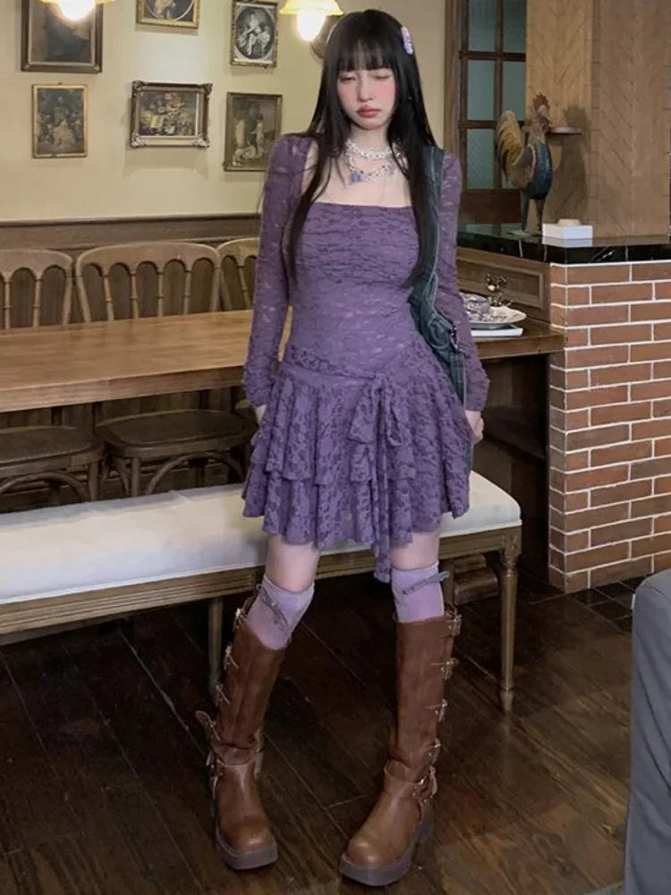 Lace Basic Causal Women Dress Square Collar Slim Waist Tunic All Match Dresses Y2k Aesthetic Sexy Fashion Elegant Vestidos