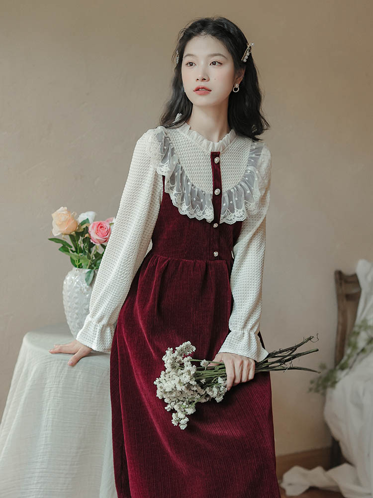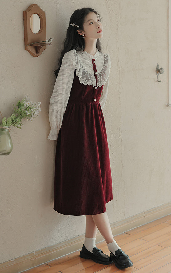 Thick corduroy ribbed sweater dress in a midi length with waffle chiffon sleeves and neckline with pearl buttons. Button closure at the back. Stretchy waistline.