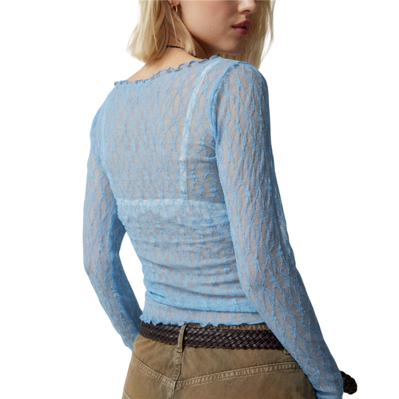 Lace Tops for Women y2k Clothes Sheer See Through Round Neck Long Sleeve Ruched T Shirt 2000s Clothing Party Clubwear