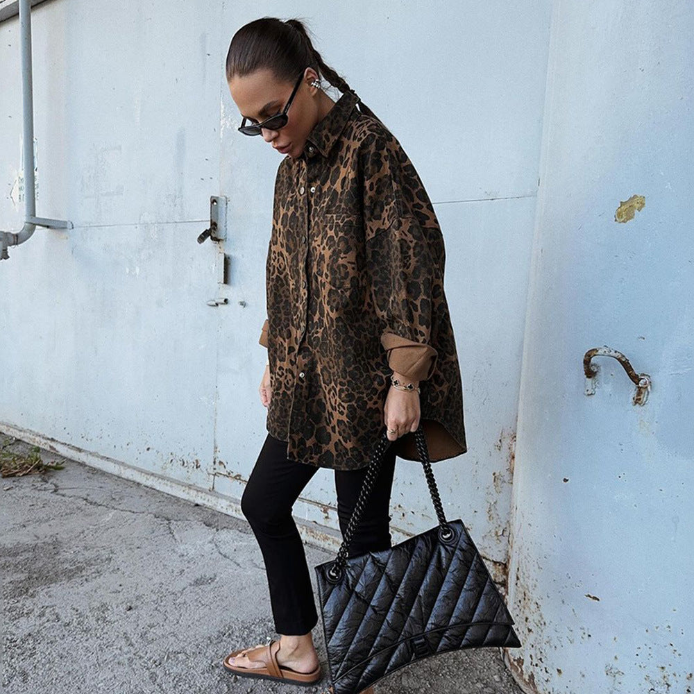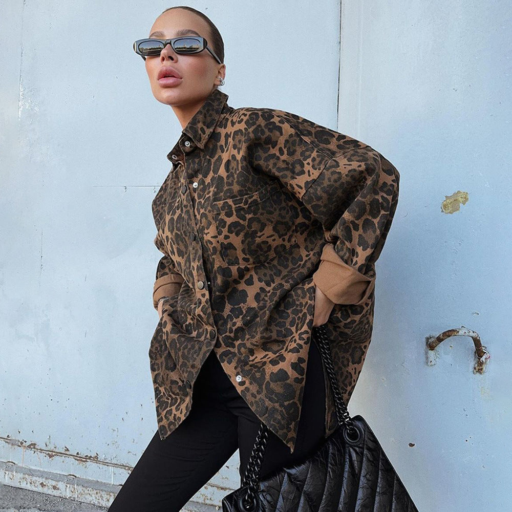 Product Features: Women's oversized shirt, leopard print decoration, lapel long sleeves, chest pockets, buttons, fashionable and good-looking.