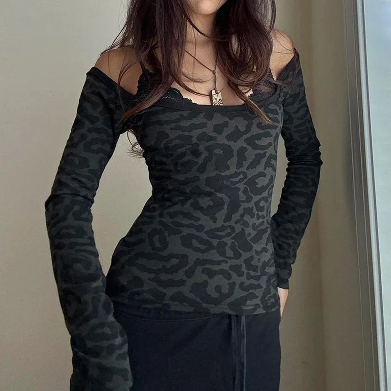 Leopard Print Black T Shirt Women Lace Patchwork Full Sleeve Tee y2k Chic Off-shoulder Cropped Top Vintage 2000s Clothing