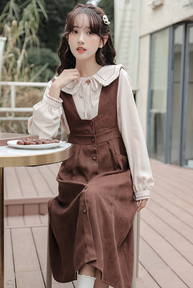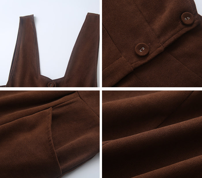Take a trip to the bakery for a sweet treat in this suede-blend button up pinafore dress with thick shoulder straps. low angular neckline and side pockets.
