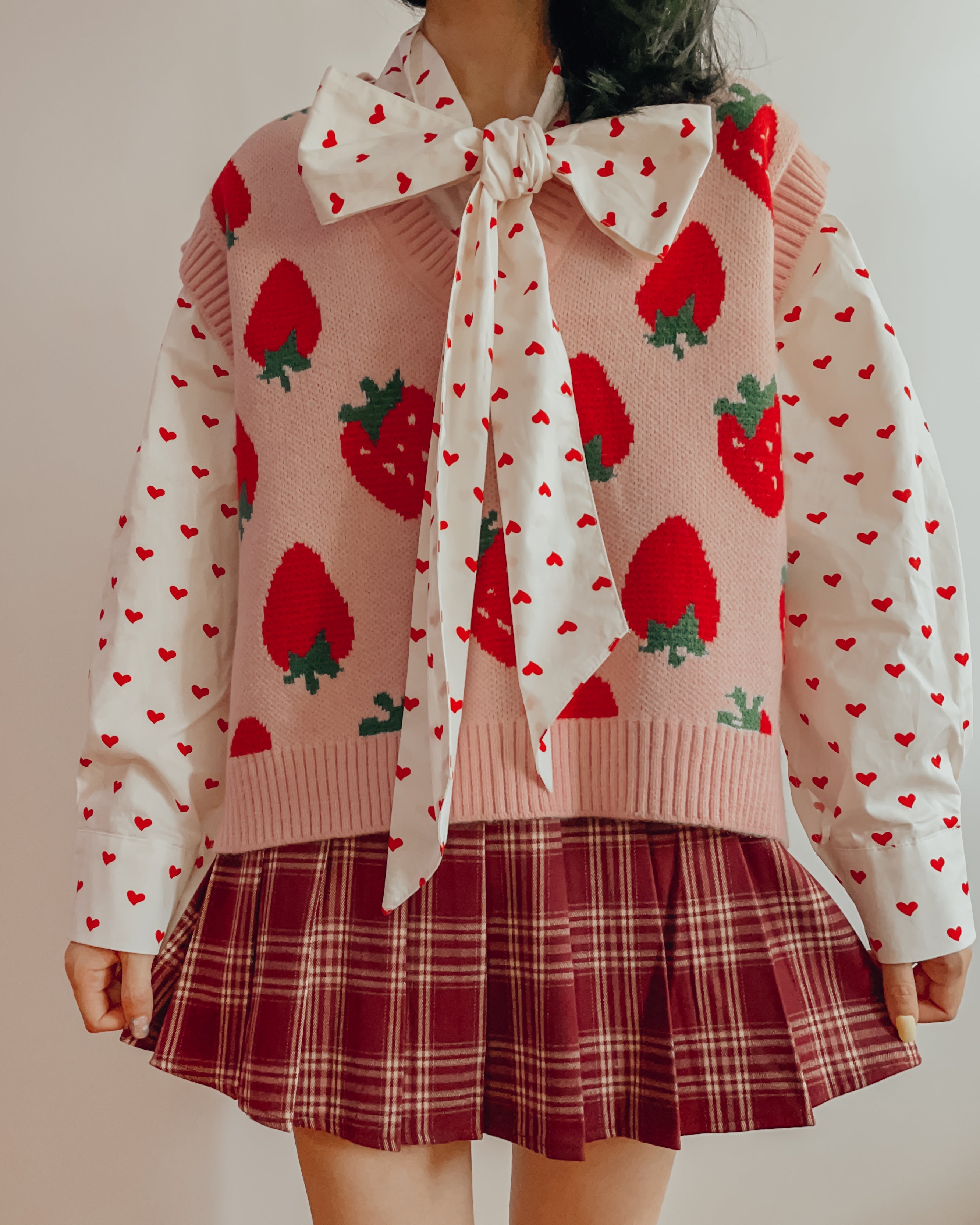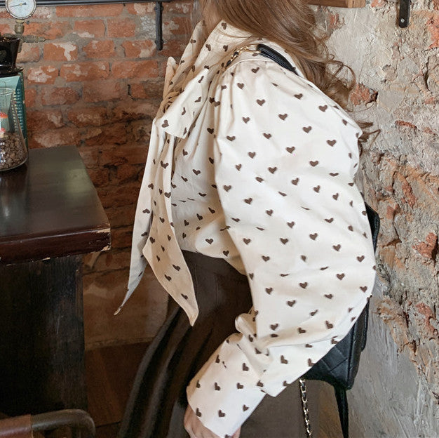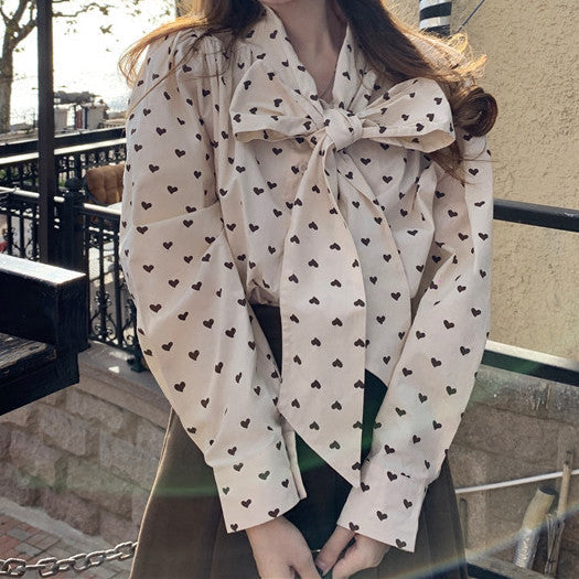 Long balloon sleeve button up shirt with little hearts all over and a tie up neckline.