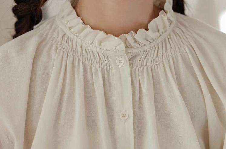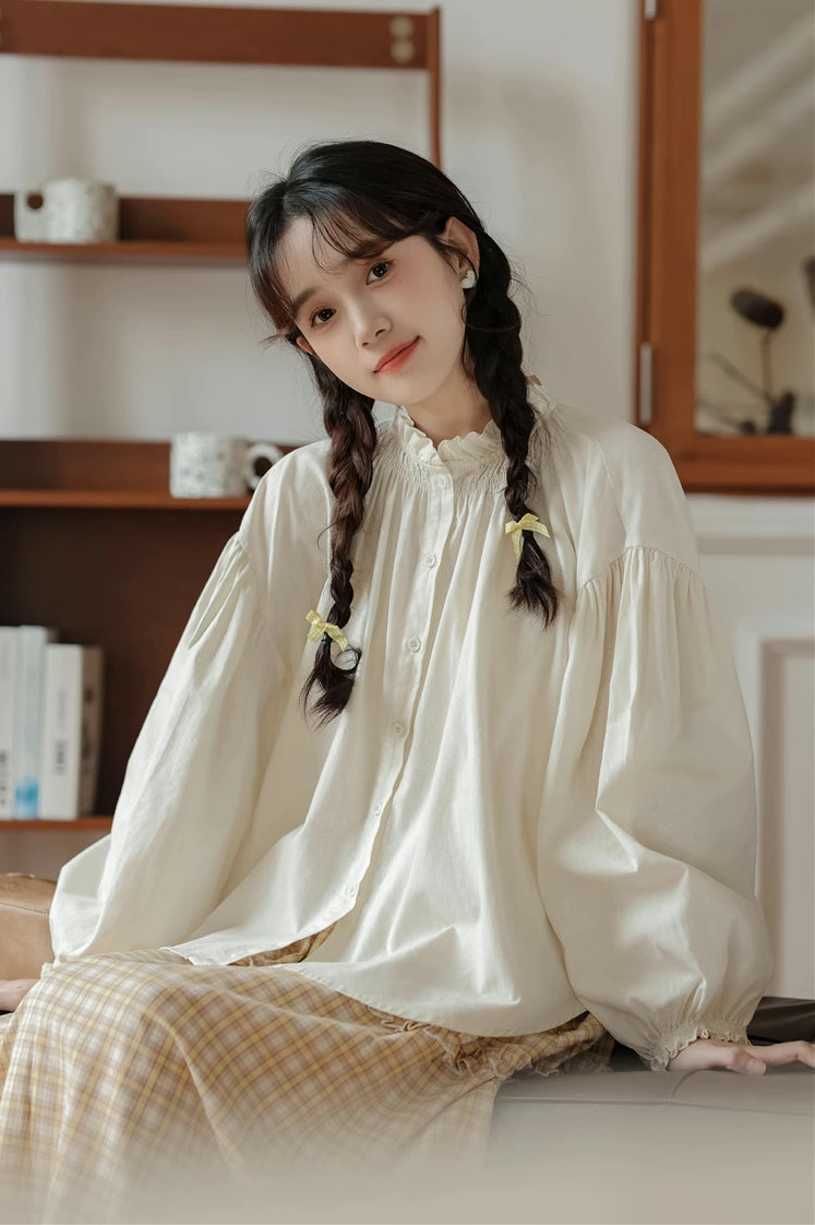 Baggy batwing blouse with a button-down front. long puff sleeves and a ruffled high neckline.