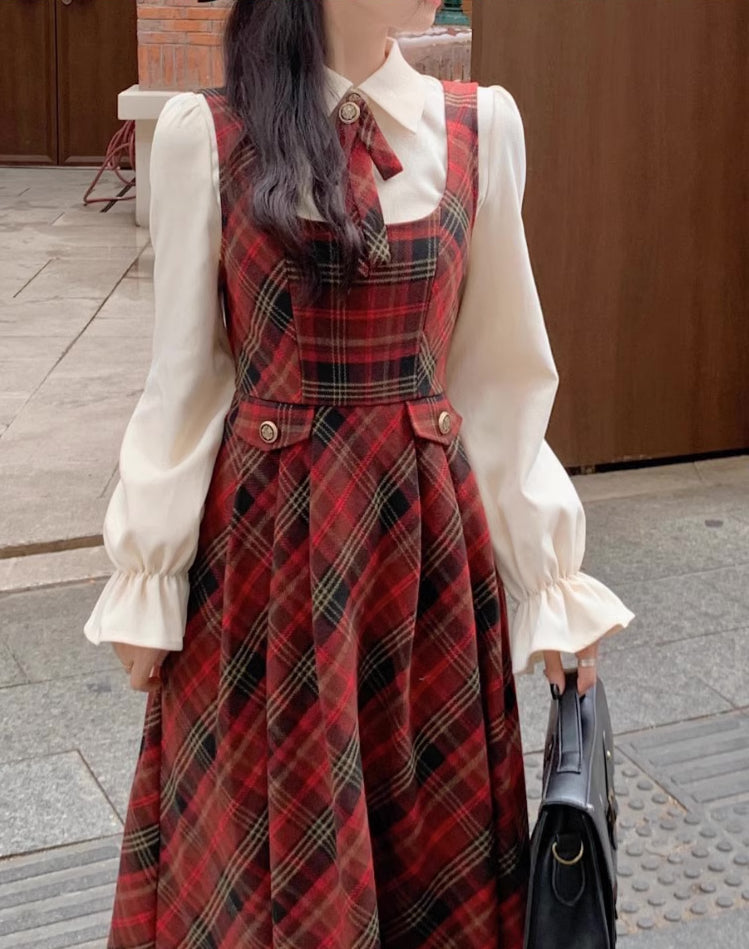 Tweed pinafore dress with a scoop square neckline. faux pockets. removable neck pin and a pleated midi skirt. Opens with a concealed back zipper. Lined.
