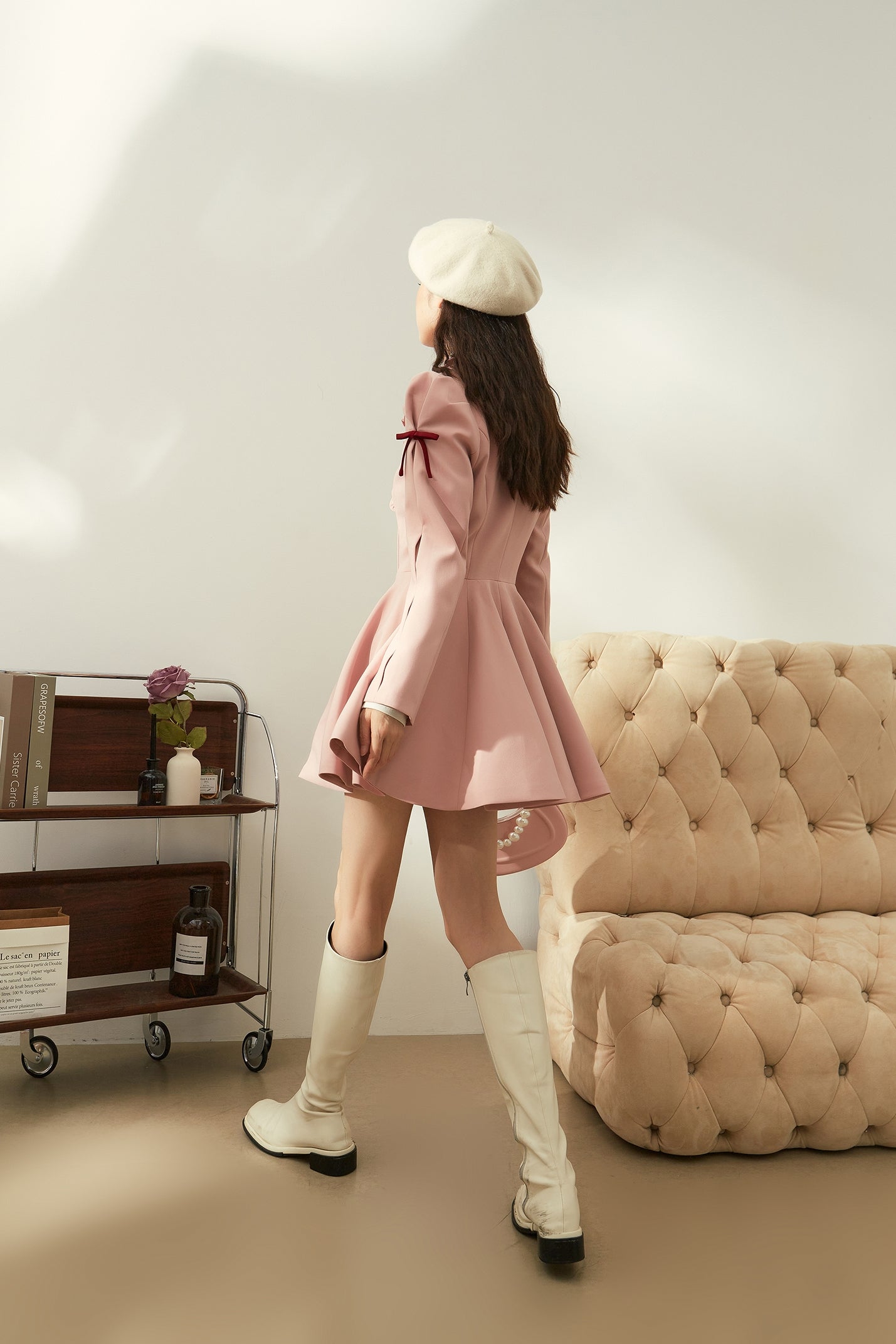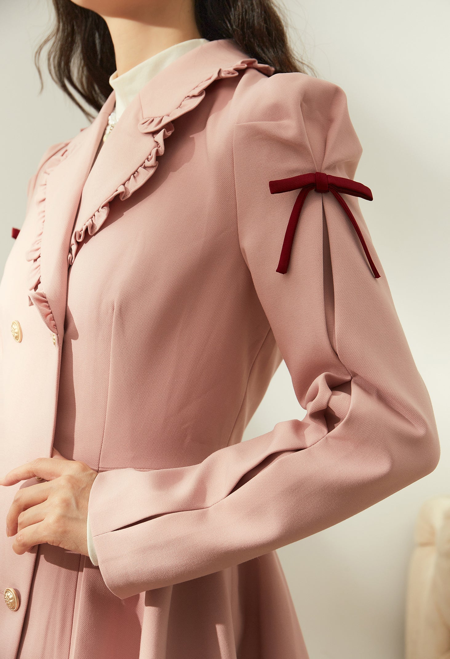 Sweet and chic fit and flare blazer dress with double breasted button openings. frilly notched lapels. pleated flare skirt. puffy shoulders and ribbon details on sleeves. Lined.