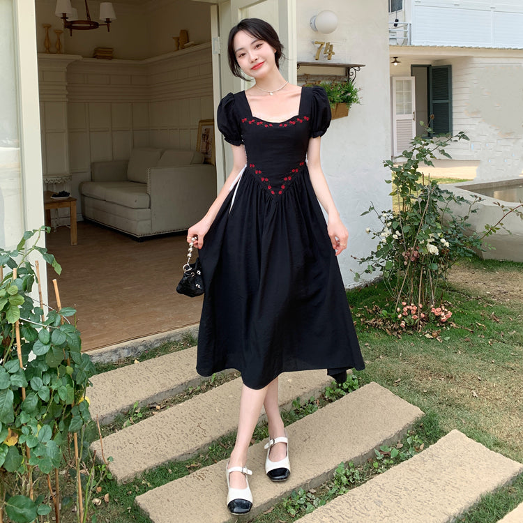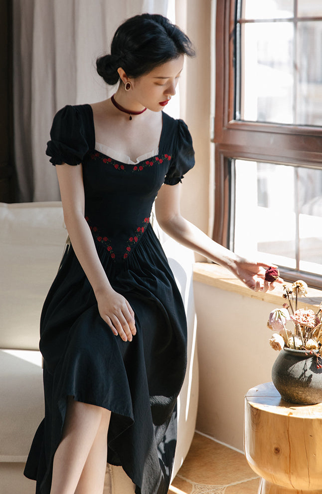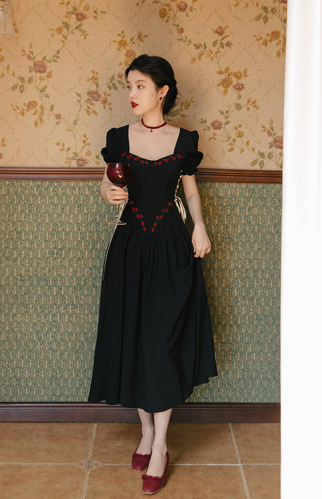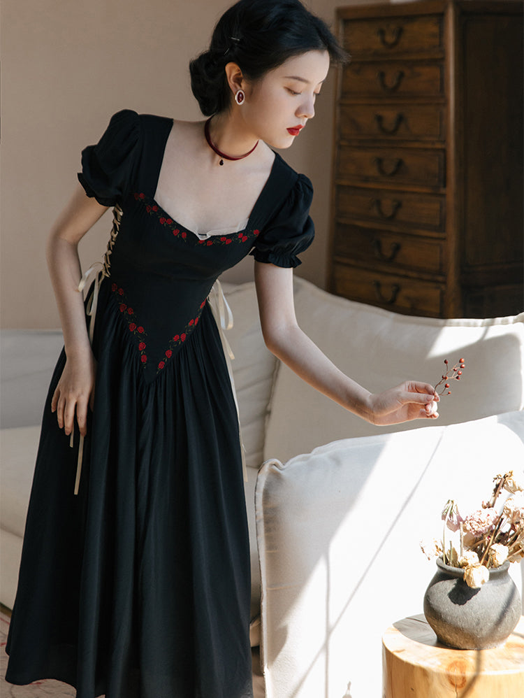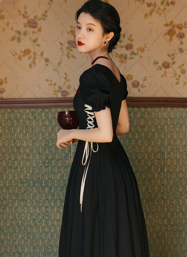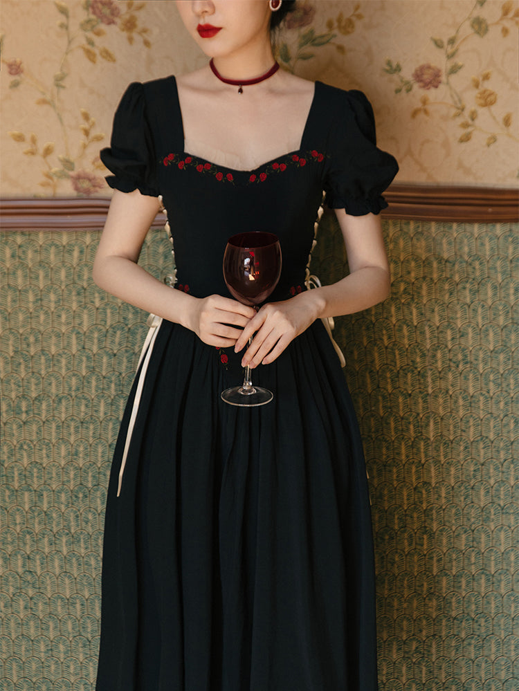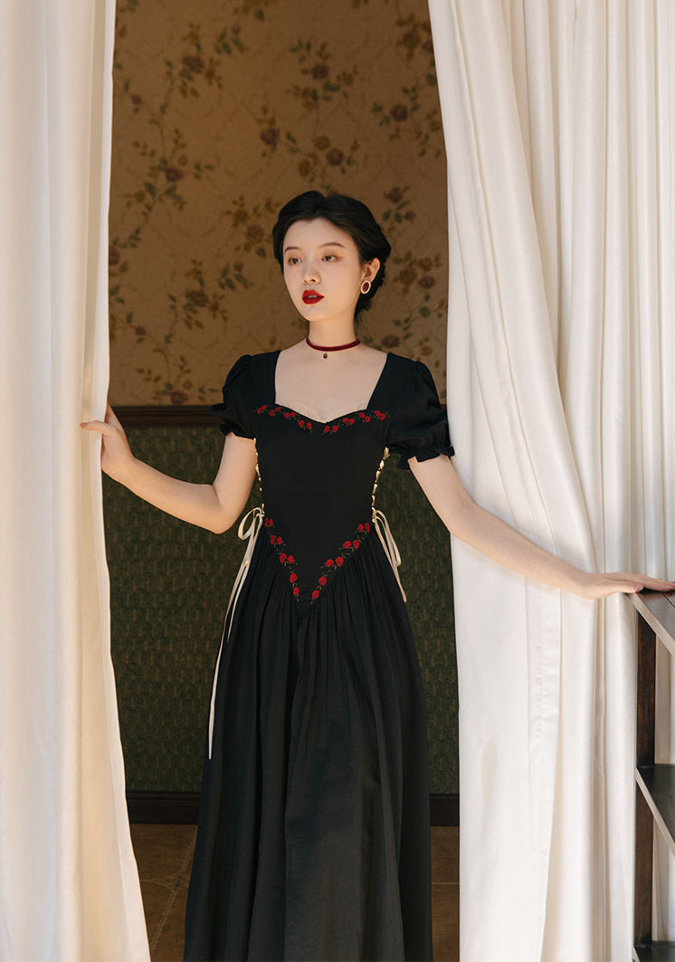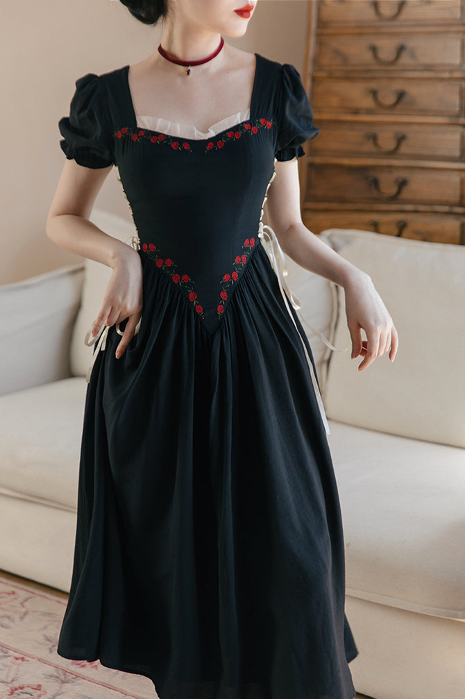 Endlessly elegant. Sophisticated black dress with short puff sleeves. sweetheart neckline with mesh frills and rose embroidery. laced up sides. basque waistline. slight v-backline and midi length skirt. Concealed back zipper.