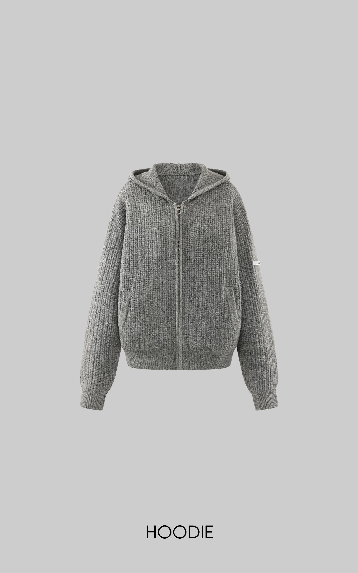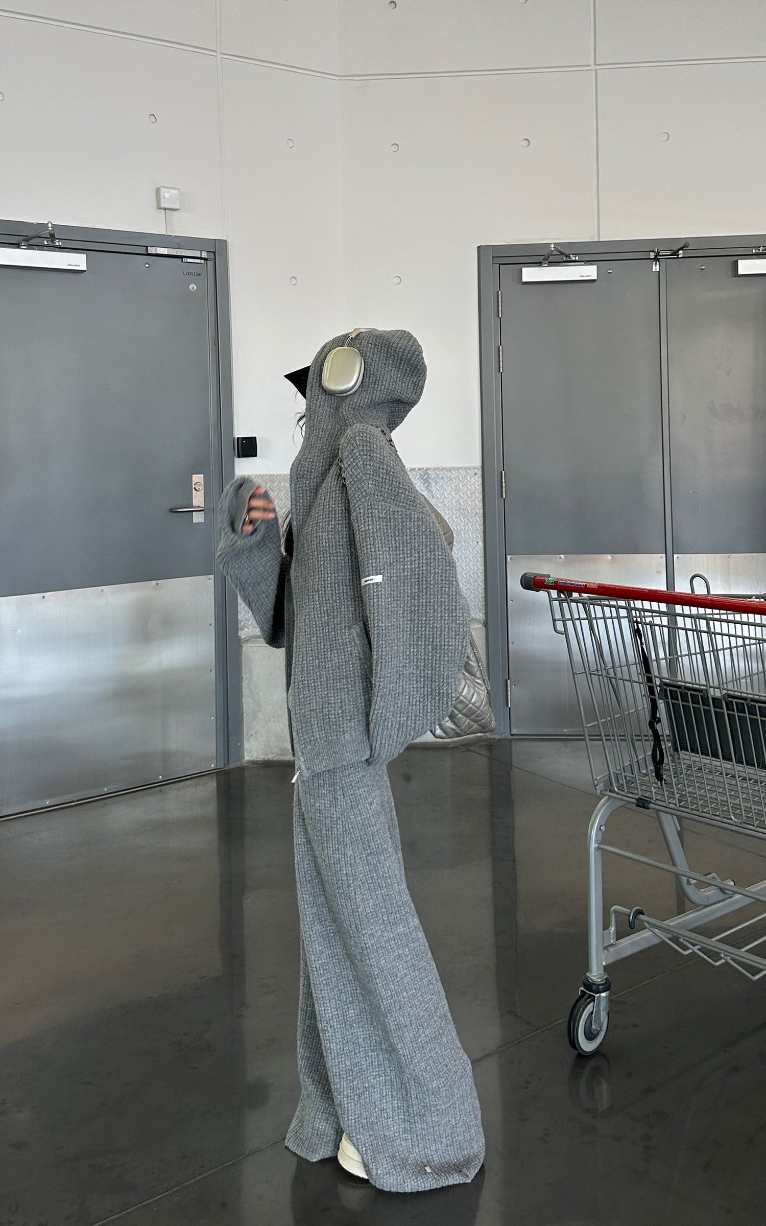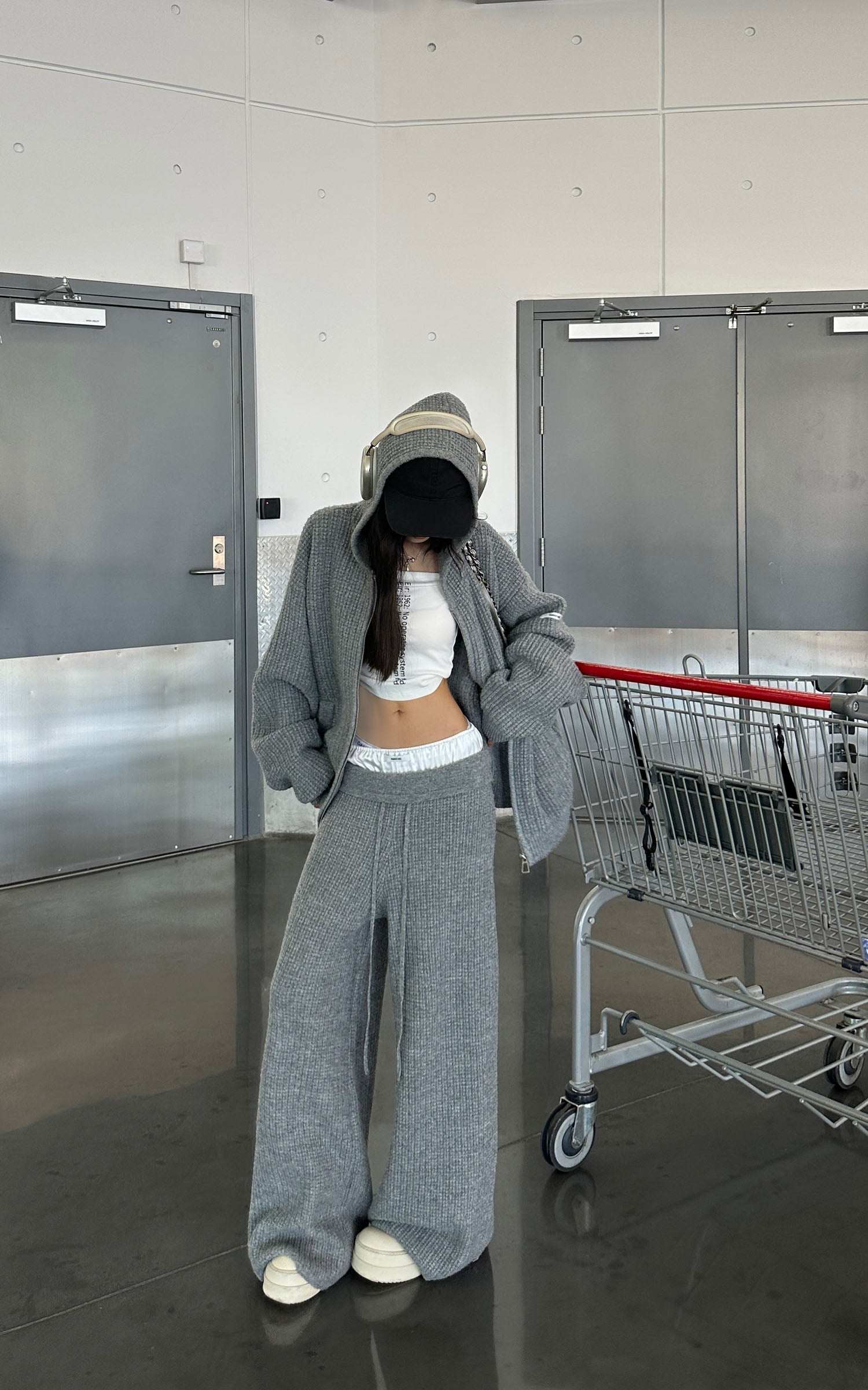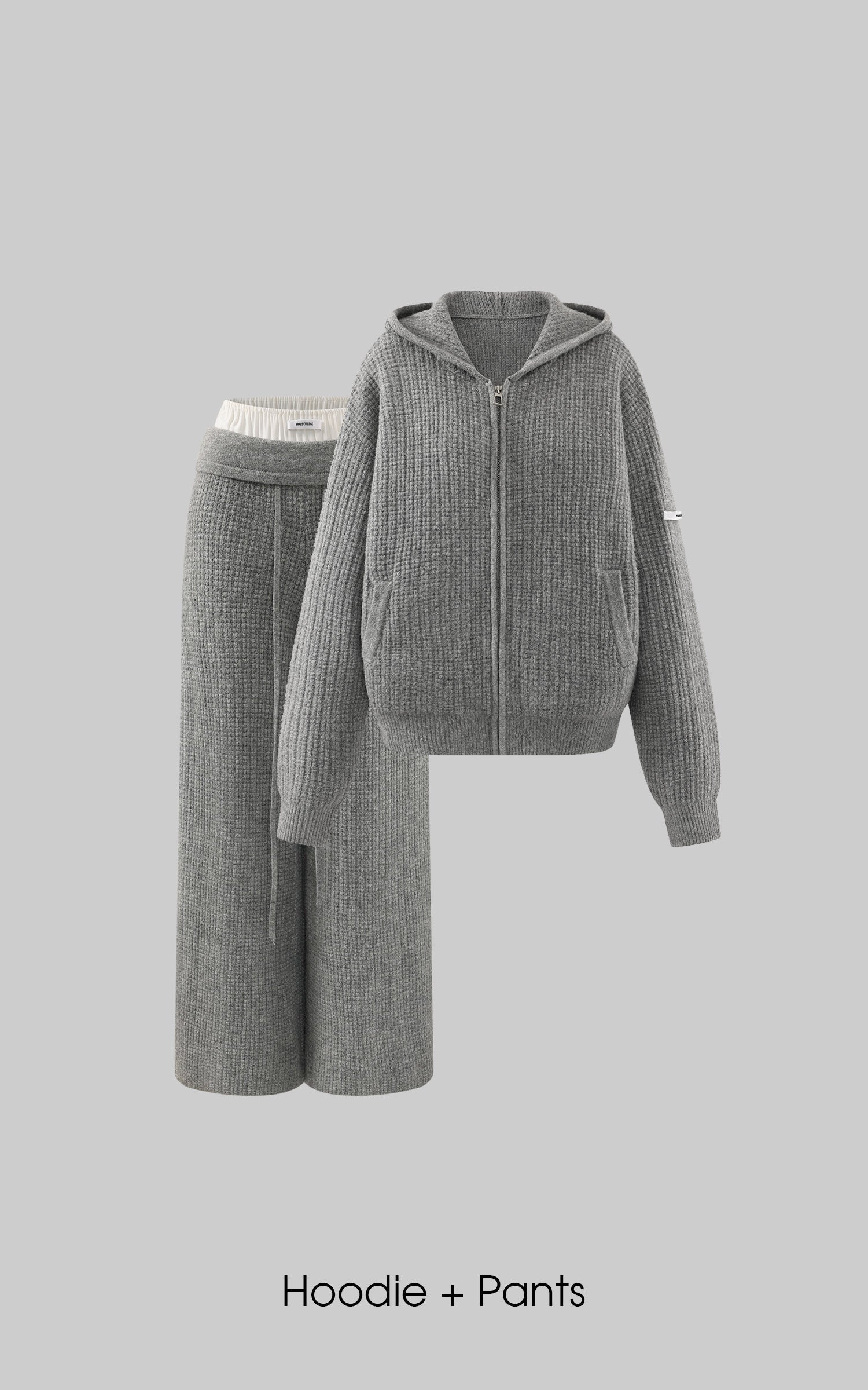 A textured knit set featuring an oversized hooded jacket and wide-leg pants. designed for a relaxed yet structured silhouette. Crafted from thick. soft yarn with a subtle ribbed texture. it blends comfort with a directional edge. Dropped shoulders and voluminous sleeves enhance the laid-back feel. while the adjustable drawstring waist adds ease of wear. Effortlessly transitions between indoor ease and urban minimalism.