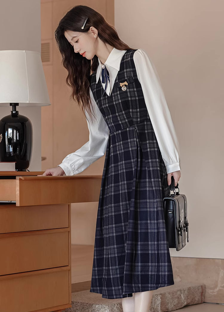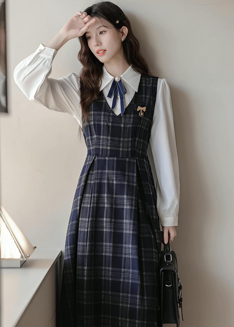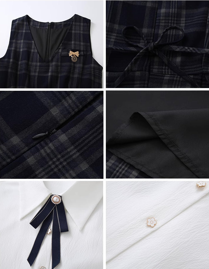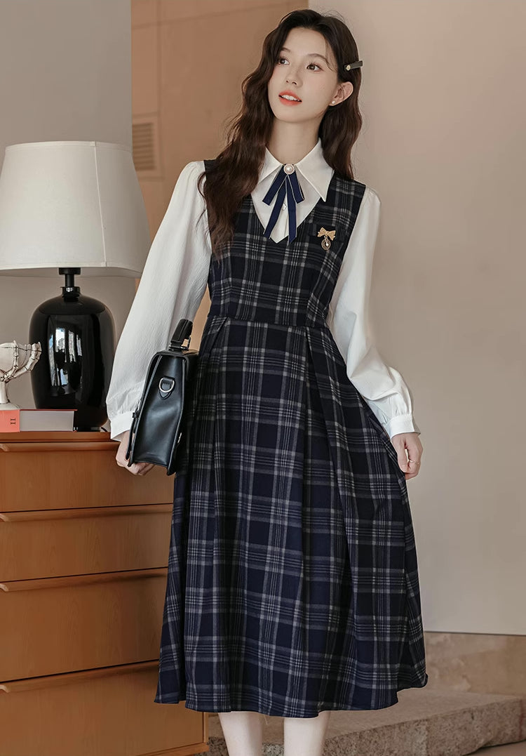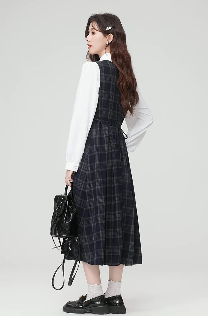Two piece set featuring a basic plain white blouse with removable neck pin to layer with a plaid v-neck pinafore with a tie-waist and pleated midi skirt. Opens easily with a concelaed back zipper.