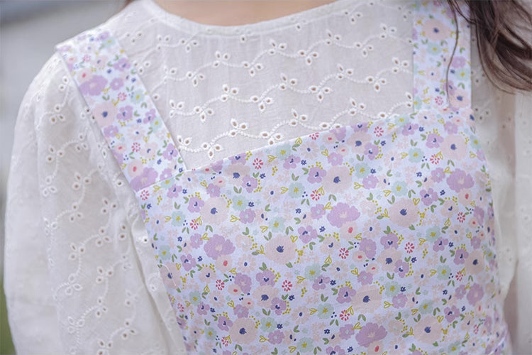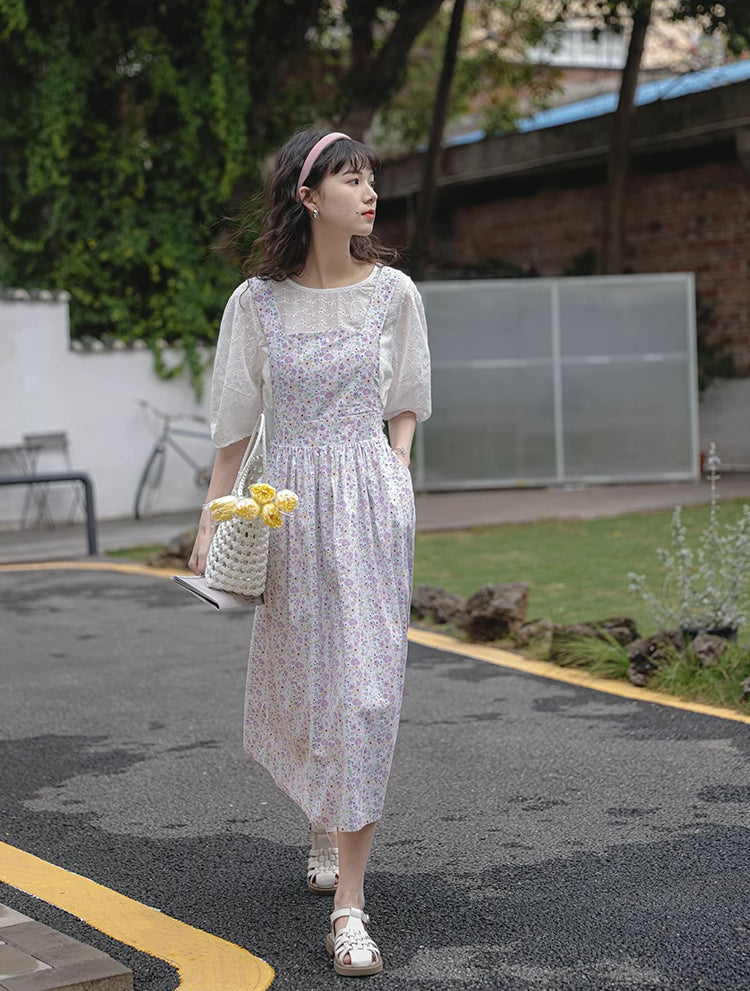 Lightweight chiffon pinafore dress in a midi length with an apron bib. elasticized waist back. adjustable button straps. self-tie waist straps and side pockets.