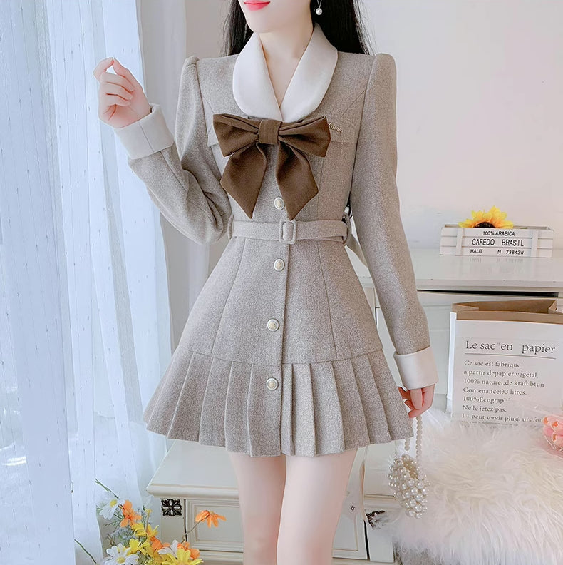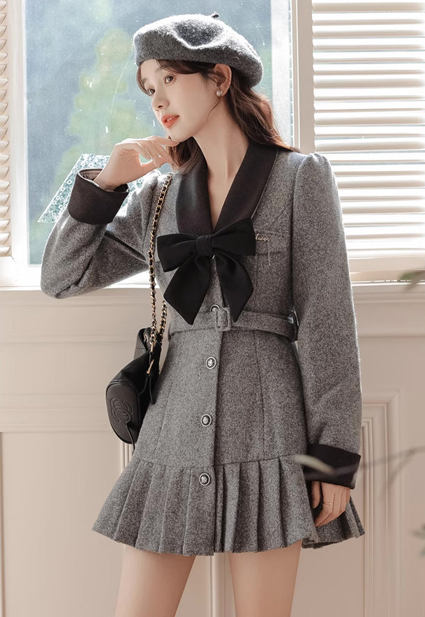 Short. sweet and chic mini dress coat with structured shoulders. a contrast peter pan collar. removable decorative bow. button front. pleated hem and a waist belt.