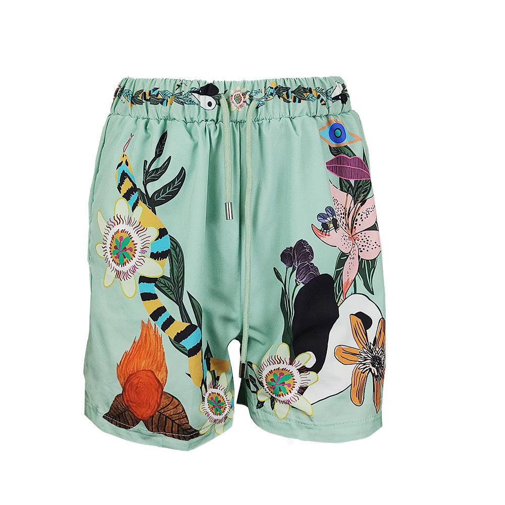 Design: Featuring a printed beach outfit, featuring a lapel button up shirt, short sleeved V-neck shirt, elastic waist wide leg shorts, tropical printed summer beach set, and loose fitting casual set.
