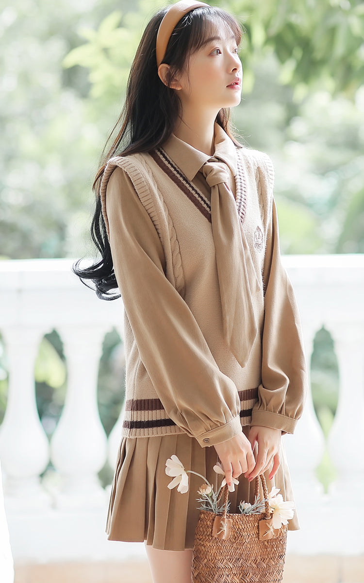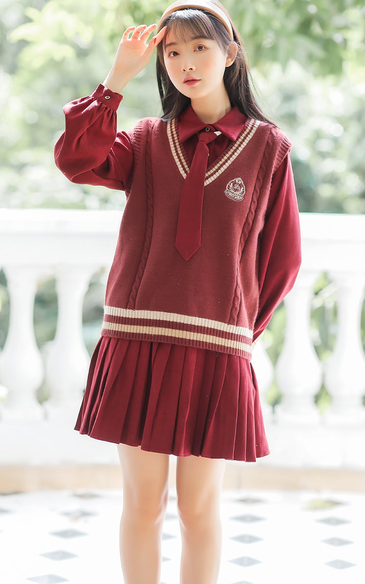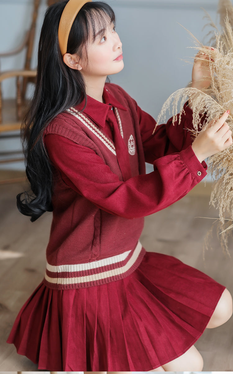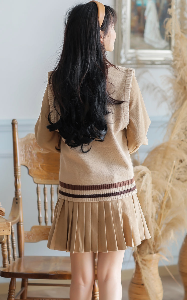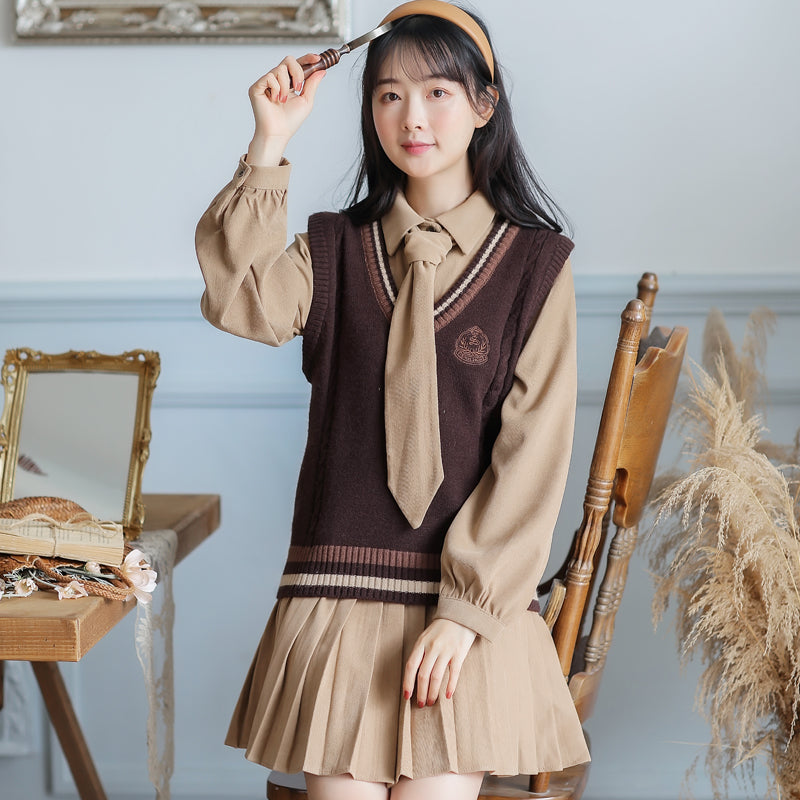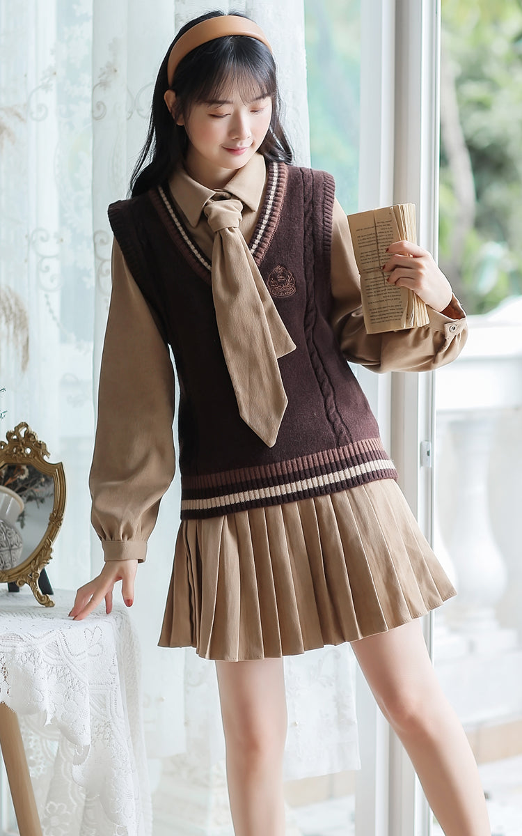 Back to school outfit sorted. This chic and preppy set includes a knitted vest with varsity striped trims. braided details and an embroidered crest. together with a button up corduroy shirt dress with long sleeves and a pleated drop-waist skirt. Comes with a matching tie that attaches with an elastic band so there is no fussing about how to tie a tie.