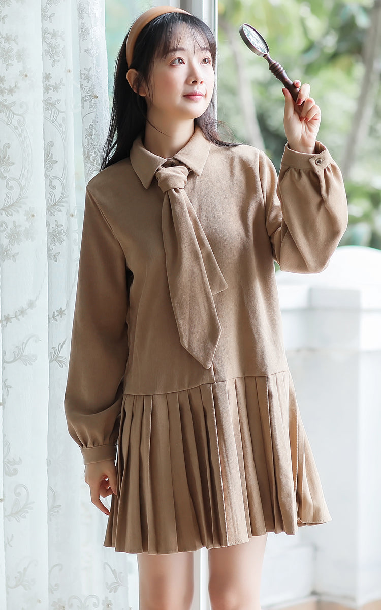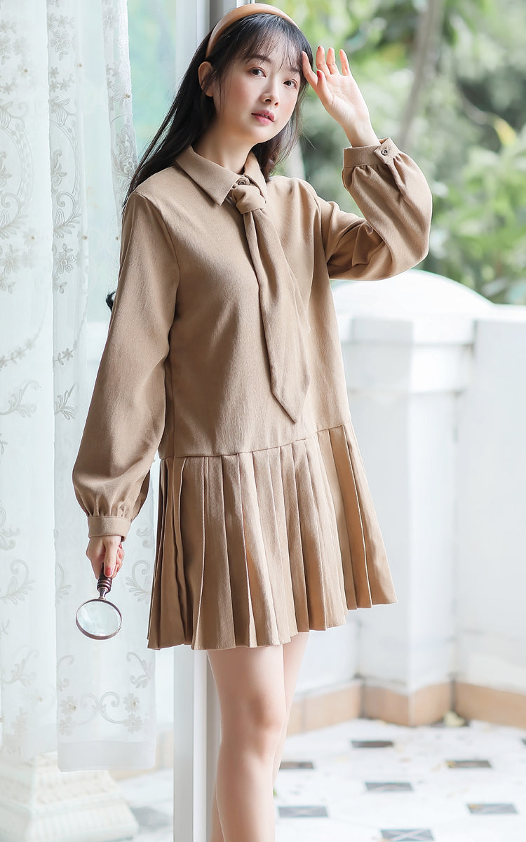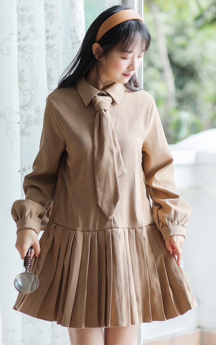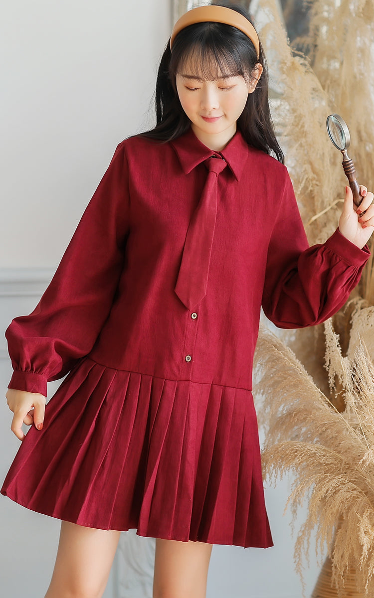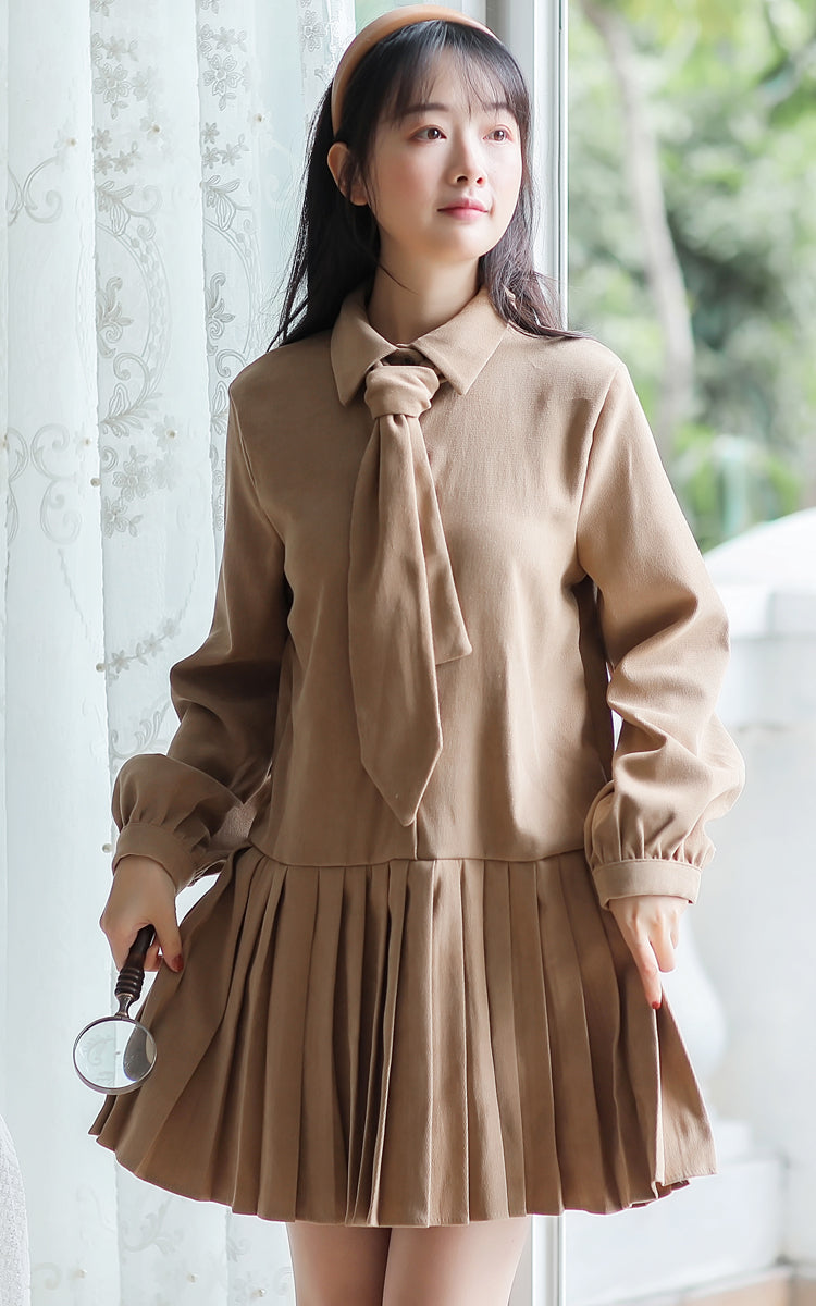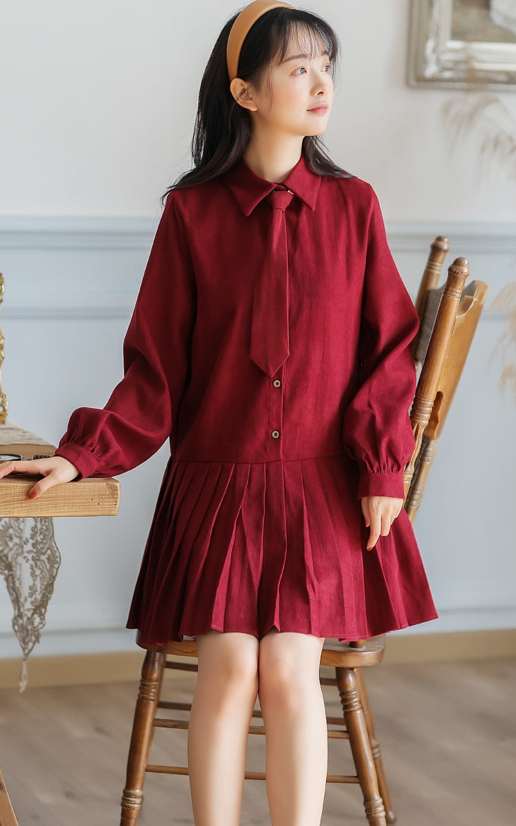 Back to school outfit sorted. This chic and preppy set includes a knitted vest with varsity striped trims. braided details and an embroidered crest. together with a button up corduroy shirt dress with long sleeves and a pleated drop-waist skirt. Comes with a matching tie that attaches with an elastic band so there is no fussing about how to tie a tie.