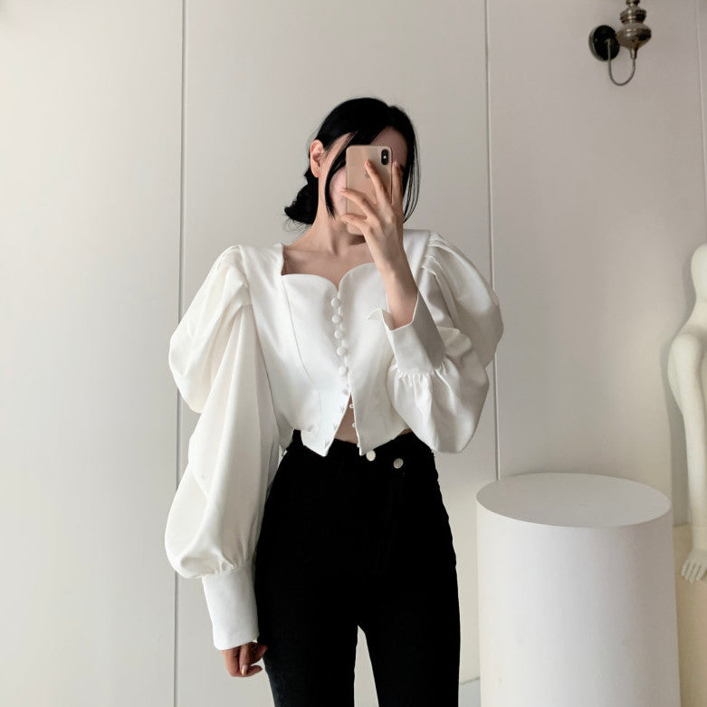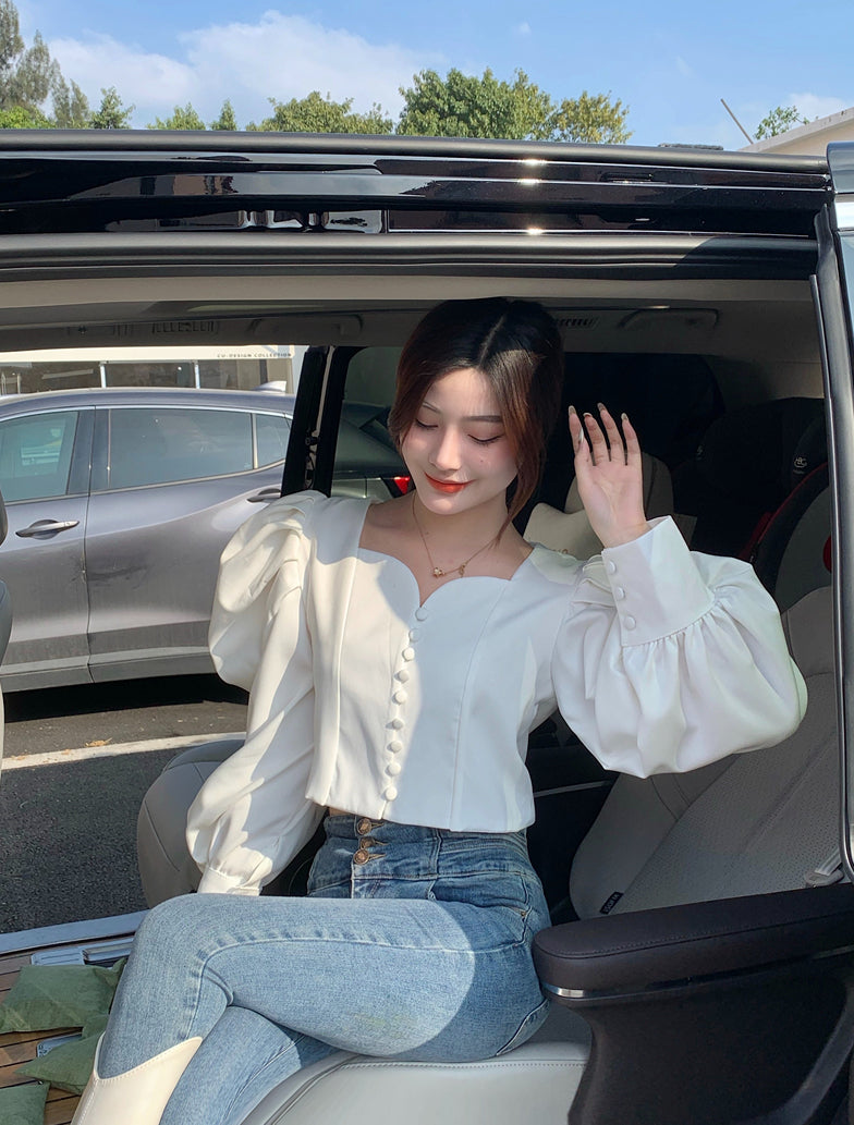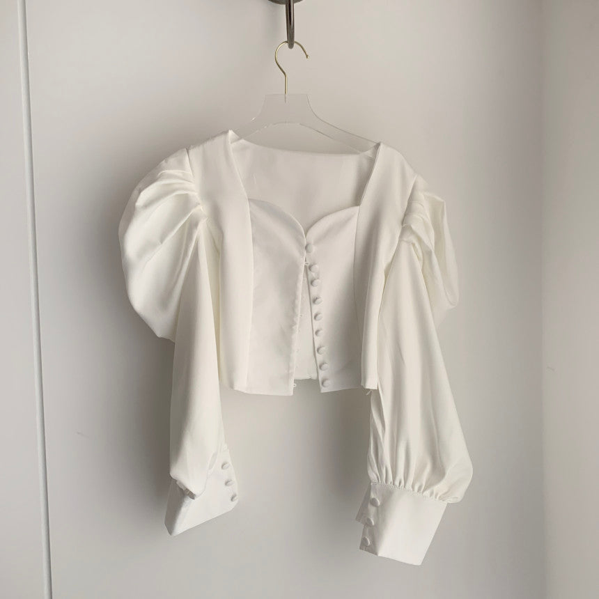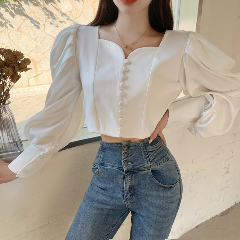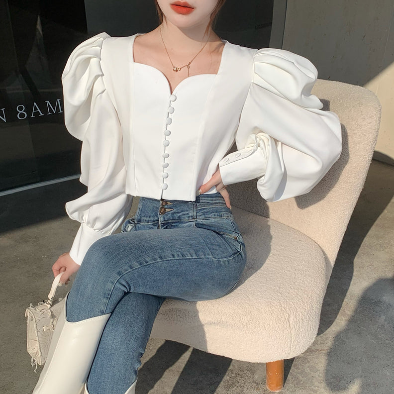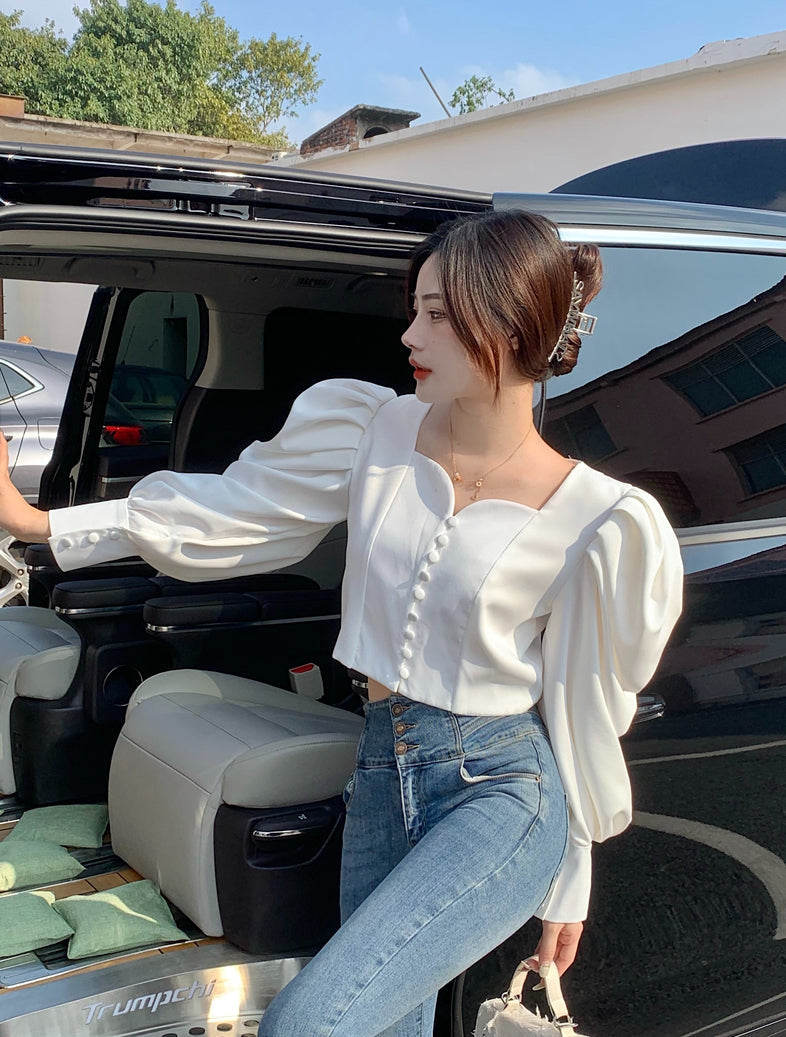 Make a statement in this blouse featuring a sweetheart neckline. loop button up front and oversized puffy blouson sleeves. Slightly cropped.