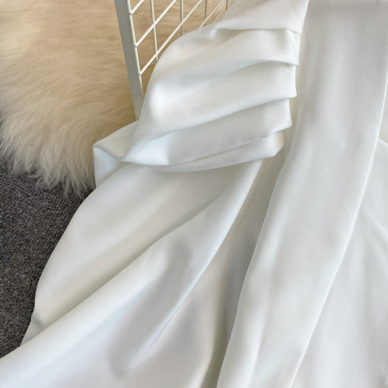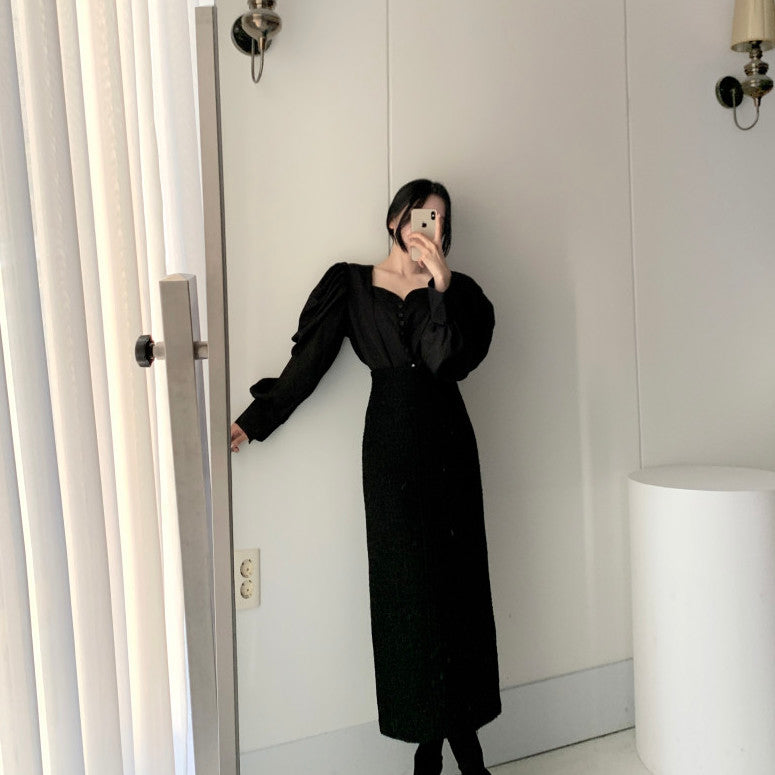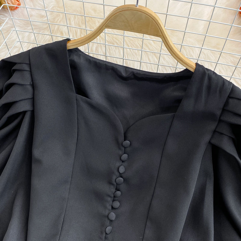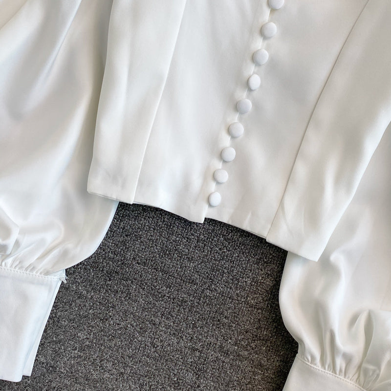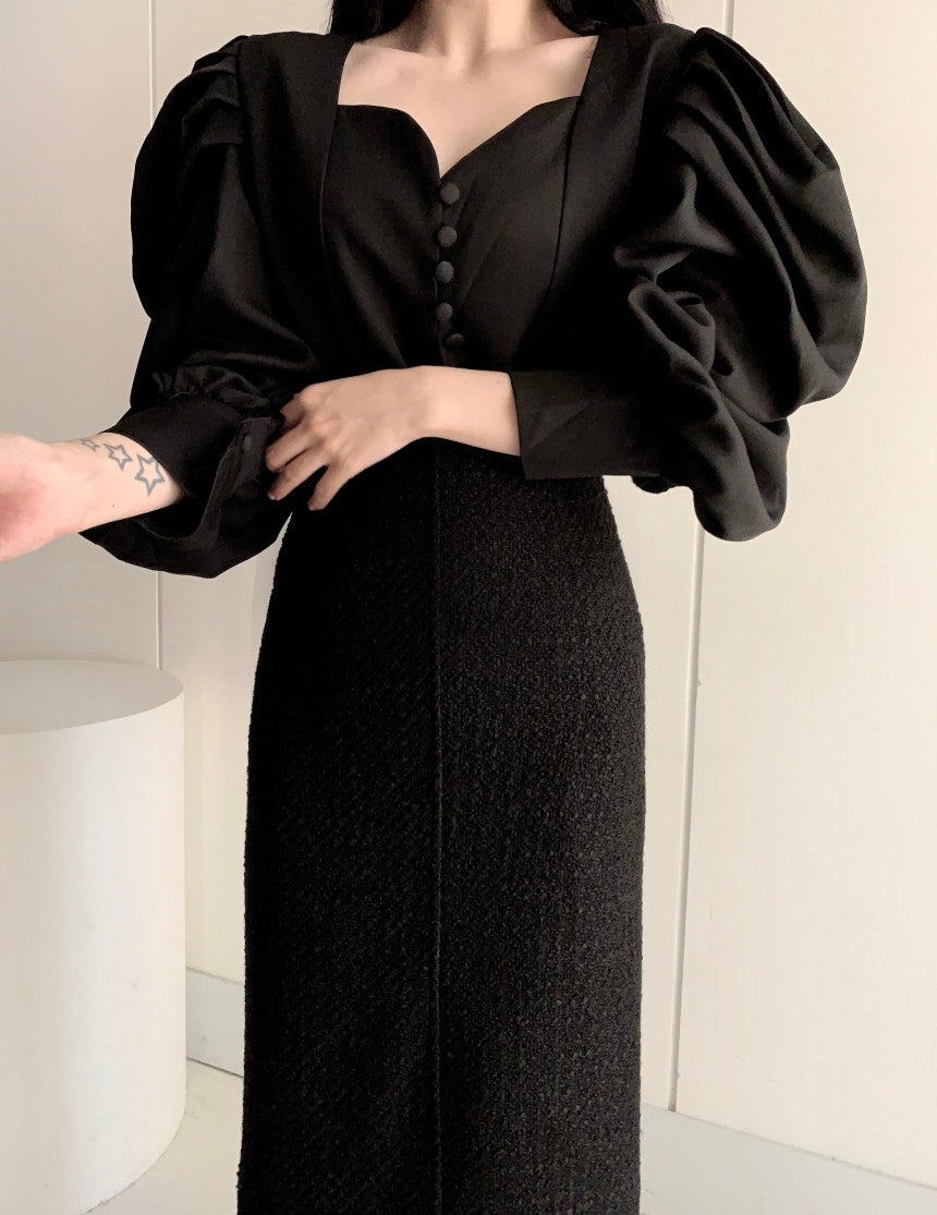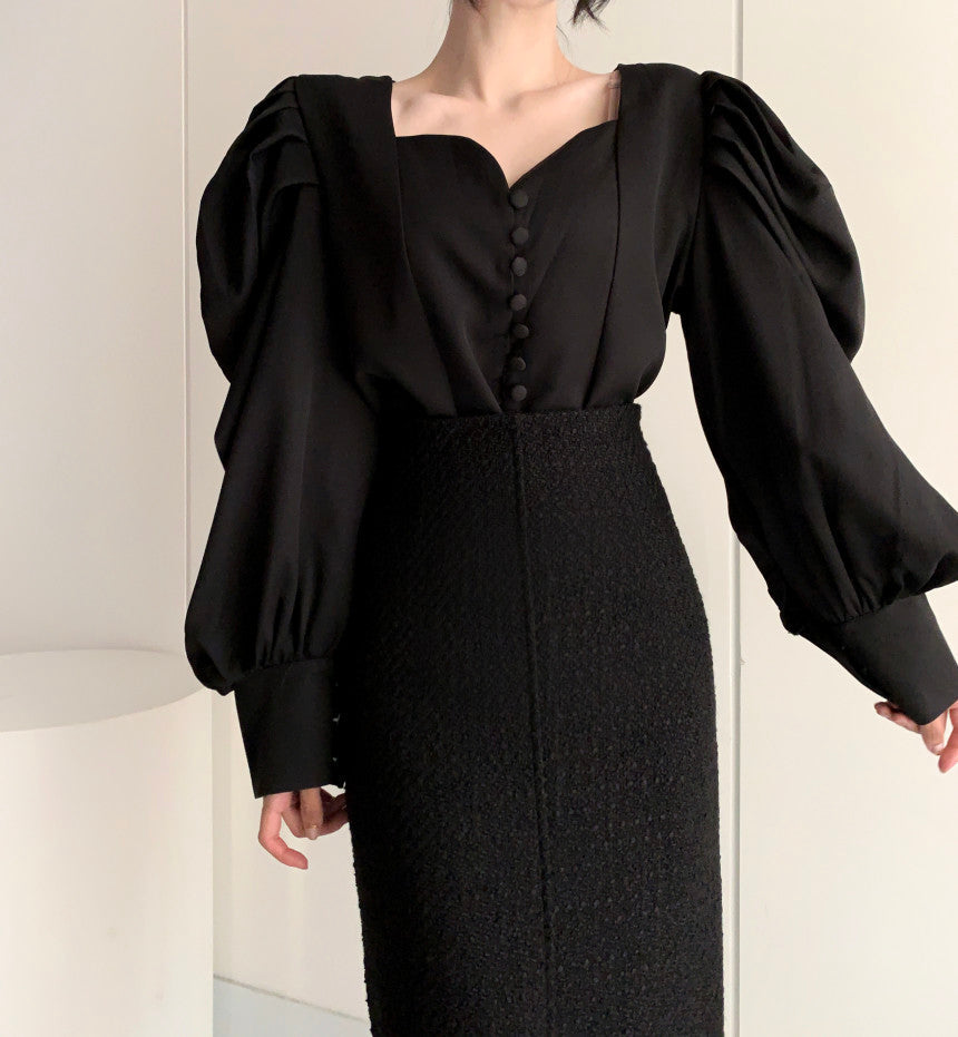 Make a statement in this blouse featuring a sweetheart neckline. loop button up front and oversized puffy blouson sleeves. Slightly cropped.