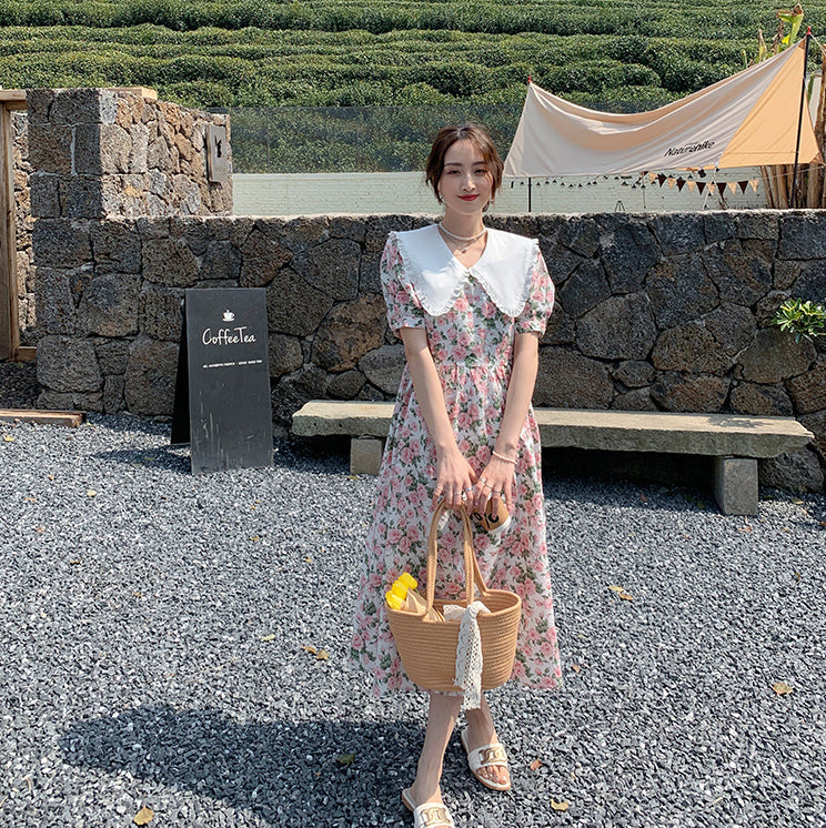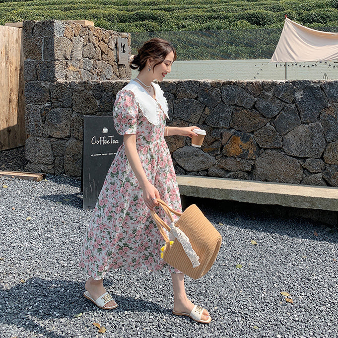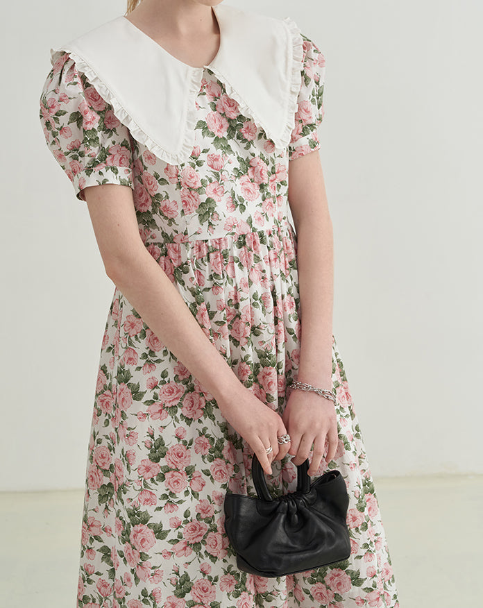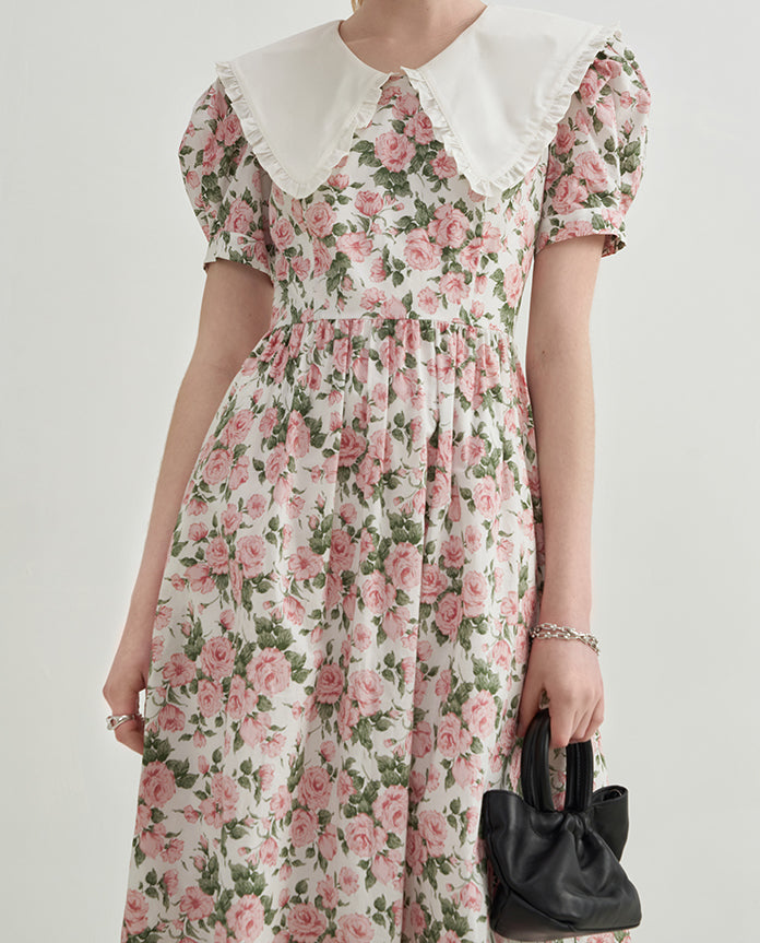 Sweet vintage inspired rose print midaxi dress with short puff sleeves and an oversized peter pan collar. Concealed back zipper. Lined.