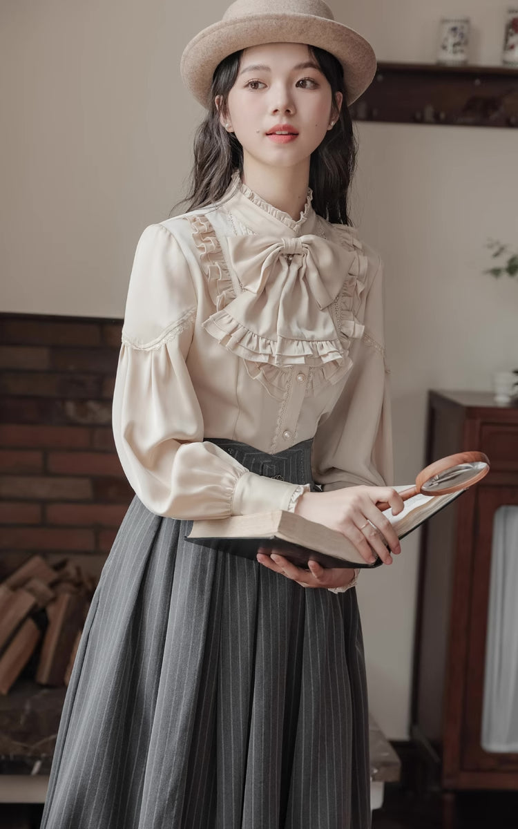 Victorian inspired button up shirt with a ruffled high neckline. chest ruffles. long blouson puff sleeves. delicate lace trims and a removable bow.