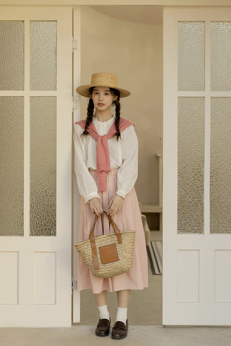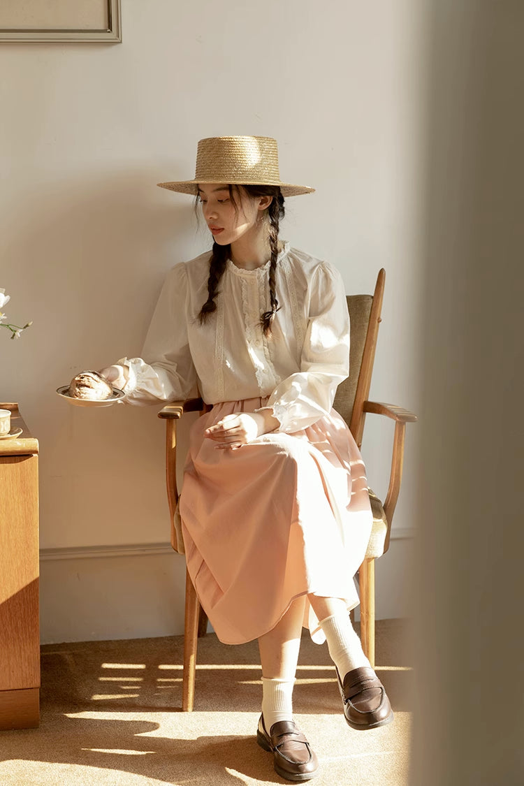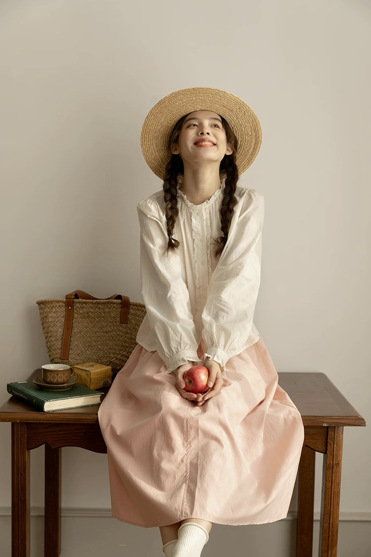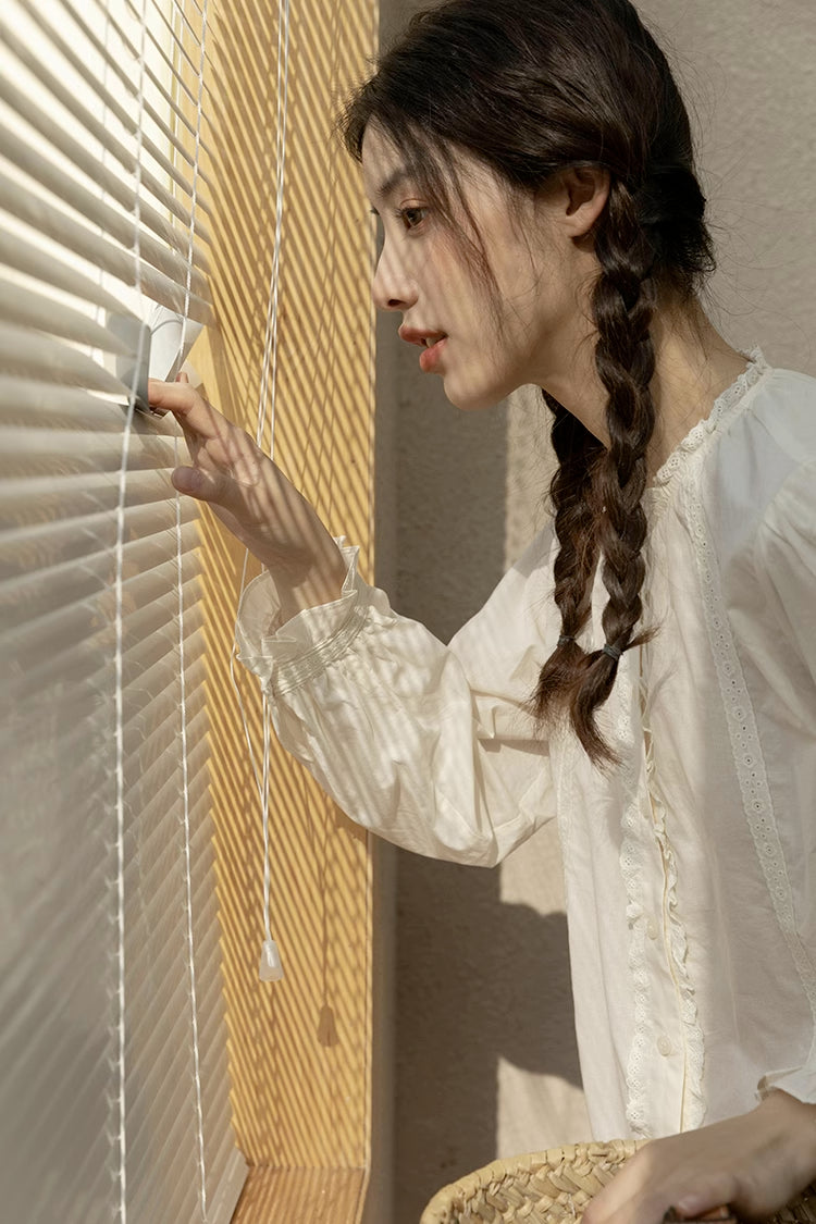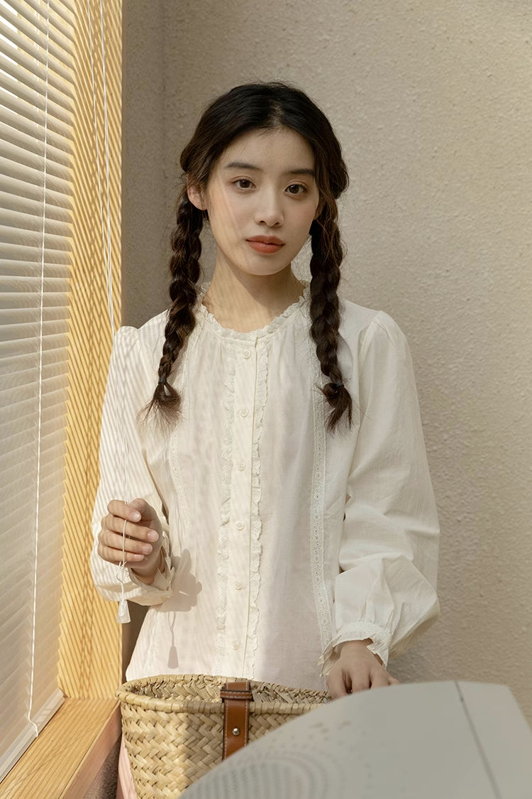 Long sleeved high neck button down shirt with lace broderie trims and ruffled cuffs.