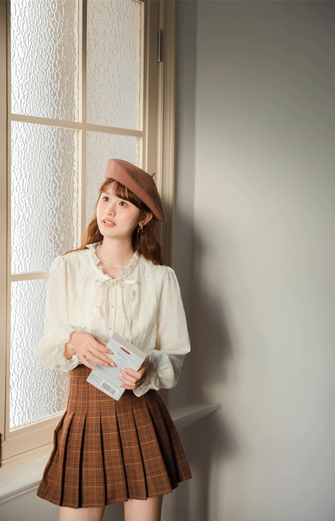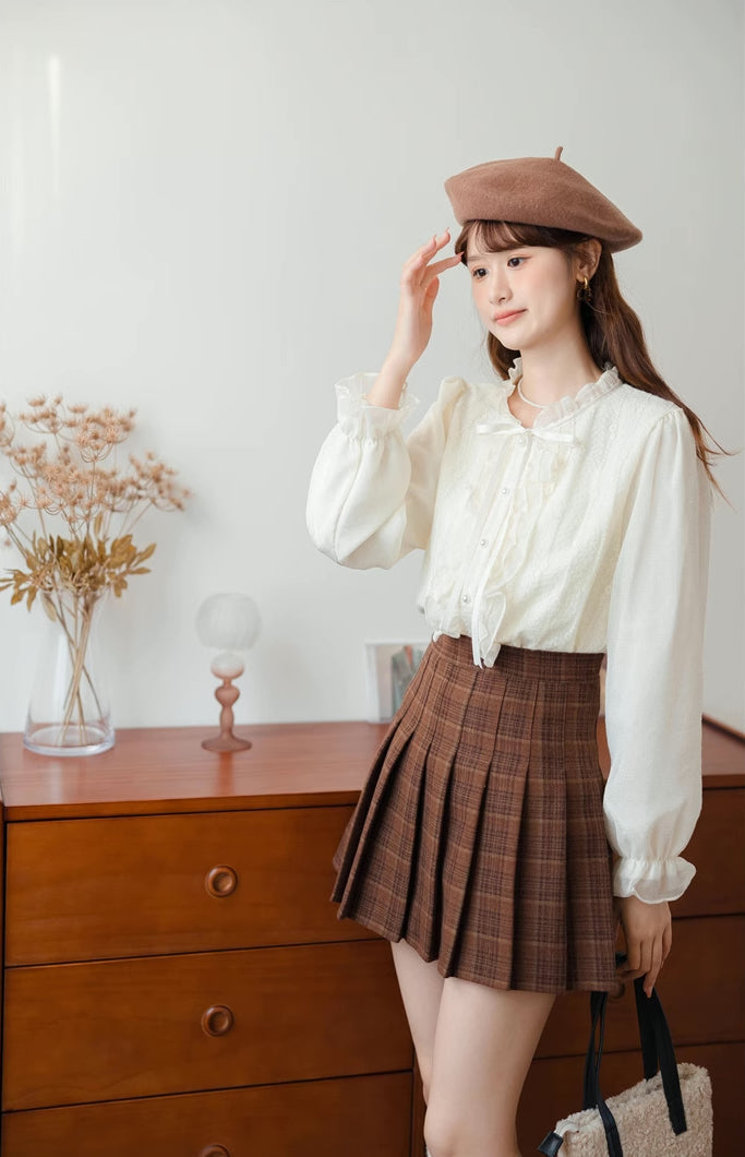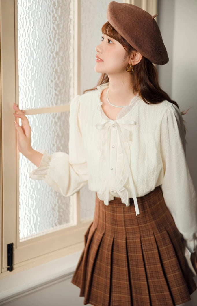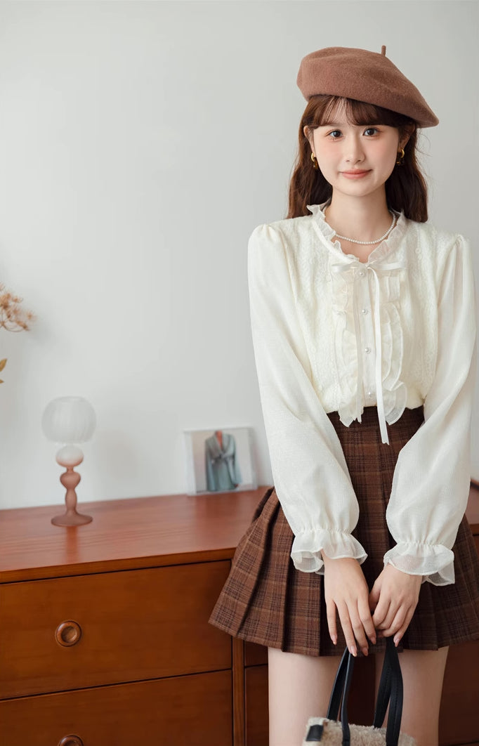 Button up shirt with a ruffled round neckline. tie-up neck ribbon. ruffled front. lace patterned bodice and long chiffon sleeves with frilly cuffs.