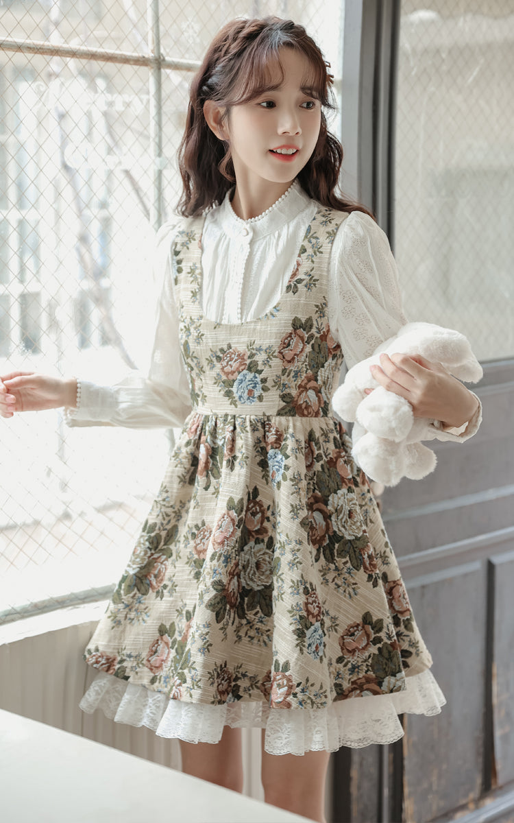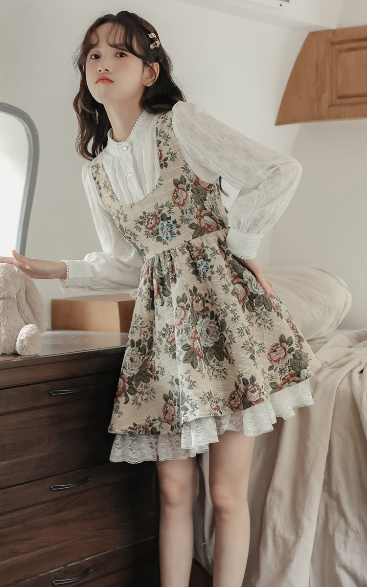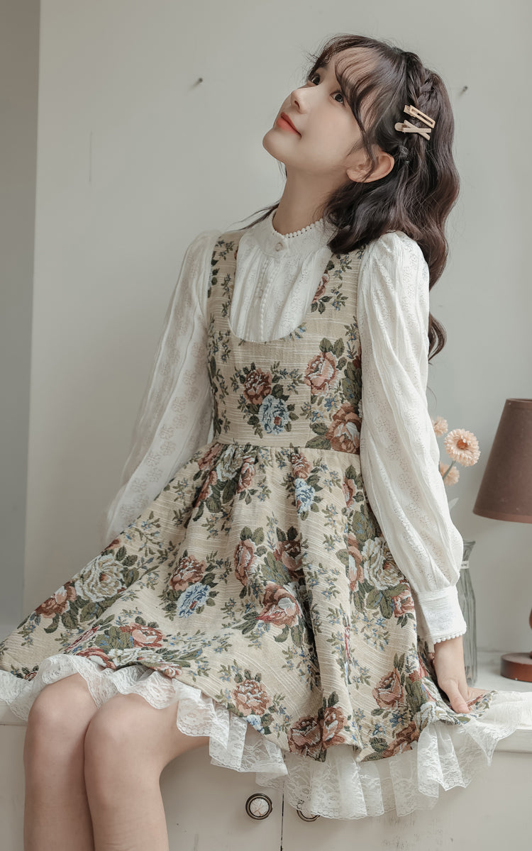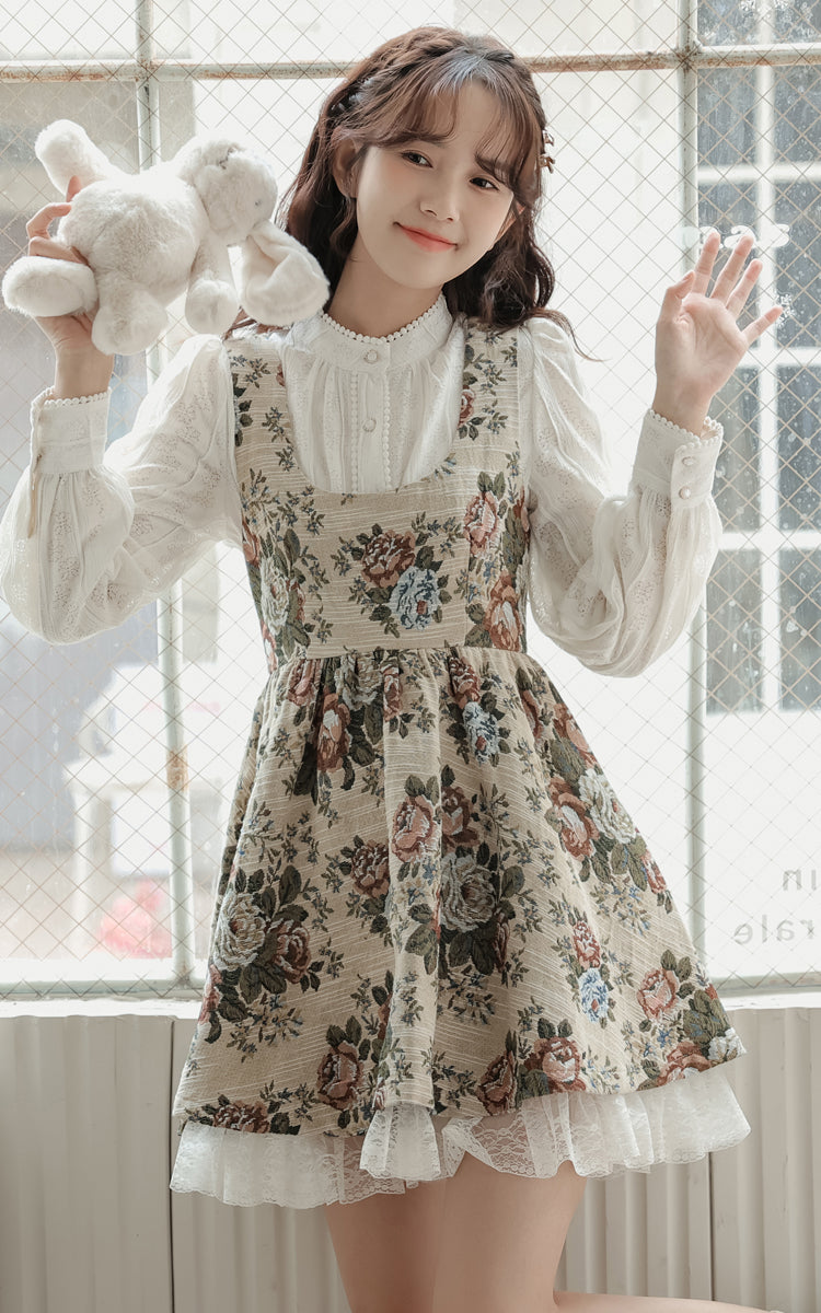 Absolutely adorable babydoll dress in a vintage rose jacquard fabric. with a low scoop neckline. puff out skirt and lace trimmed hem. Layer it with a delicate lace blouse for extra sweetness. Concealed back zipper.