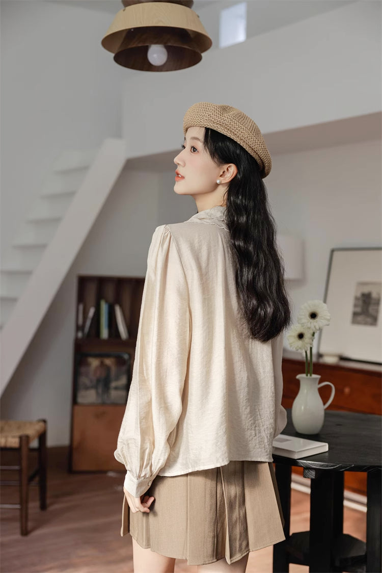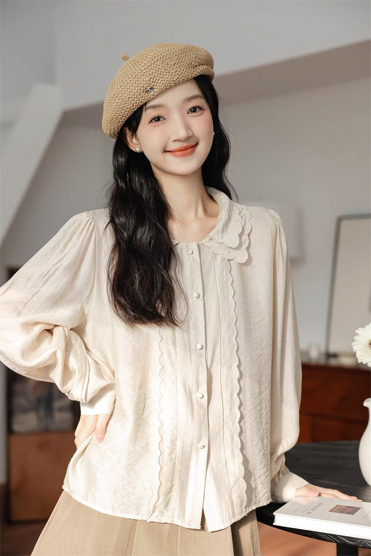Button up shirt with a double scalloped collar. scallop trim placket details and long blouson sleeves.